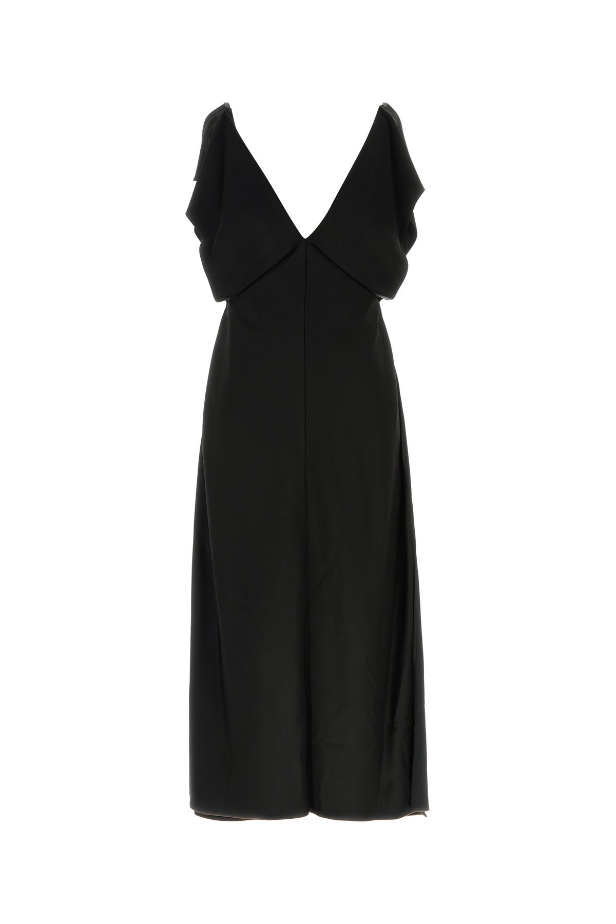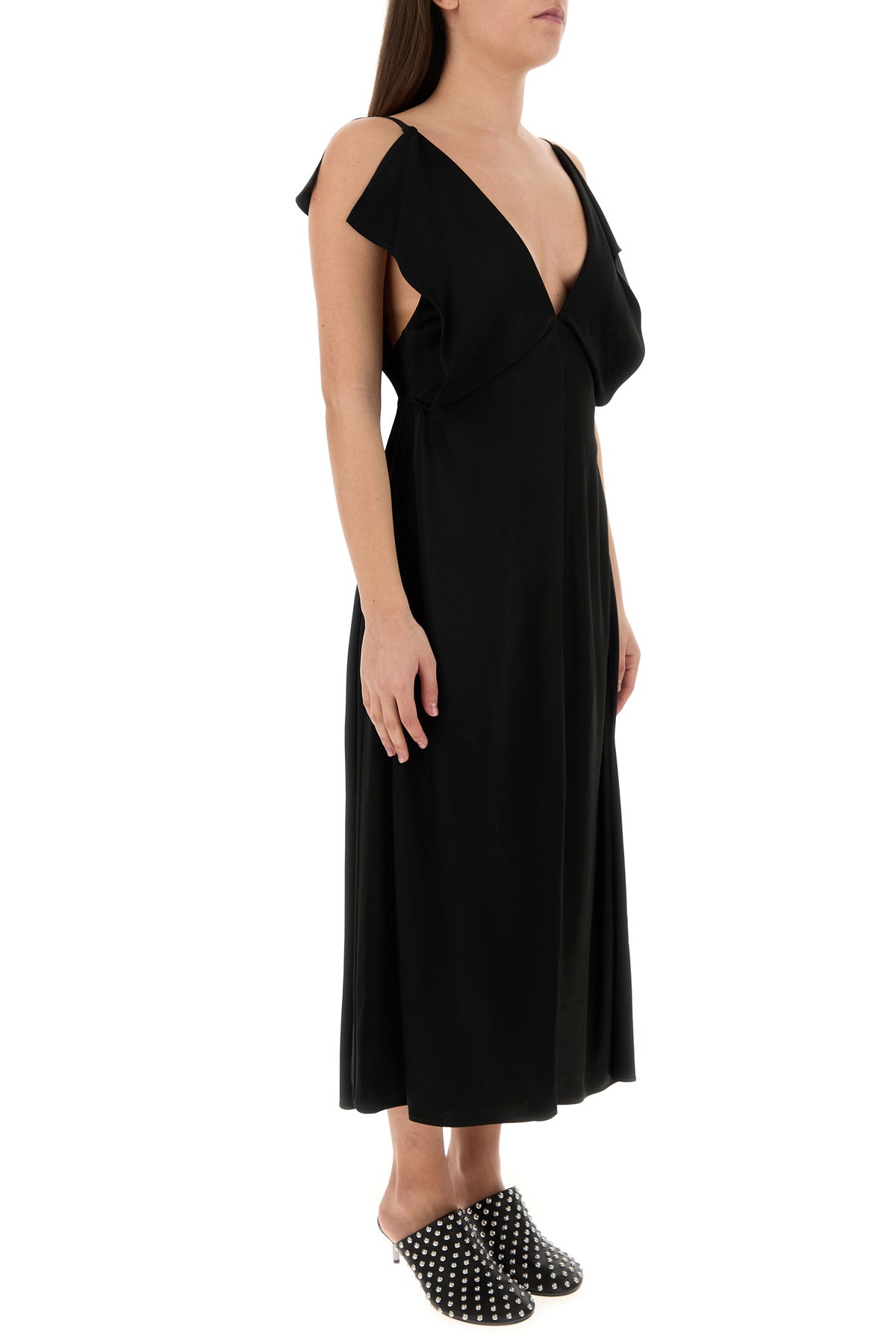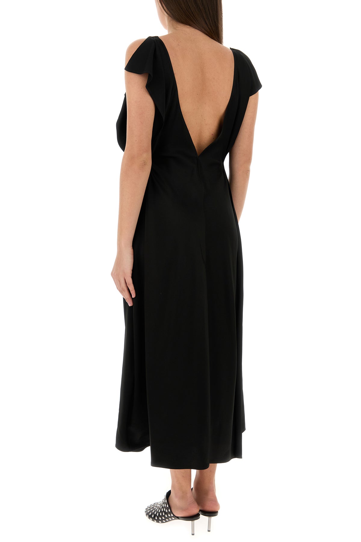 Dress realized in satin characterized by ruffles on the top.