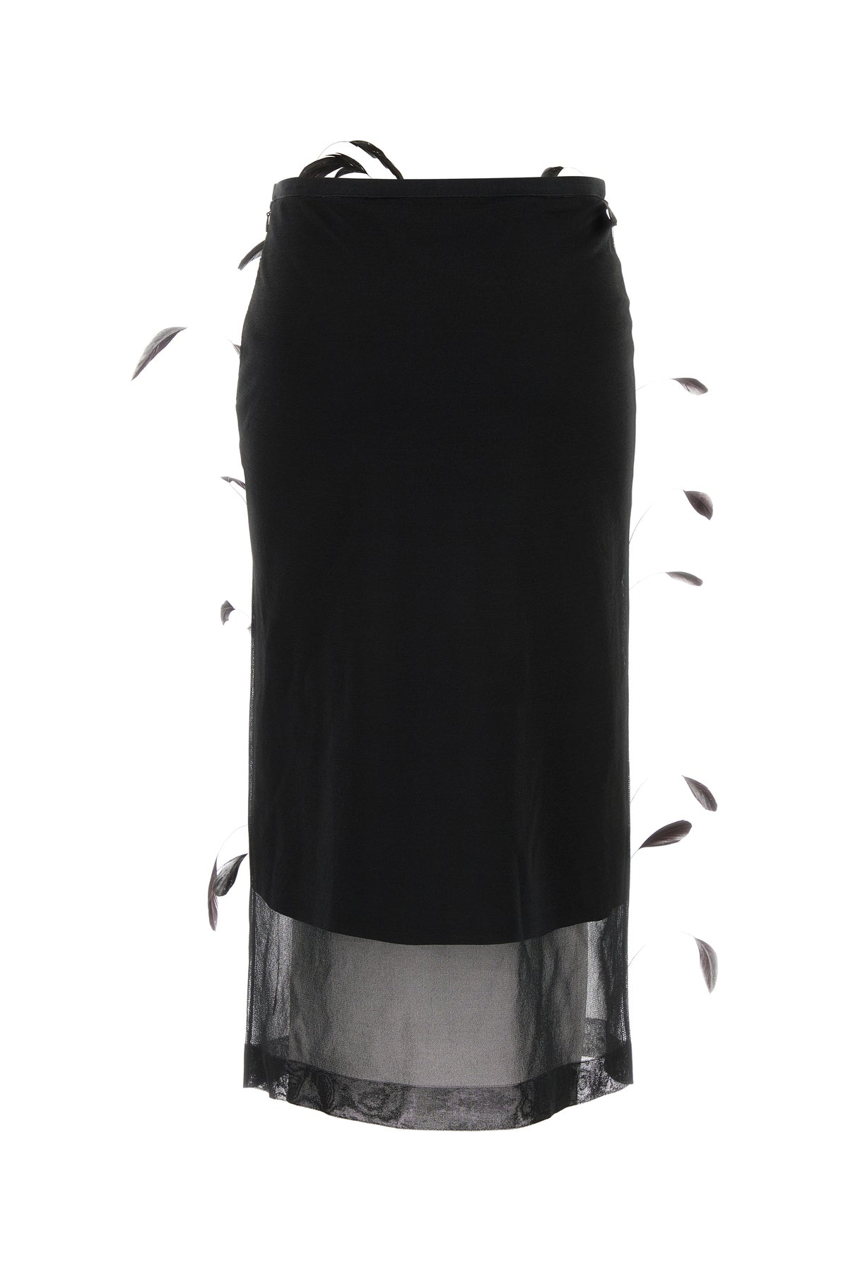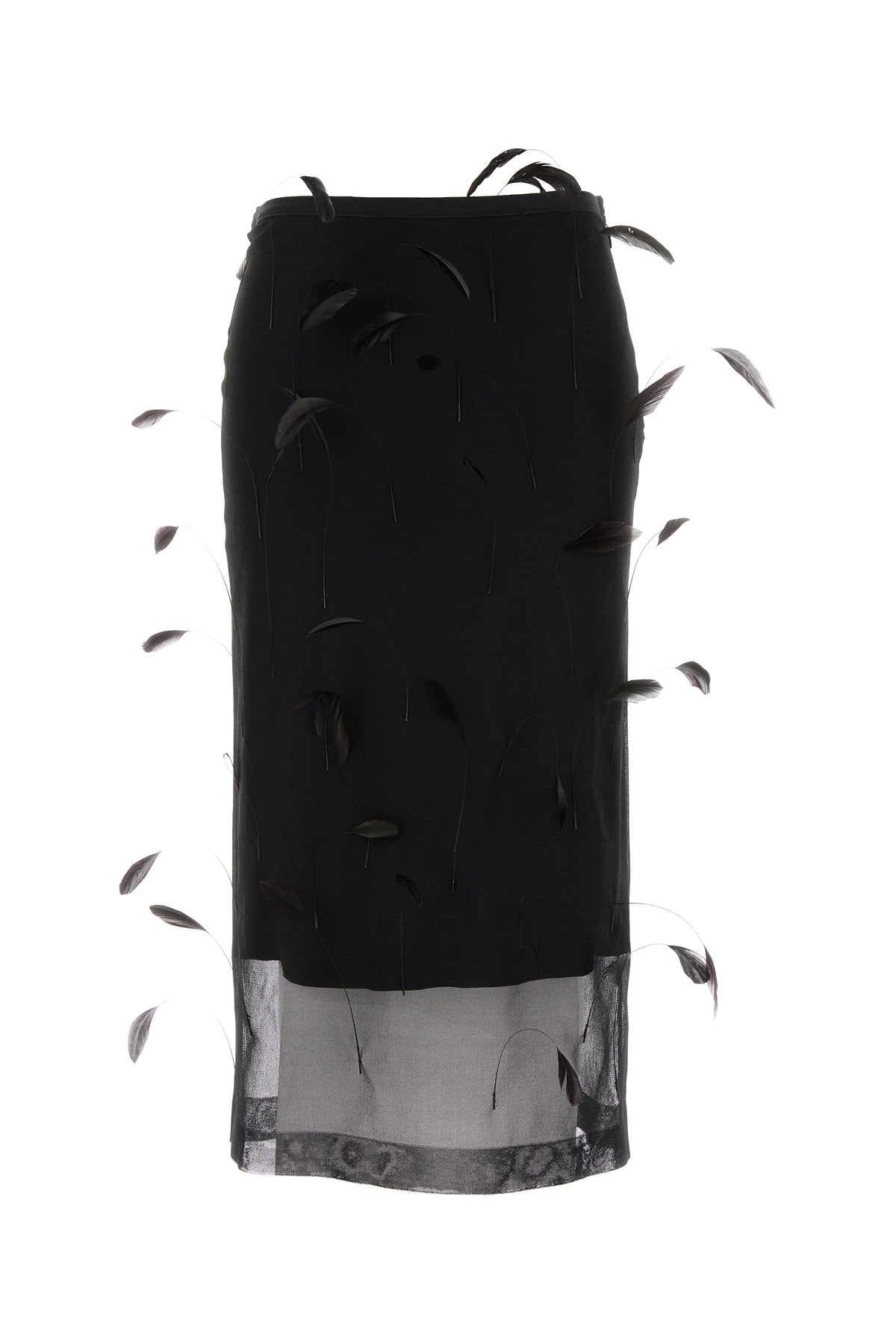 Fitted skirt realized in pure silk enriched by decorative feathers at the front.