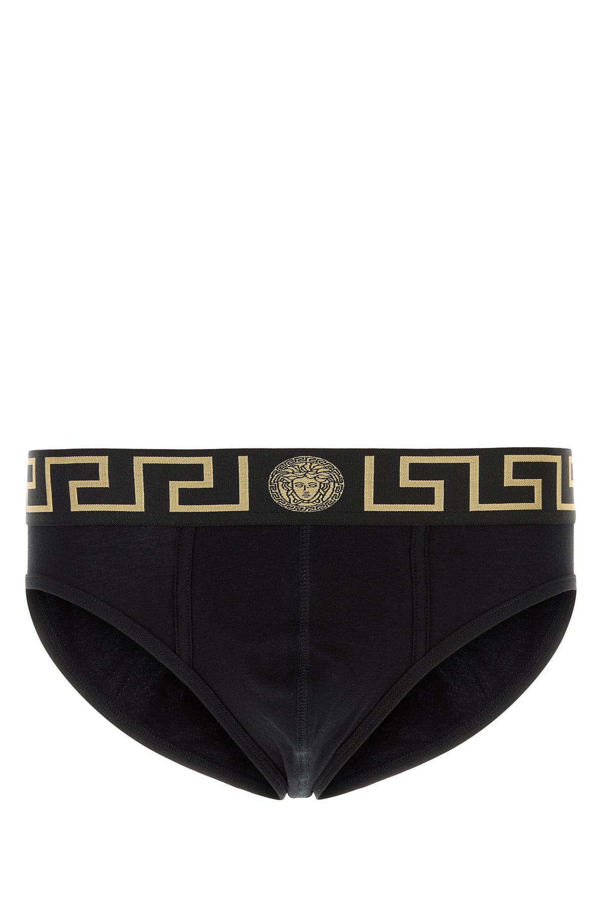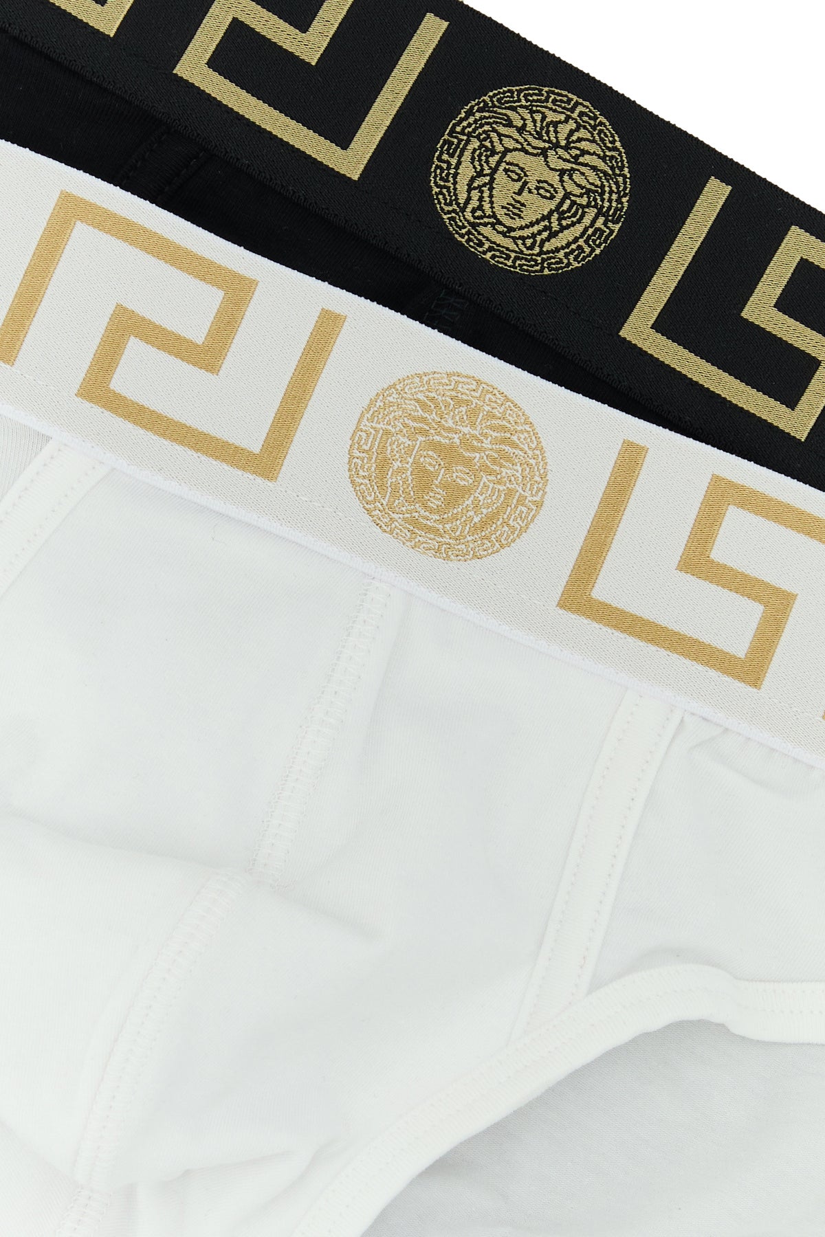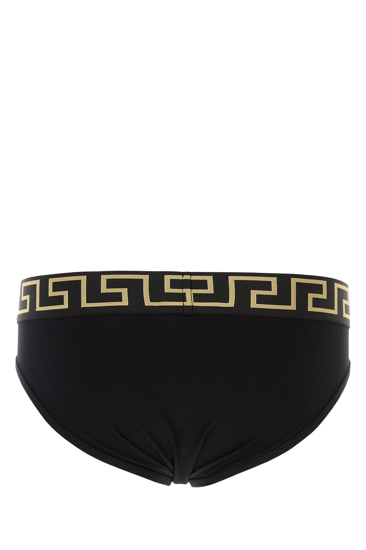 Two brief set realized in stretch cotton characterized by contrasting Greek Key embroidery and contrasting iconic Medusa Head embroidery on the elastic waist.