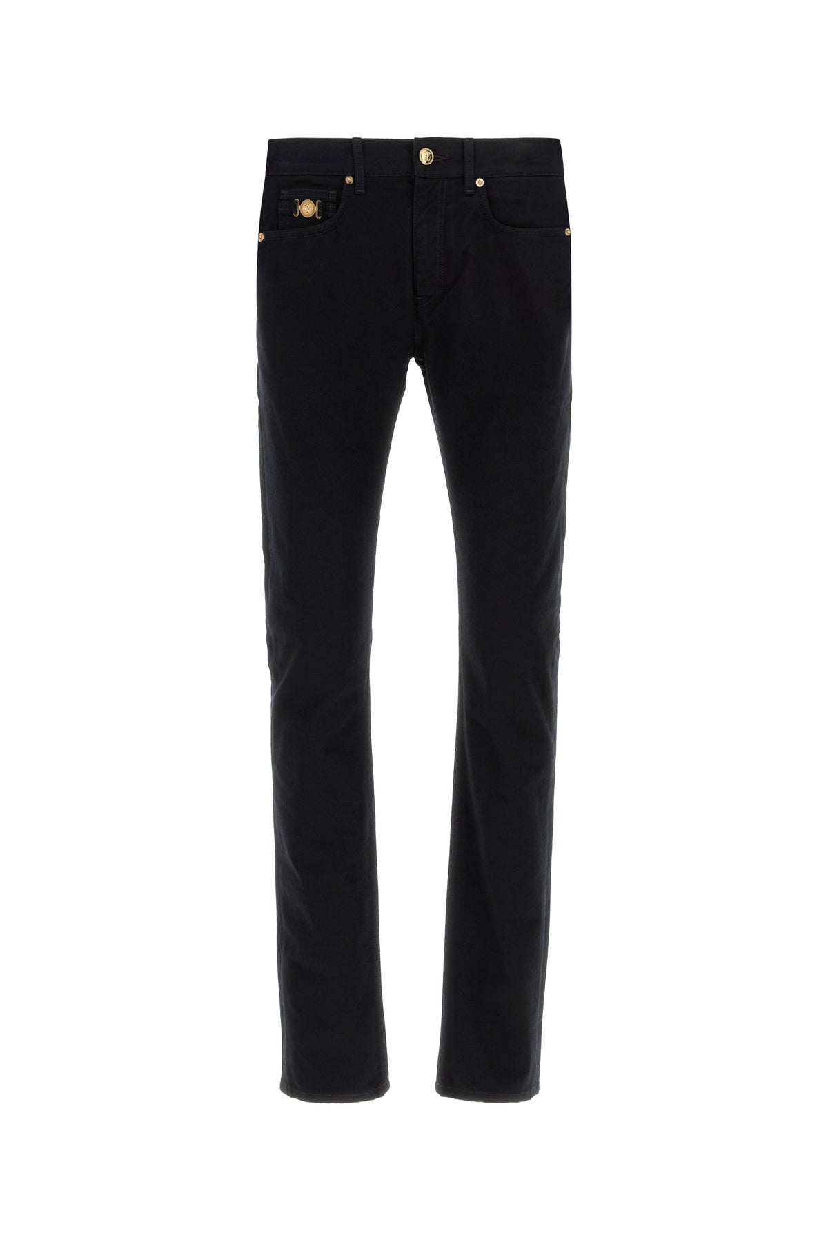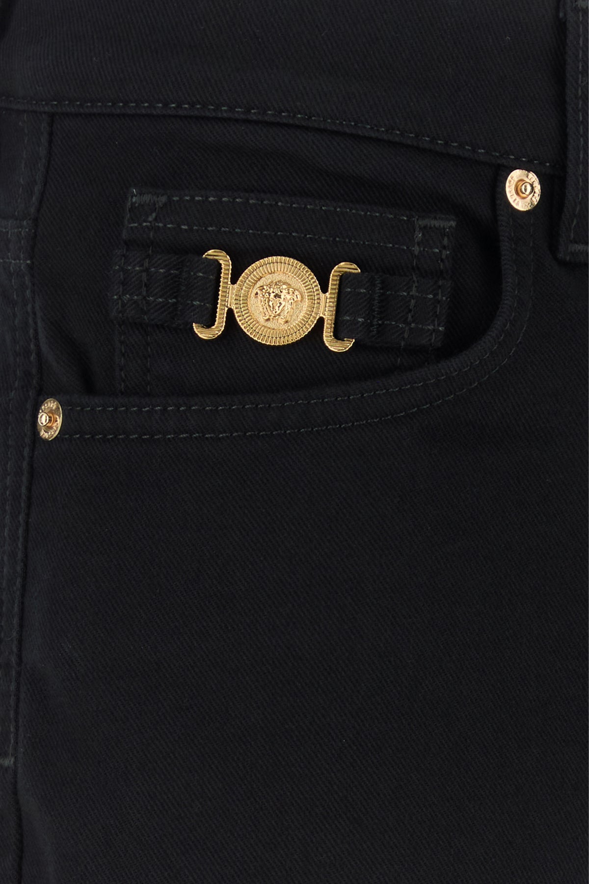 Jeans realized in stretch cotton denim enriched by Medusa meta metal at the front.
