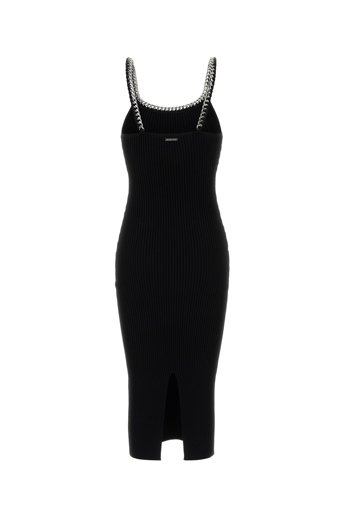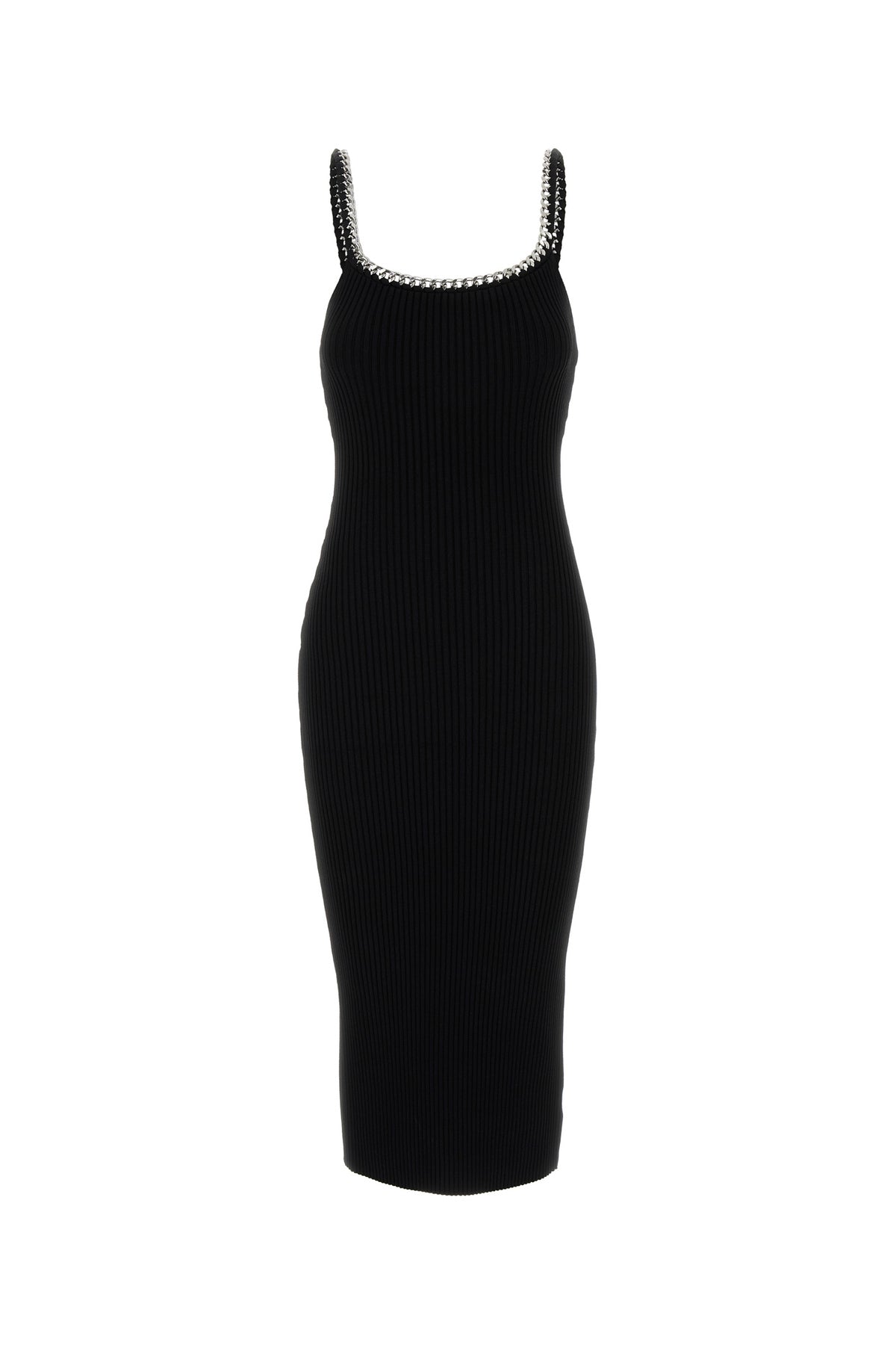 Fitted dress realized in stretch viscose blend enriched by metal chain on the round neckline.