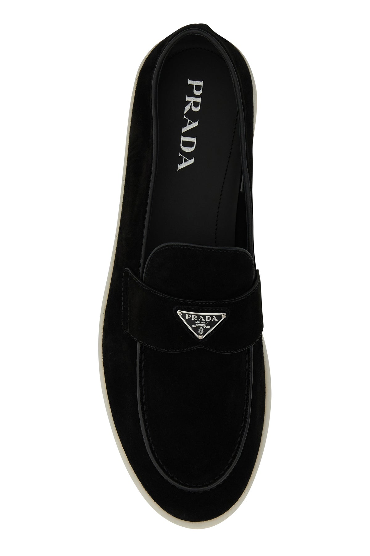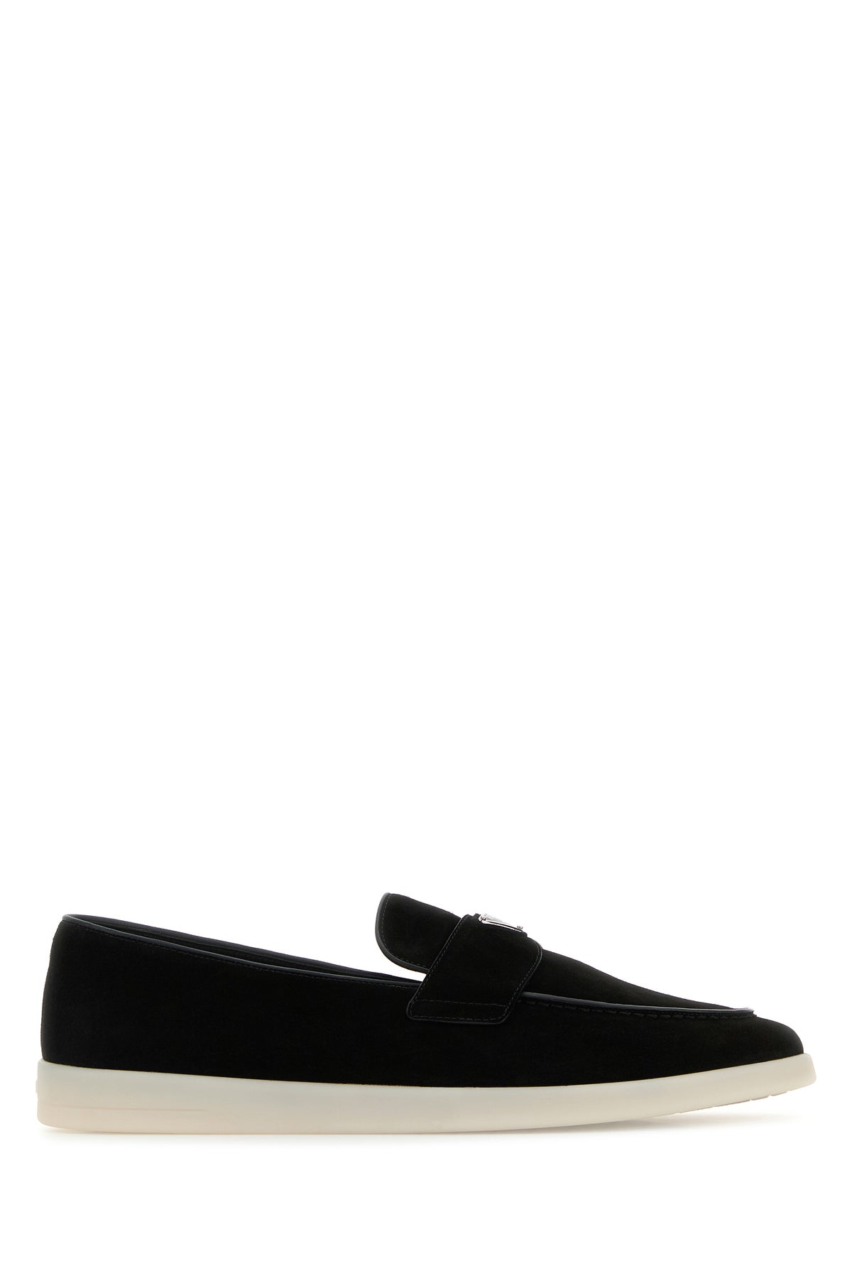 Loafers realized in suede characterized by logo in relief at the back enriched by iconic logoed metal triangle on the vamp.