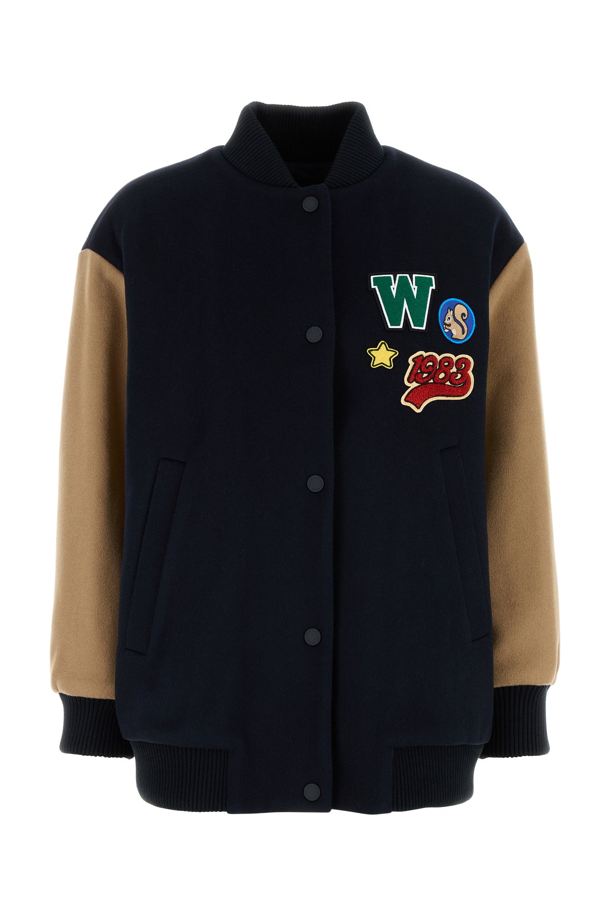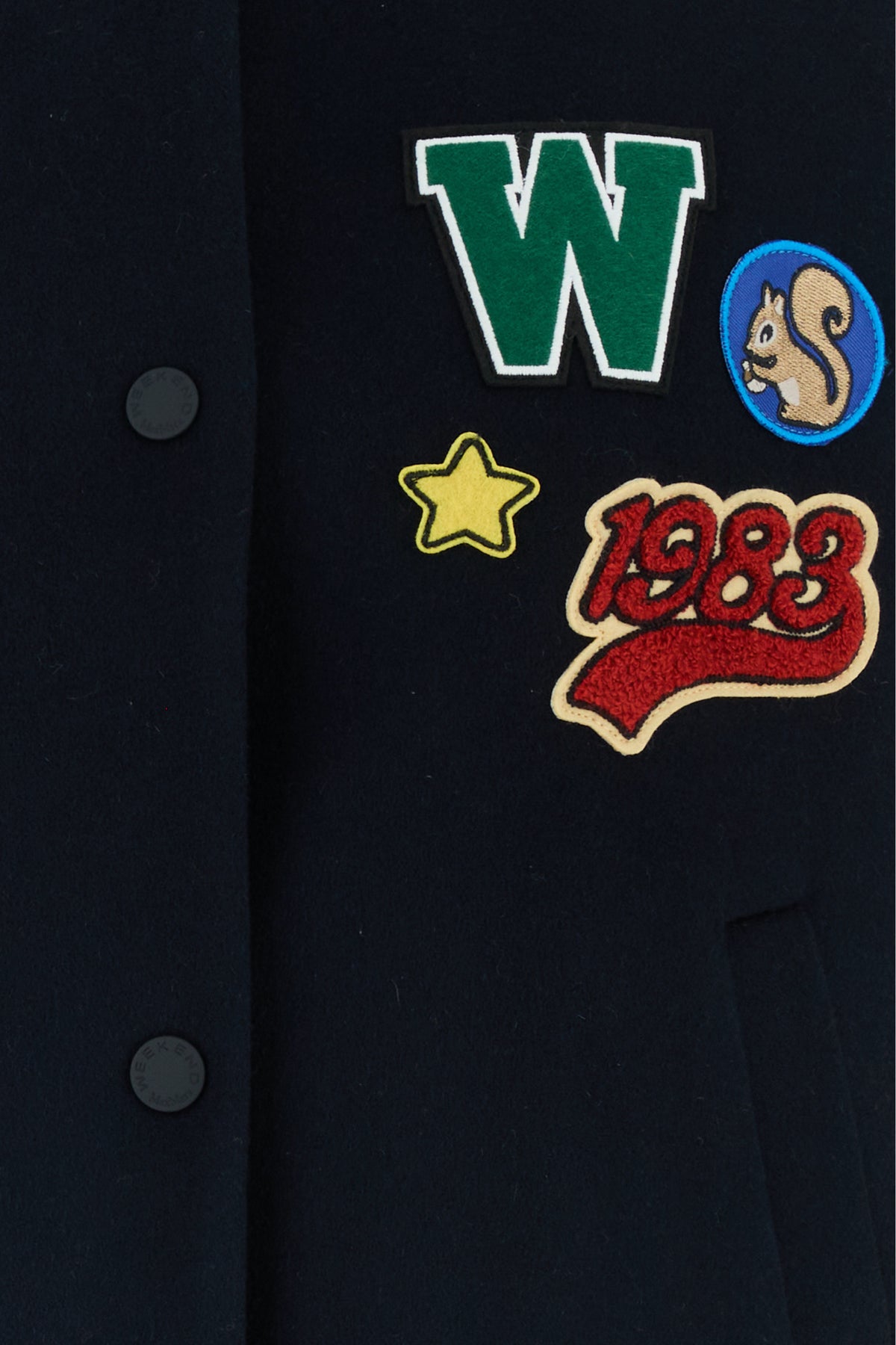 Bomber jacket realized in wool blend enriched by peculiar patched on the chest.