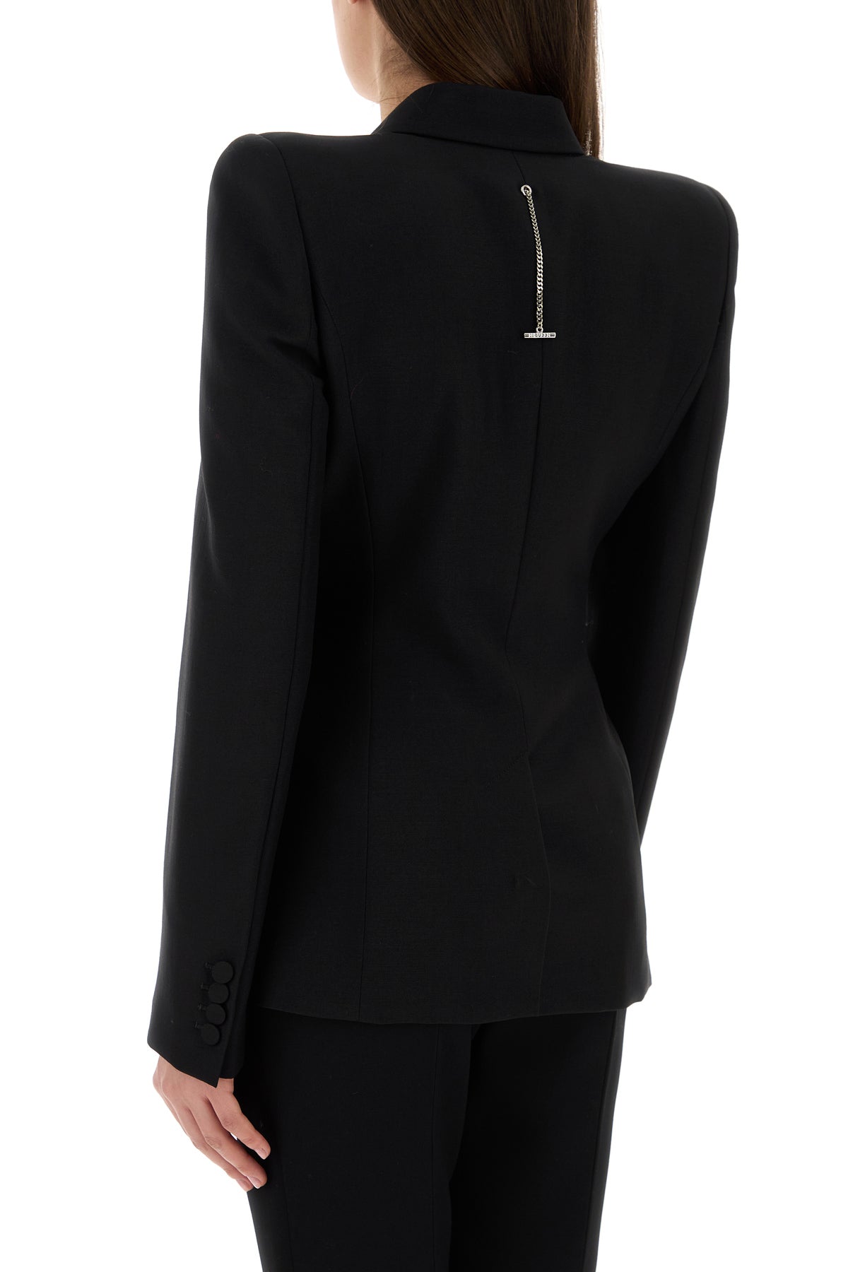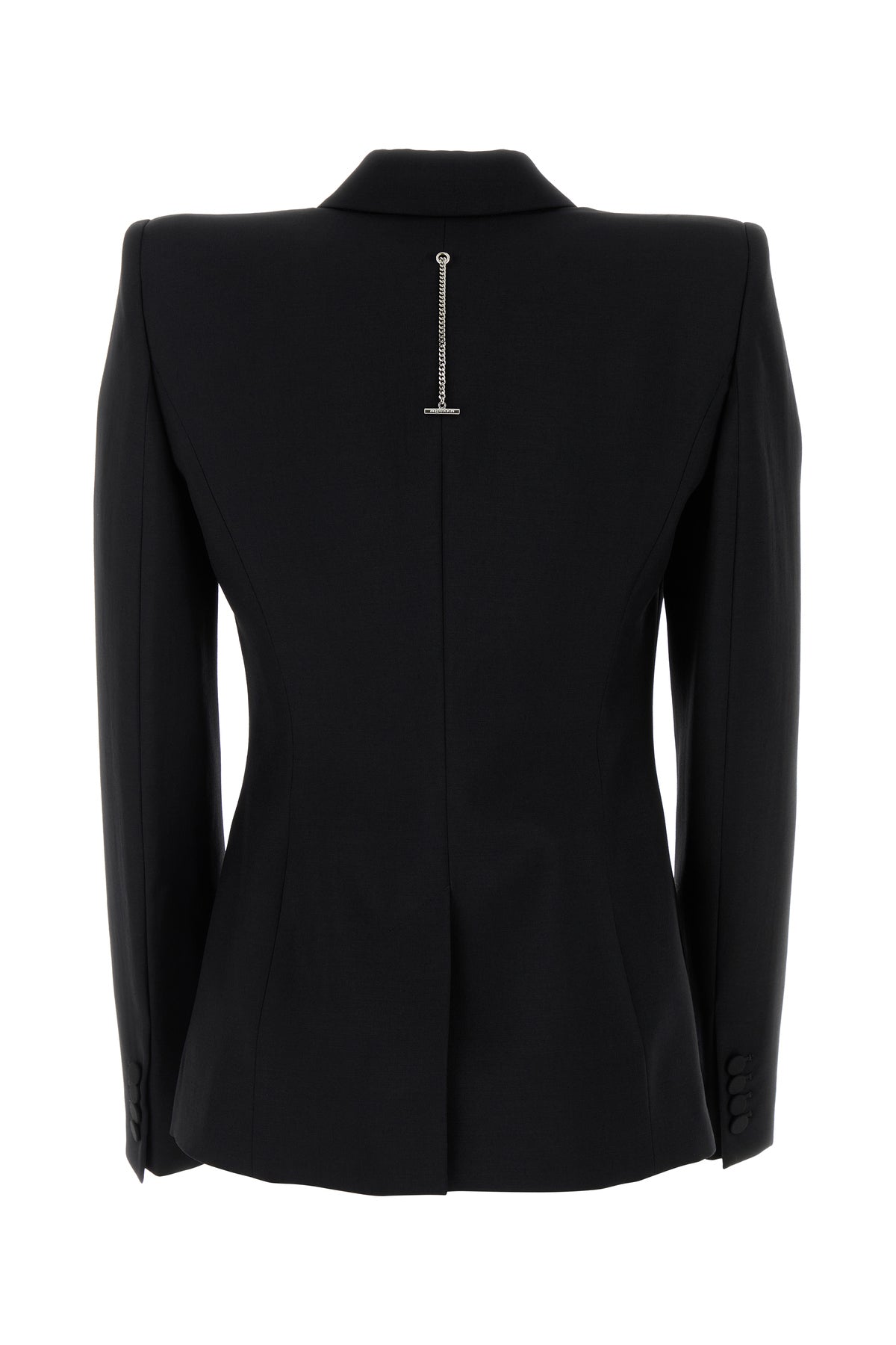 Blazer realized in wool and mohair enriched by T metal chain at the back.