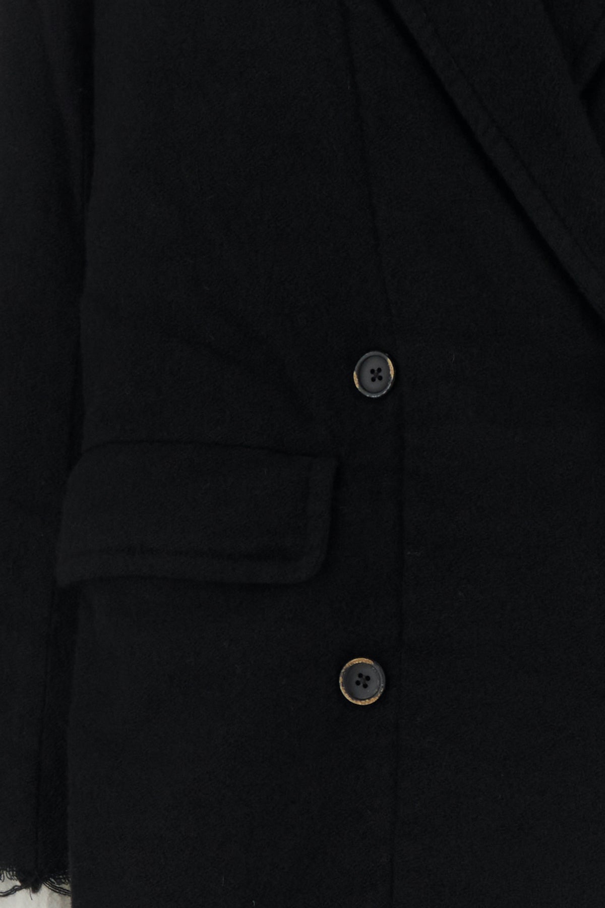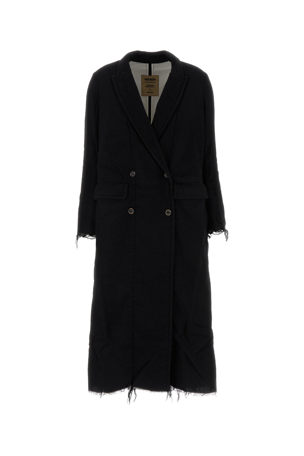 Coat realized in wool blend characterized by raw-cut effect cuffs and hemline.