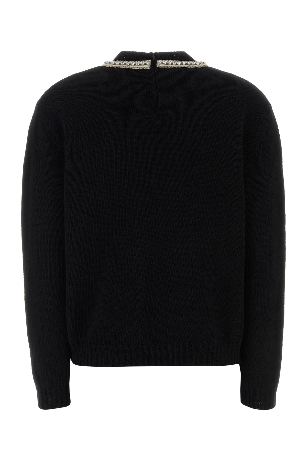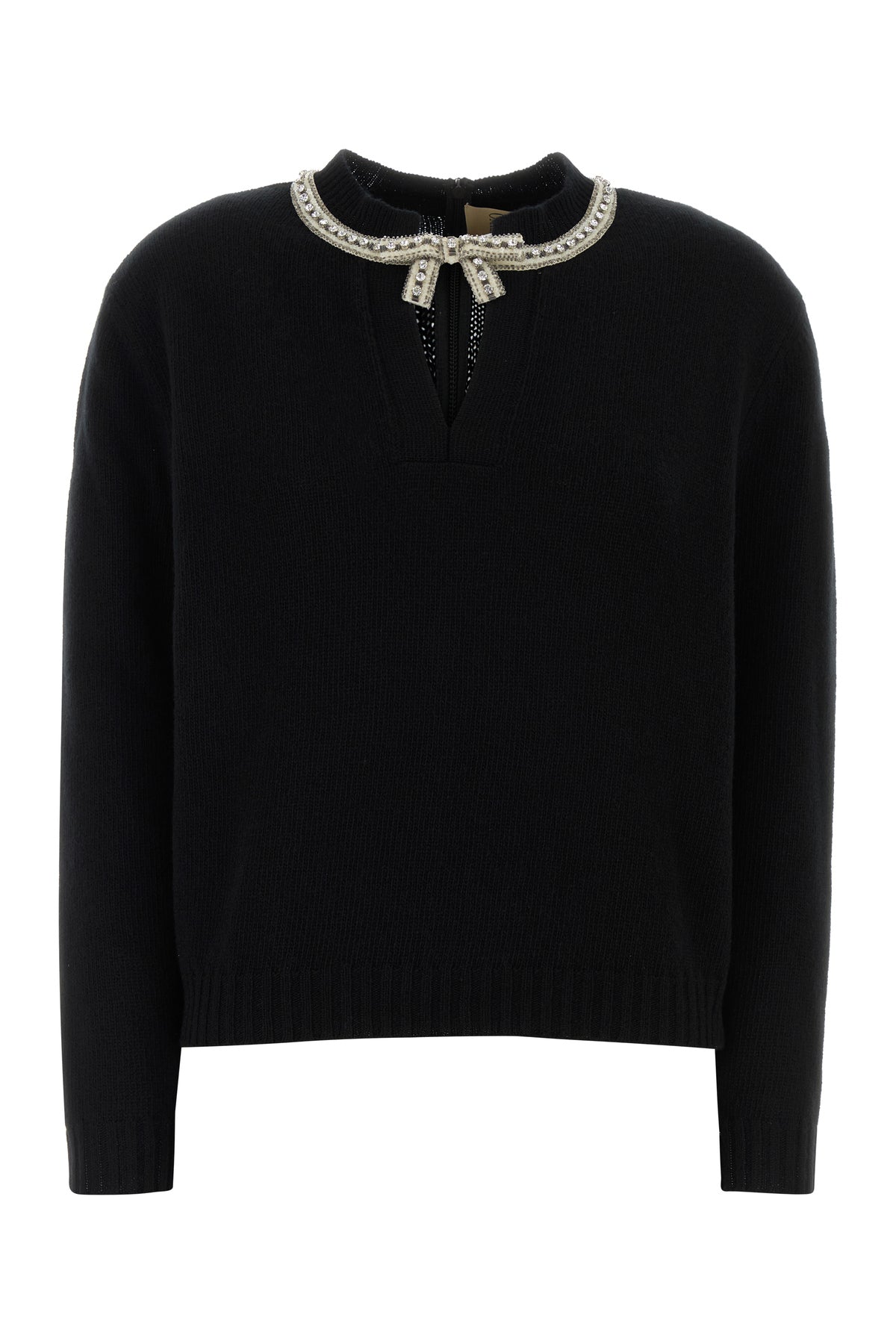Sweater realized in pure virgin wool enriched by decorative bow with rhinestones on the crew-neck.