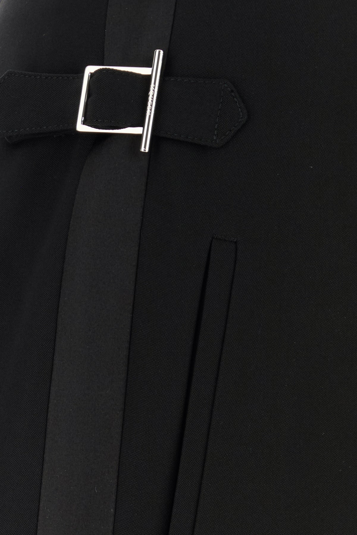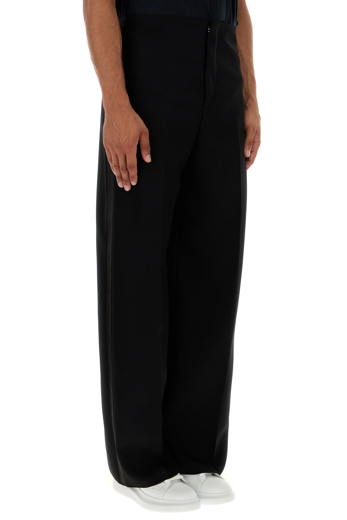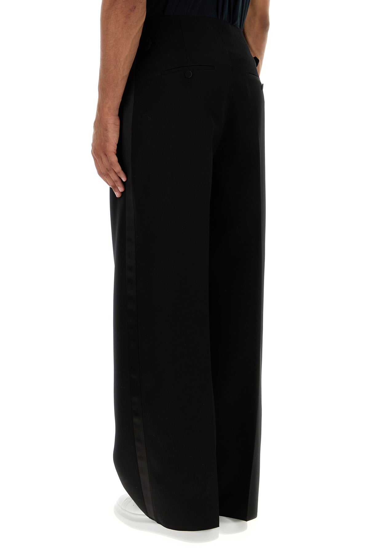 Wide-leg pant realized in pure wool with tonal satin inserts on the sides.