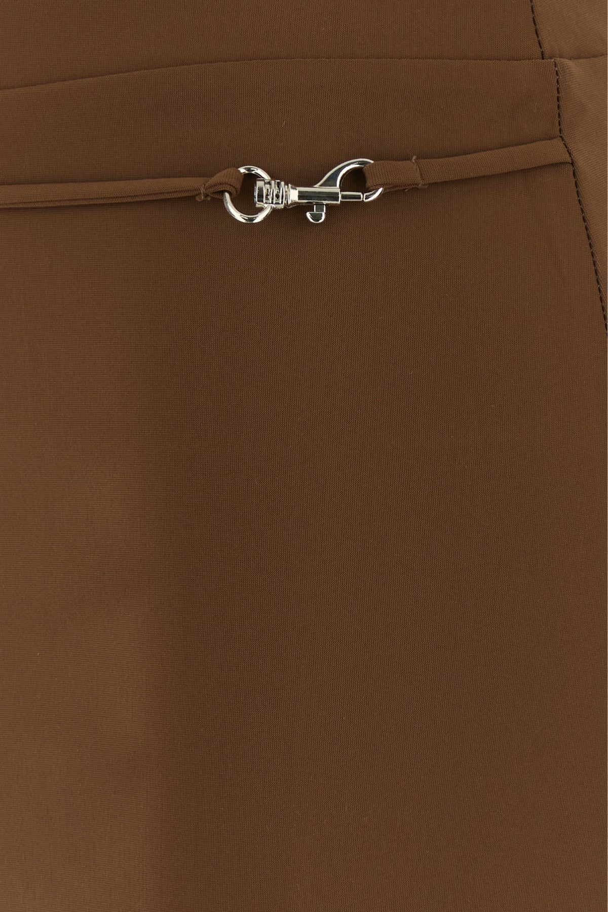 Mini skirt realized in stretch nylon enriched by strap with metal hook at the front.