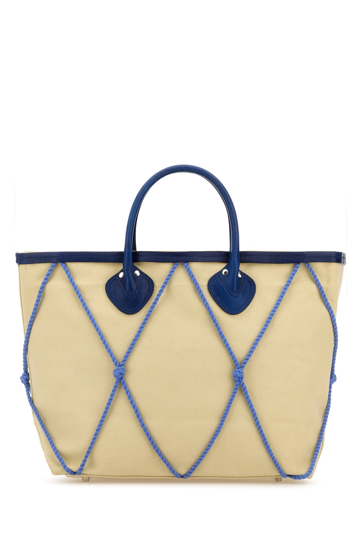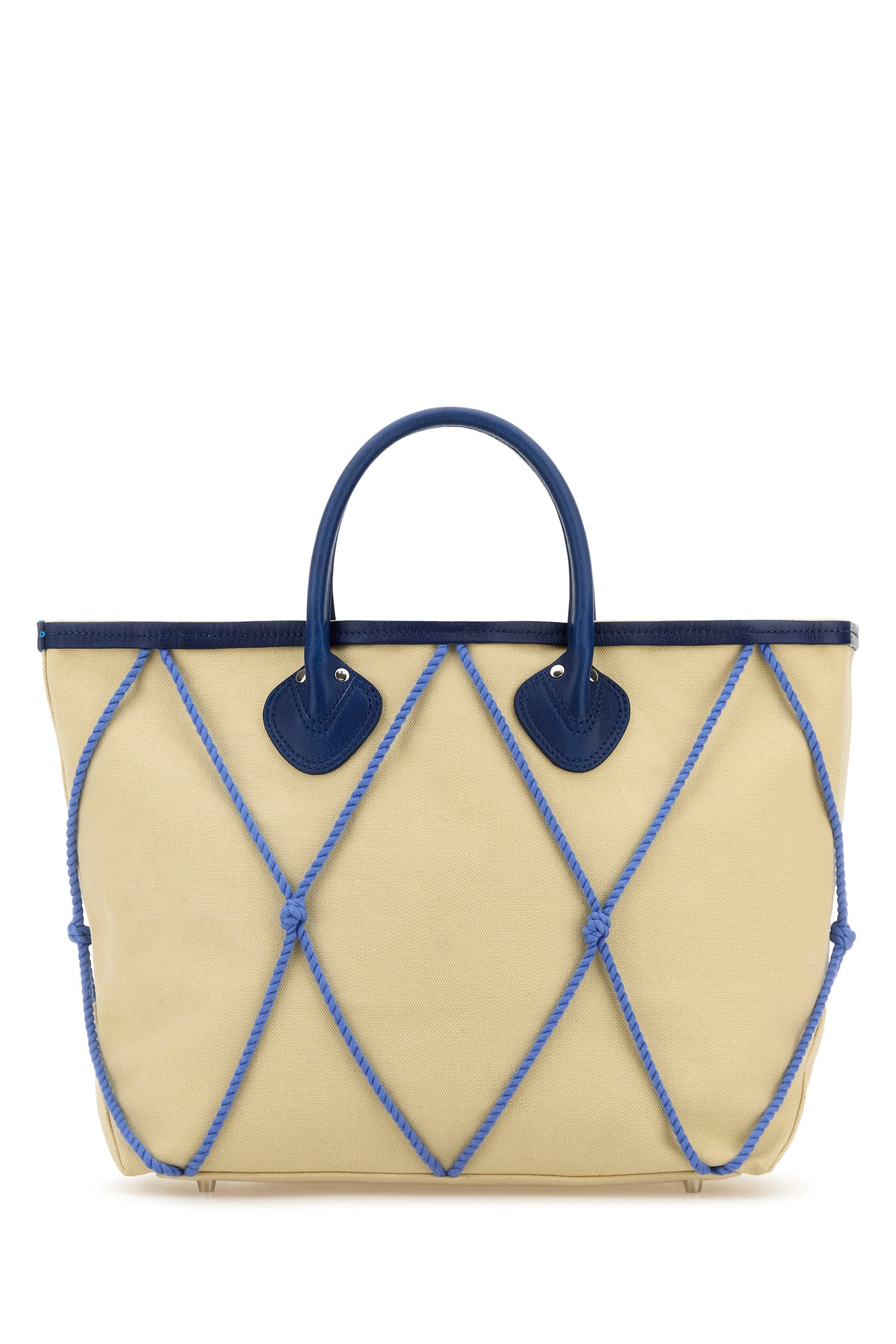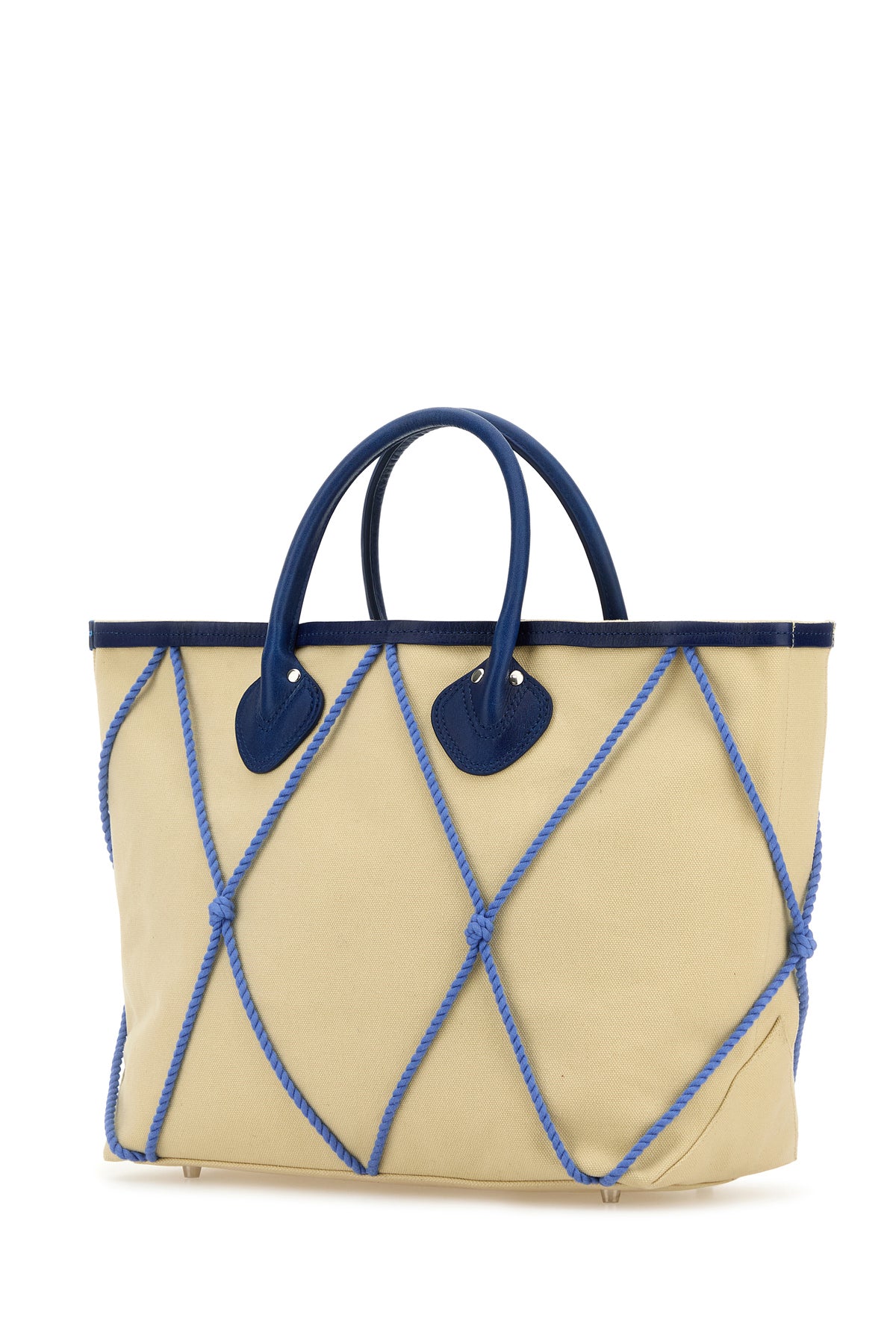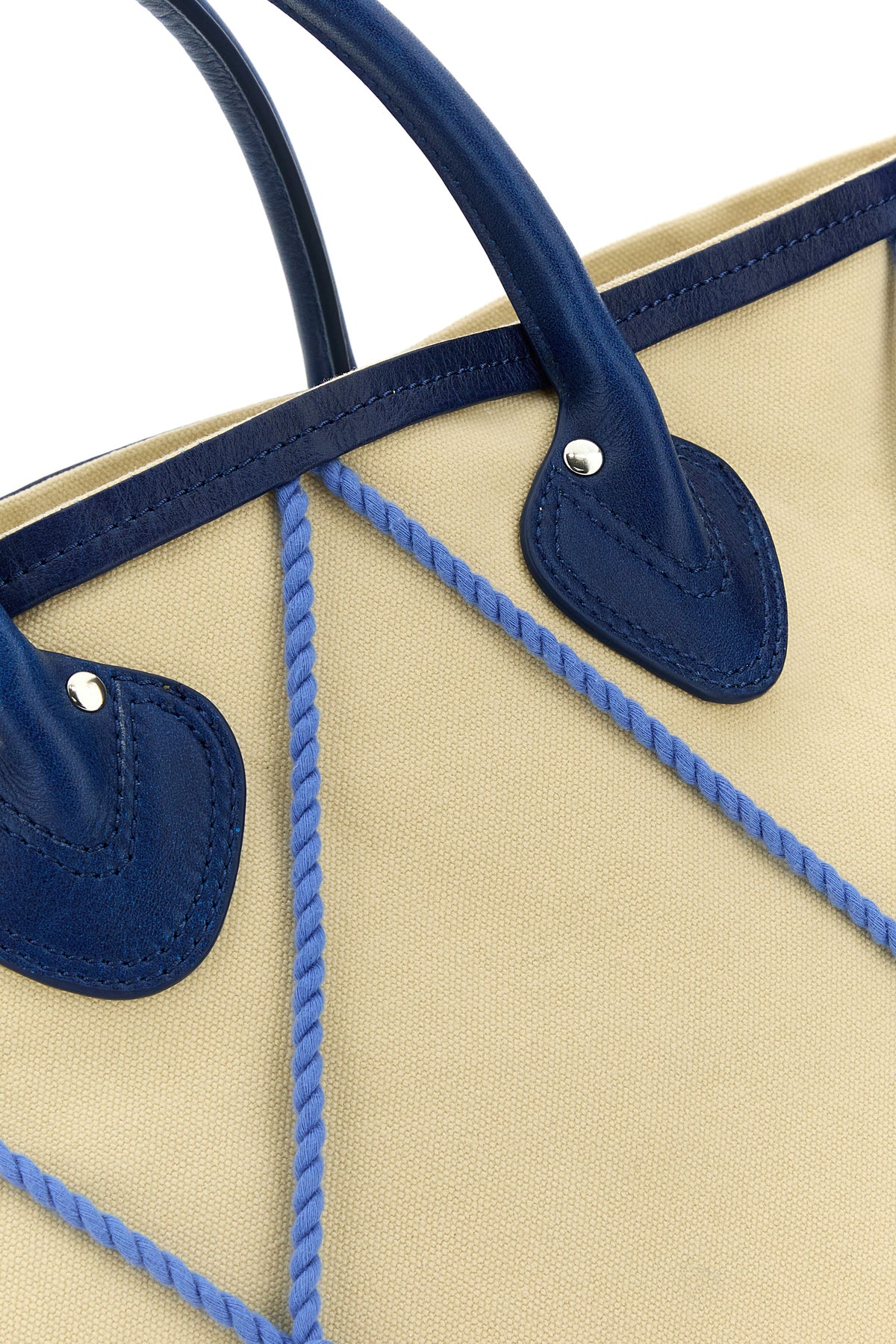 Shopping bag realized in pure cotton canvas with contrasting bovine leather trimming at the top enriched by contrasting peculiar embellishment at the front and at the back.