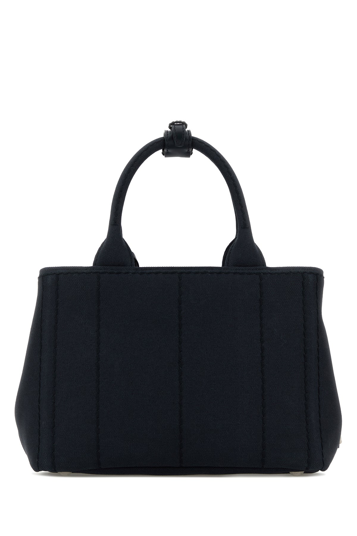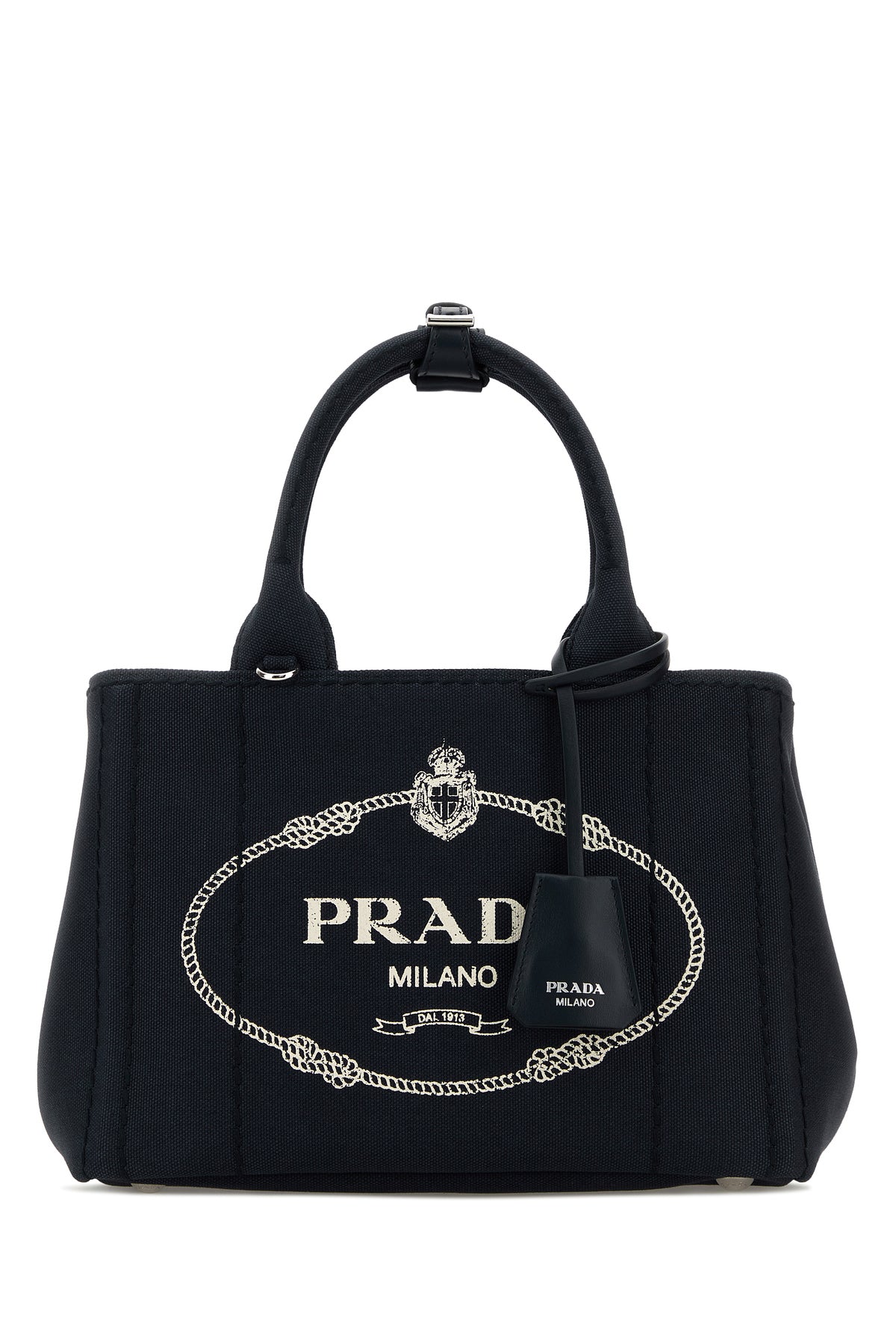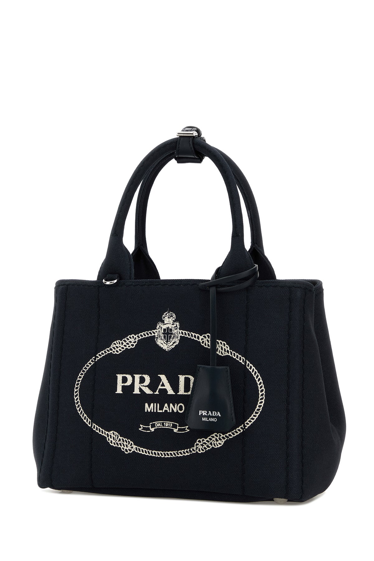 Handbag realized in canvas characterized by printed logo at the front enriched by iconic logoed metal triangle on the side.