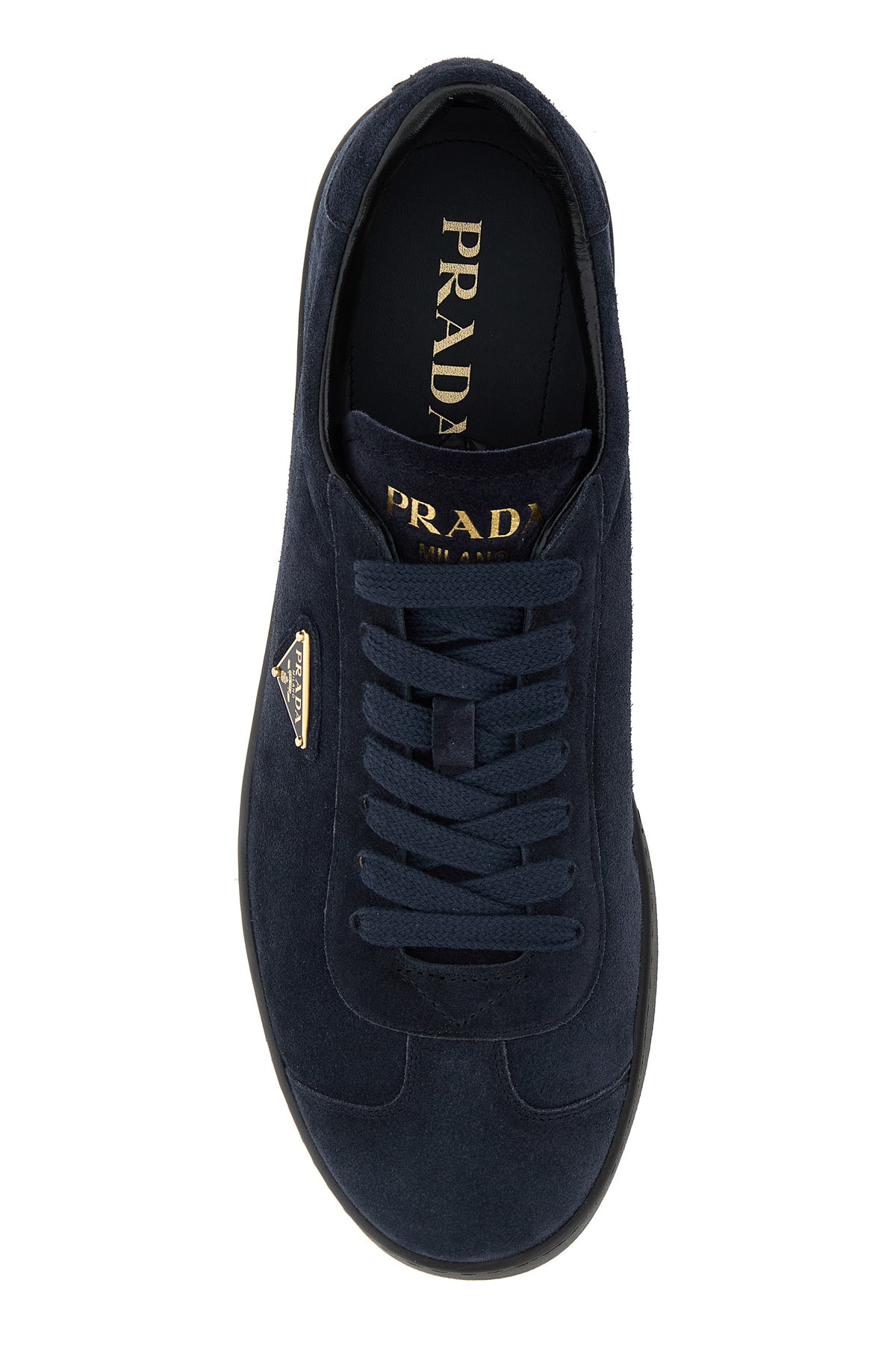 Sneakers realized in suede characterized by embossed logo on the heel and logo in relief at the back enriched by metal iconic logoed triangle on the side.