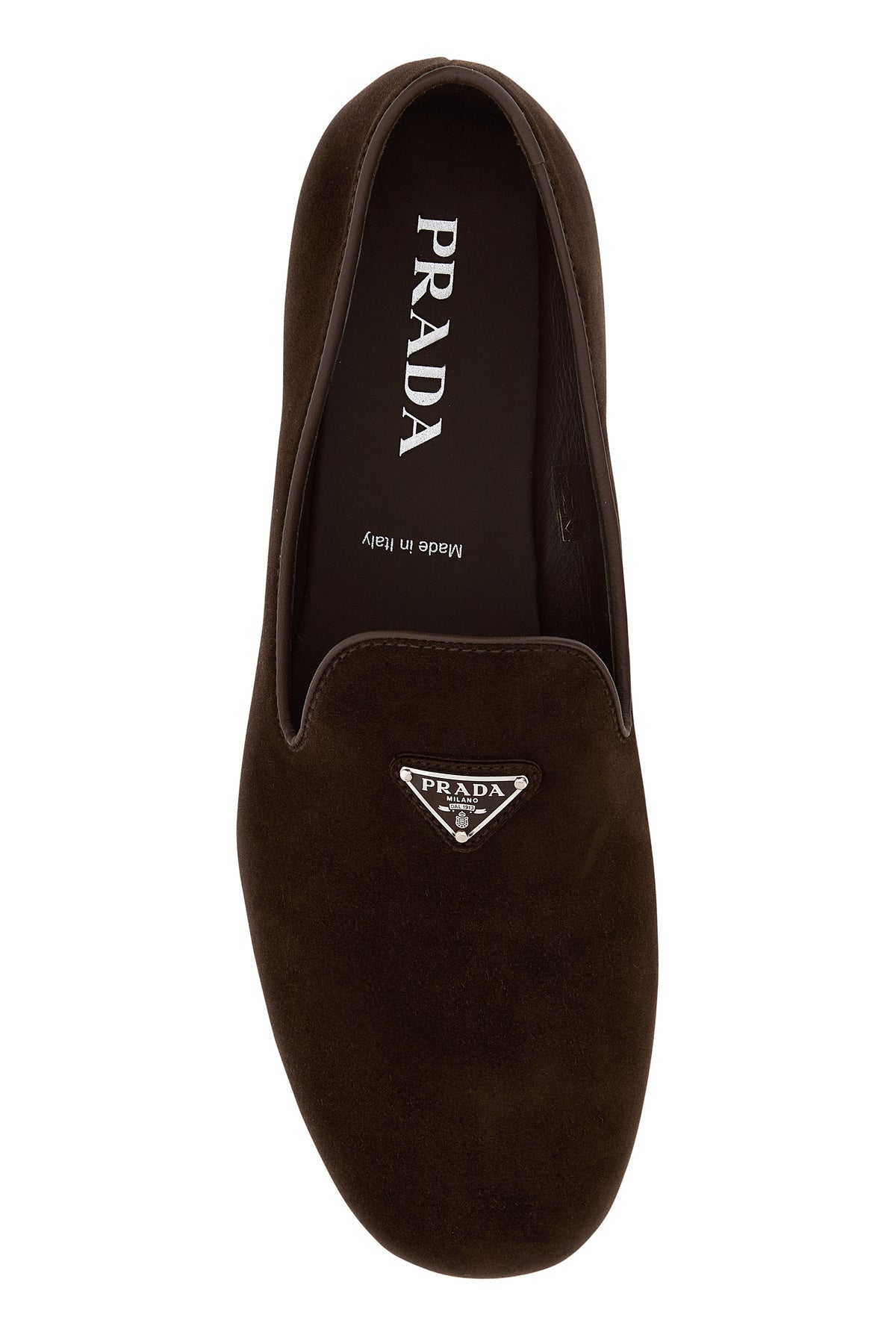 Loafers realized in suede enriched by iconic metal logoed triangle at the front.