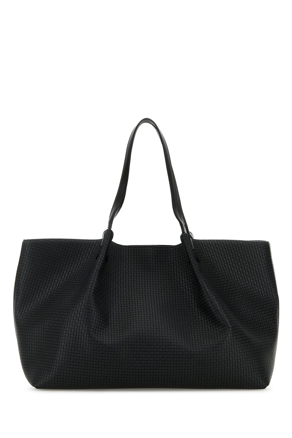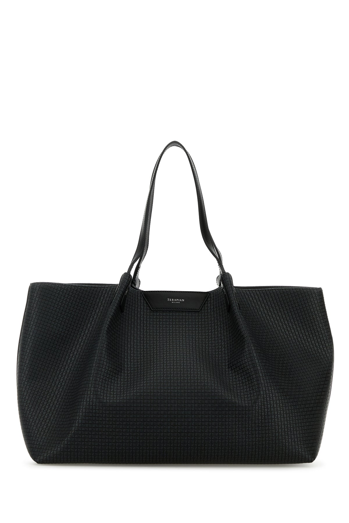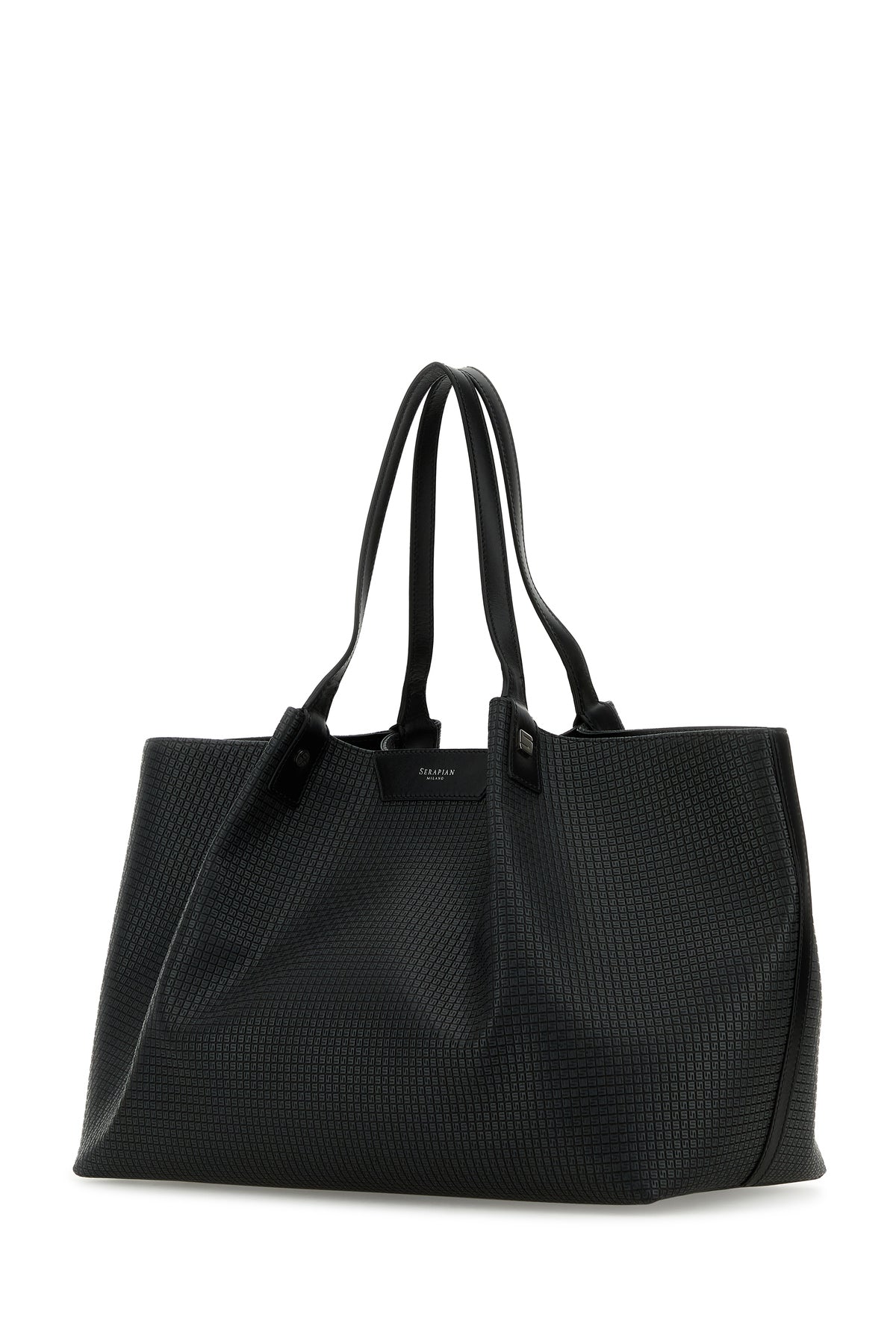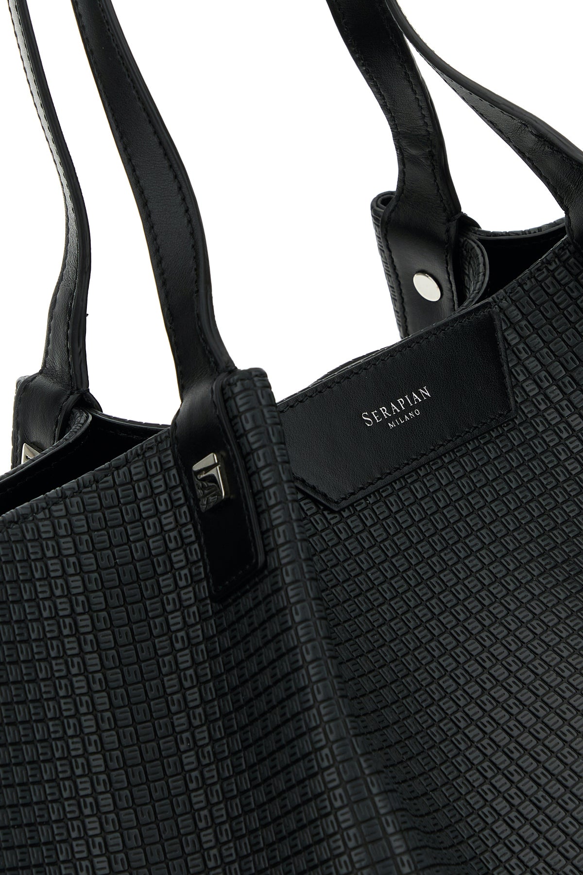 Shopping bag realized in peculiar logoed embossed motif synthetic leather characterized by laminated printed logo at the front.