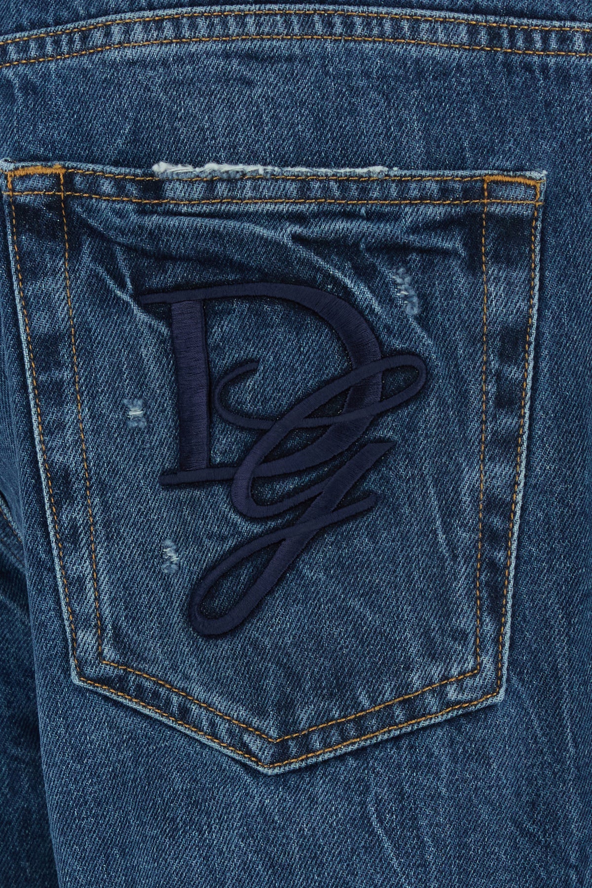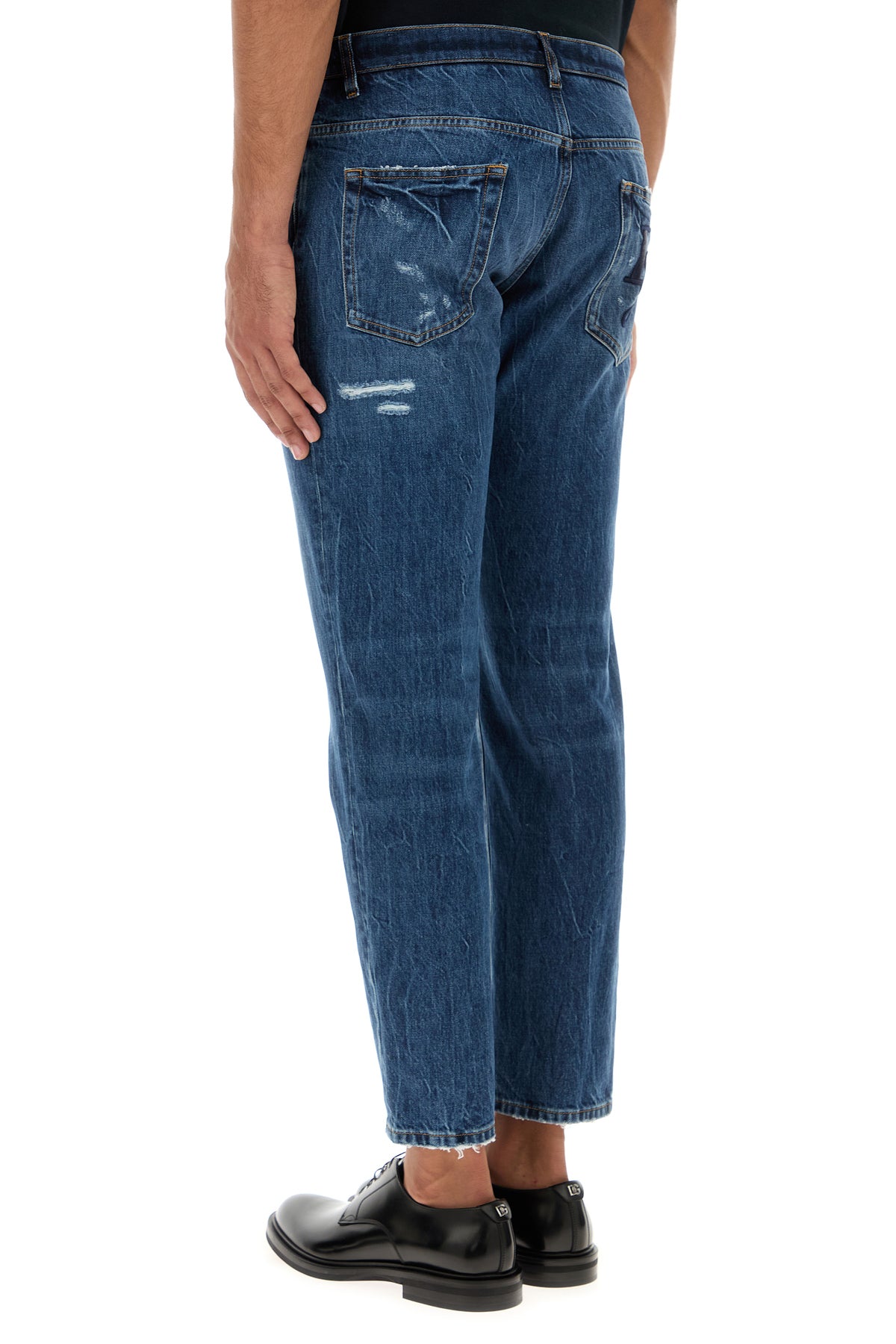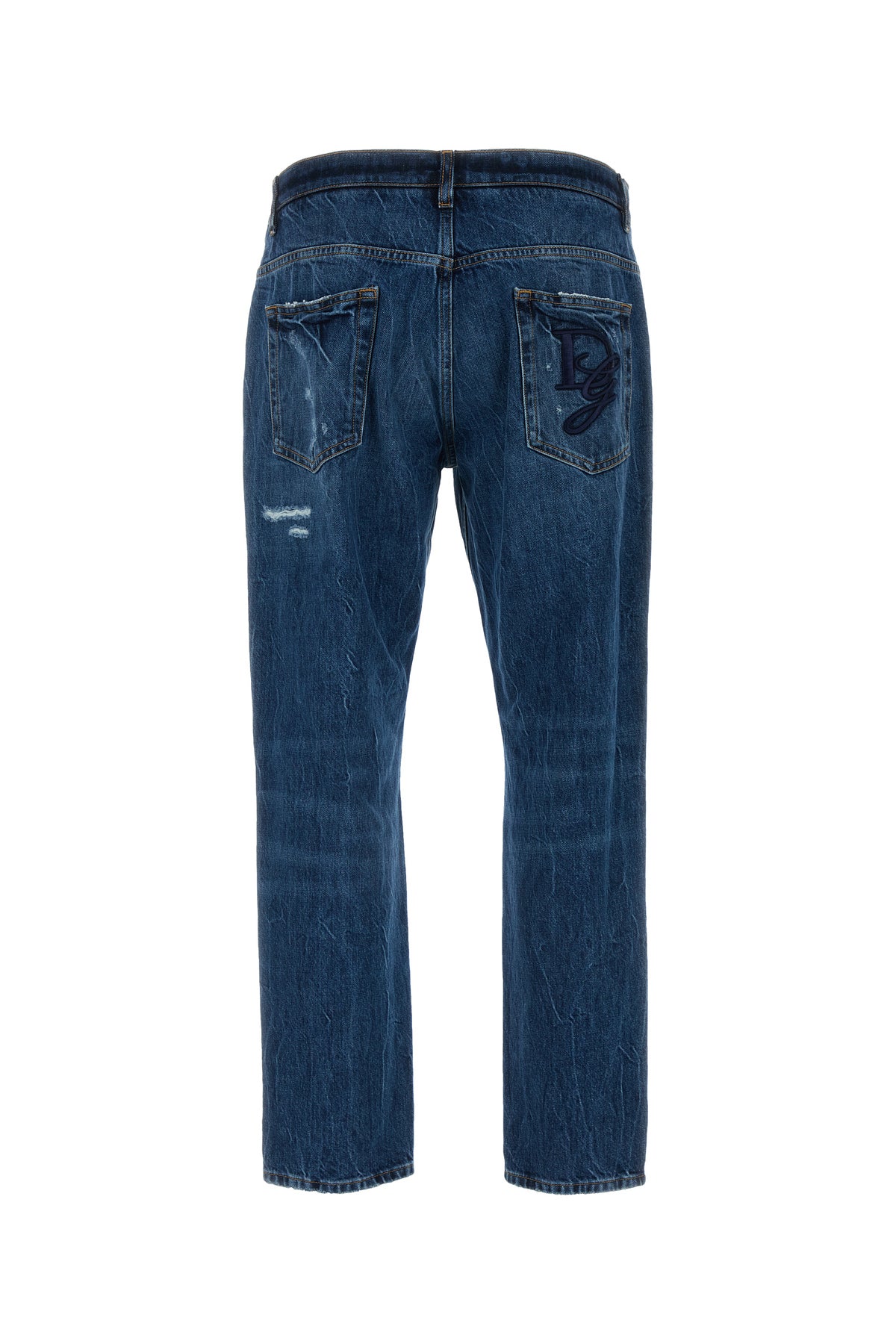 Regular jeans realized in stonewashed and distressed pure cotton denim characterized by repaired rips and tonal DG embroidery at the back.