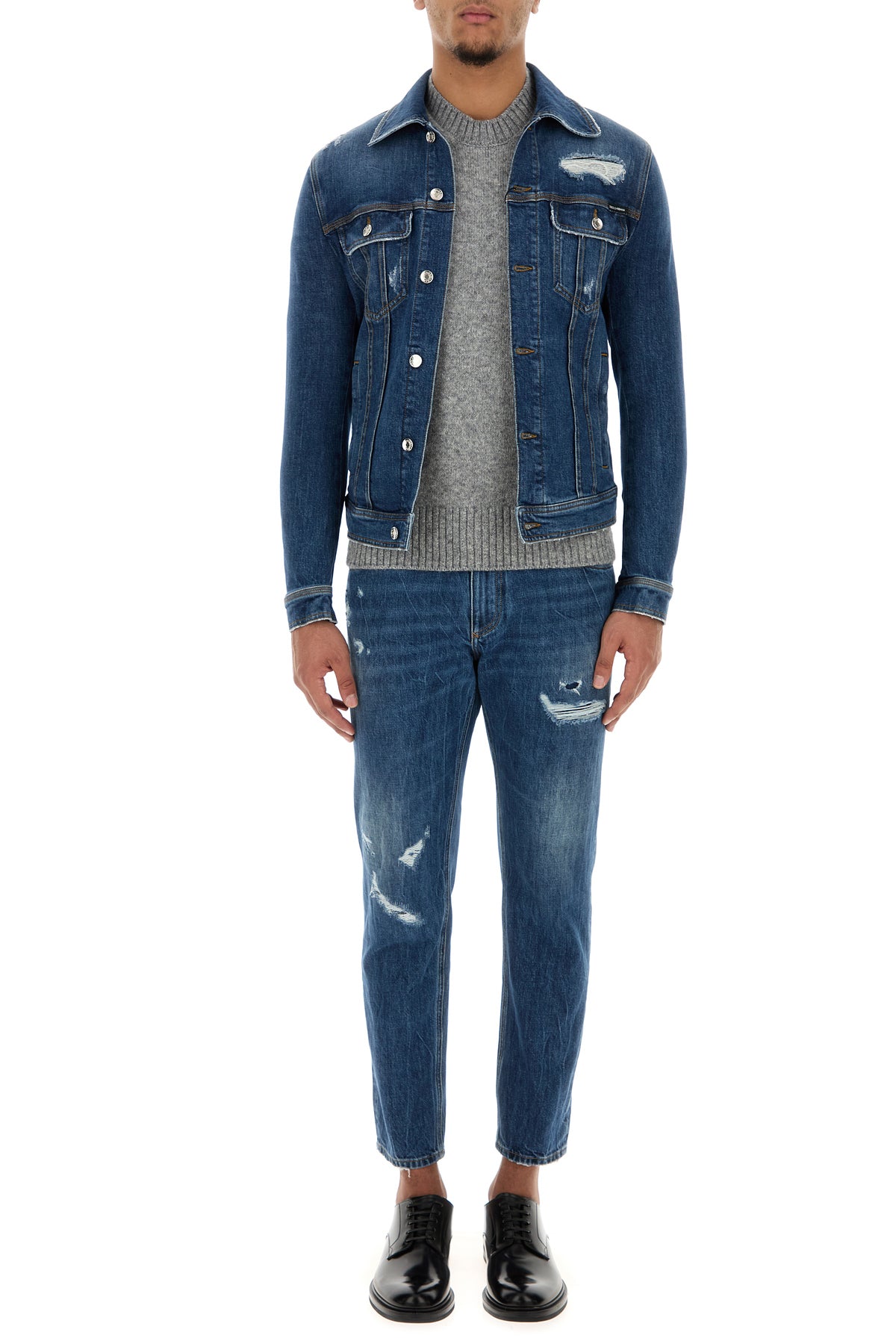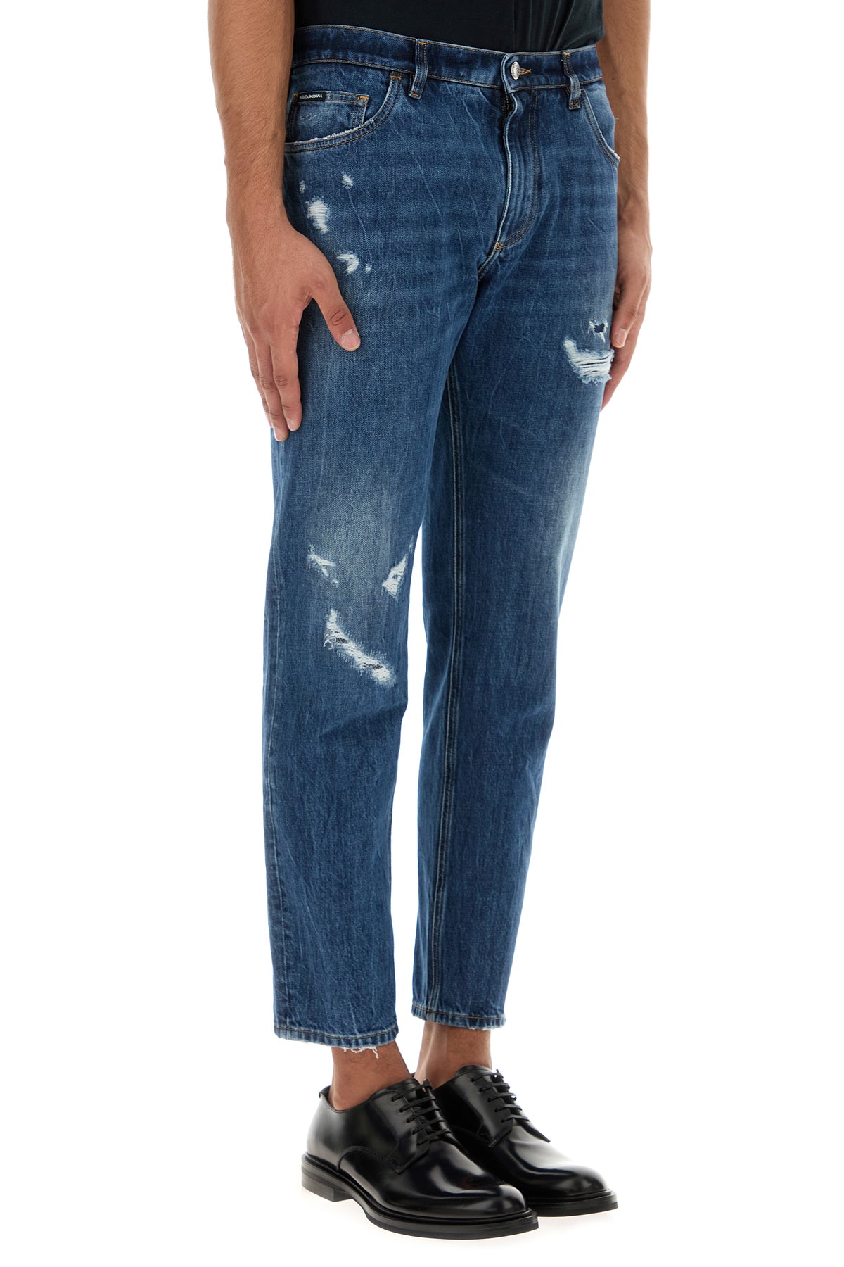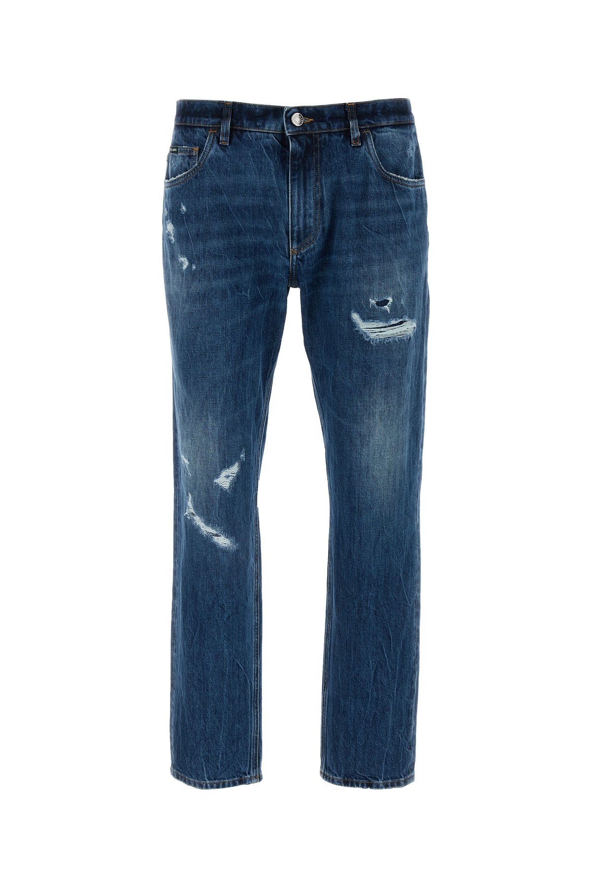 Regular jeans realized in stonewashed and distressed pure cotton denim characterized by repaired rips and tonal DG embroidery at the back.