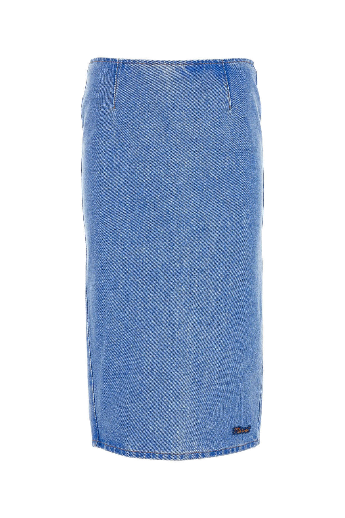 Skirt realized in pure cotton denim enriched by contrasting logoed patch on the hemline.