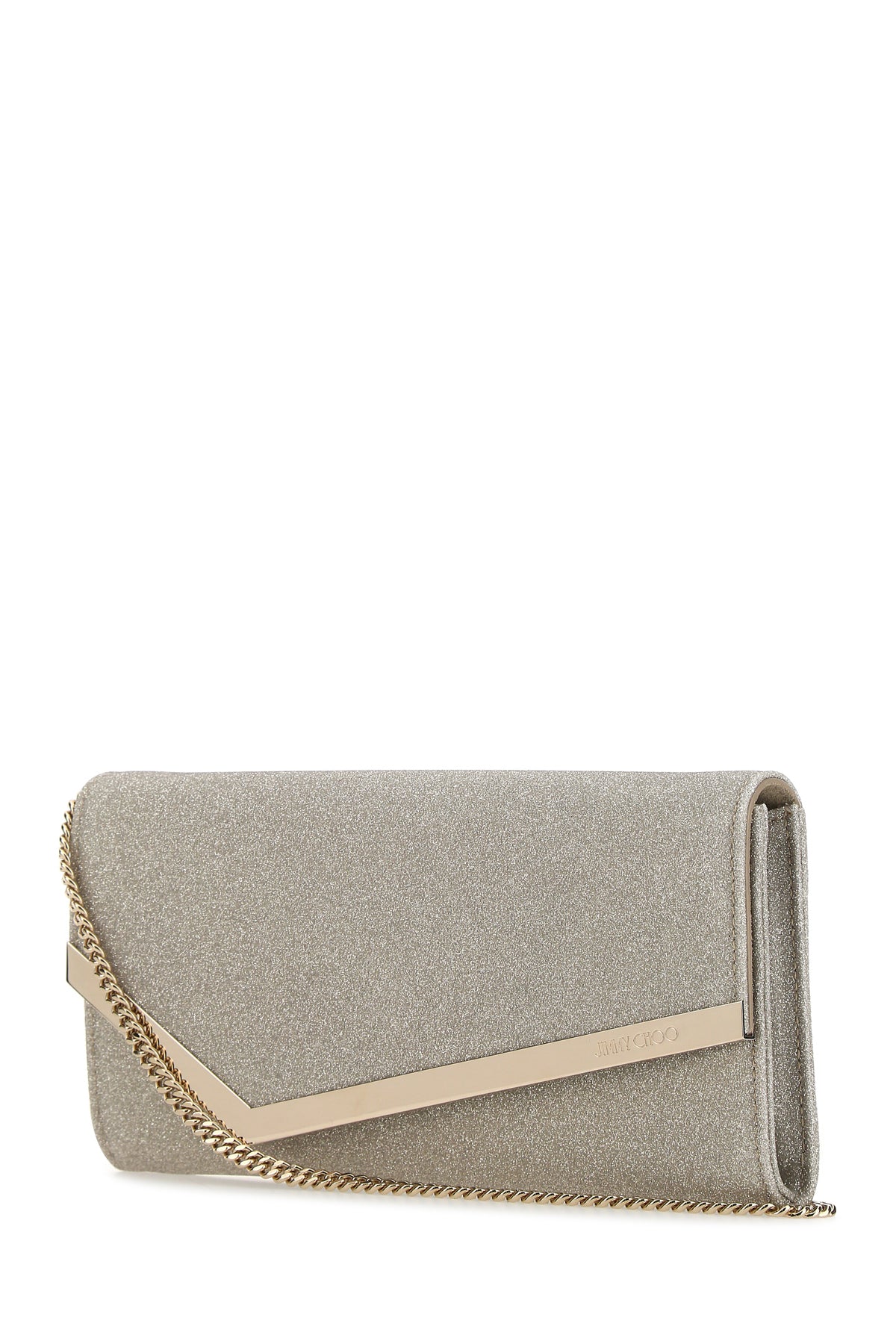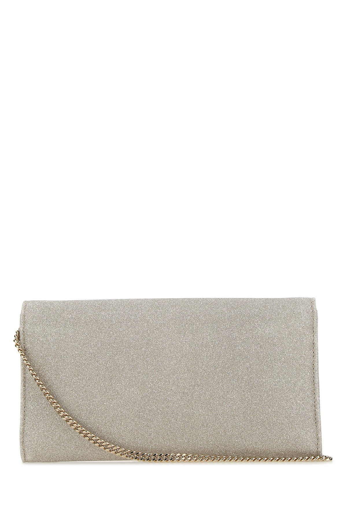 Clutch realized in fabric entirely covered by glitter characterized by embossed logo on the flap.