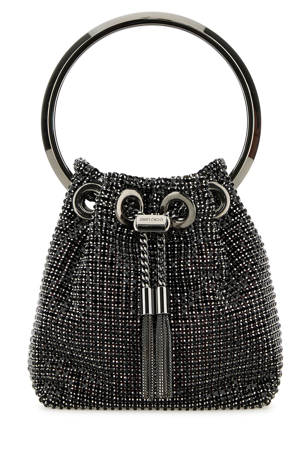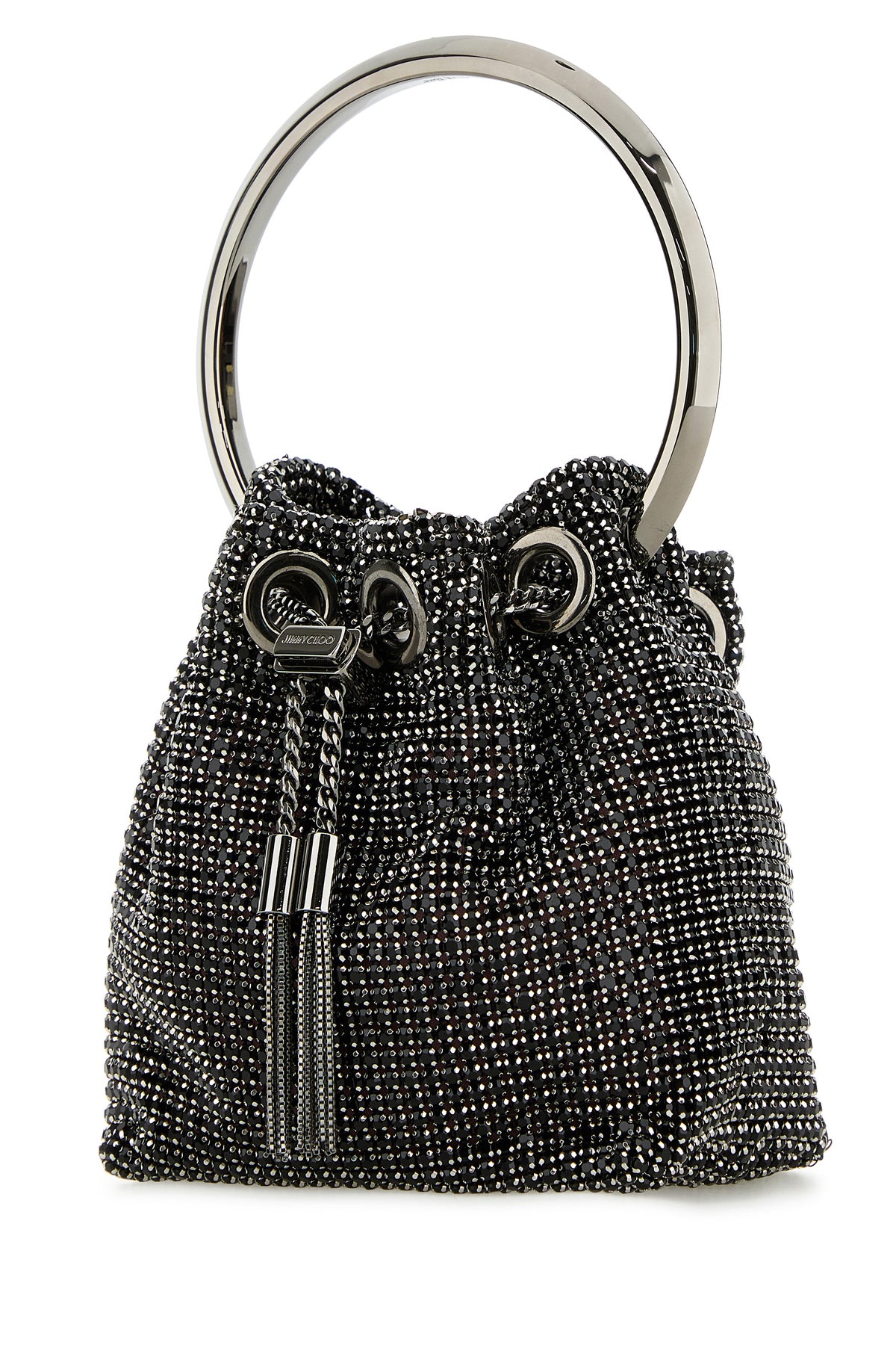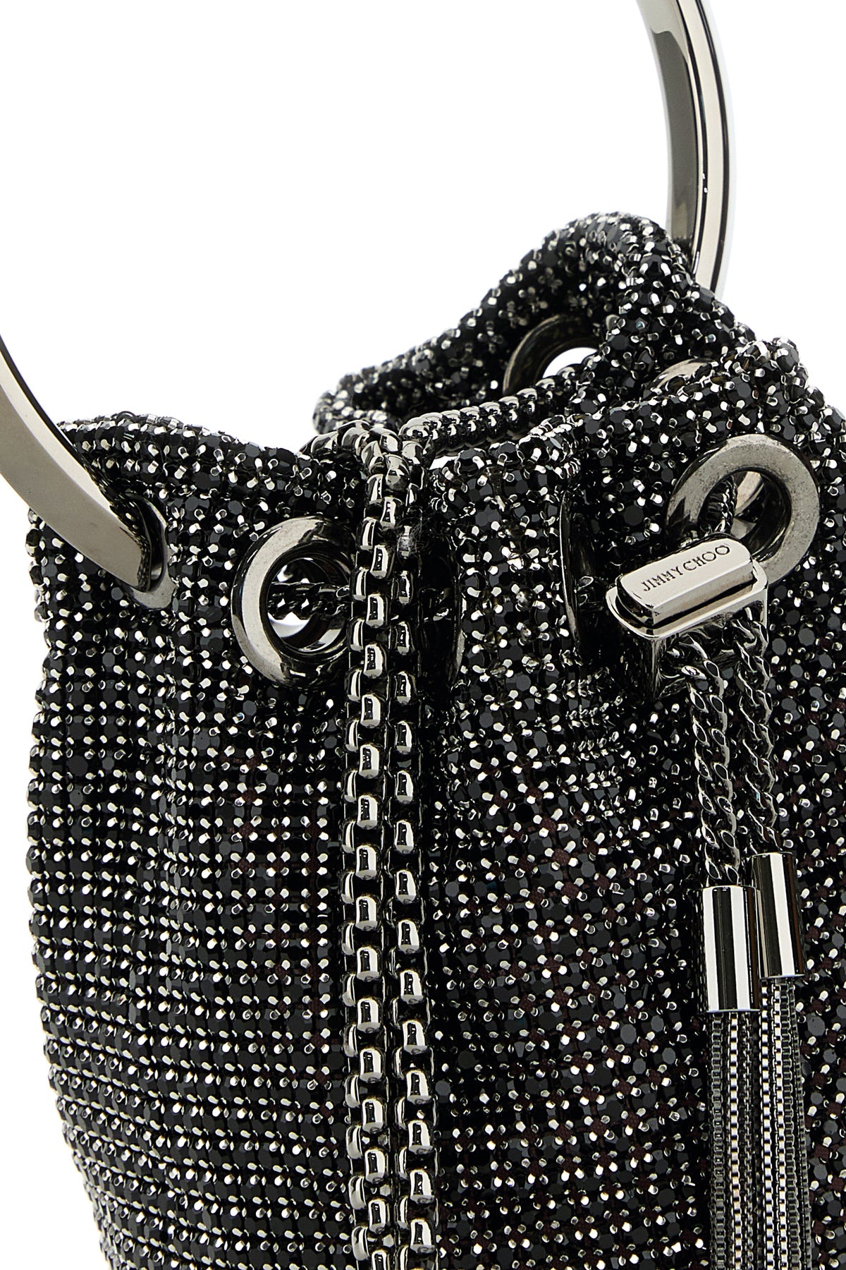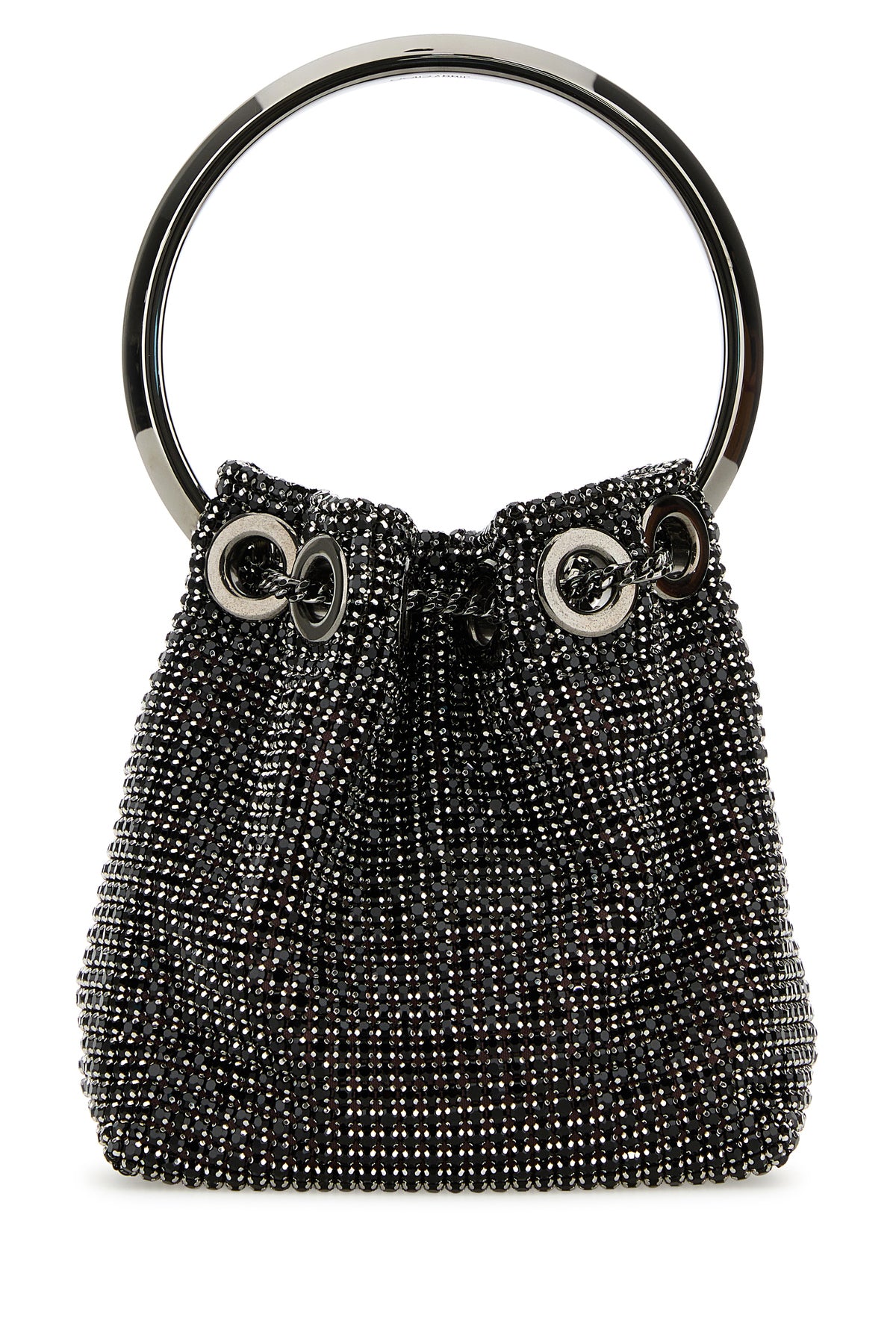 Bucket bag realized in fabric entirely covered by rhinestones characterized by logoed jewel drawstring closure.