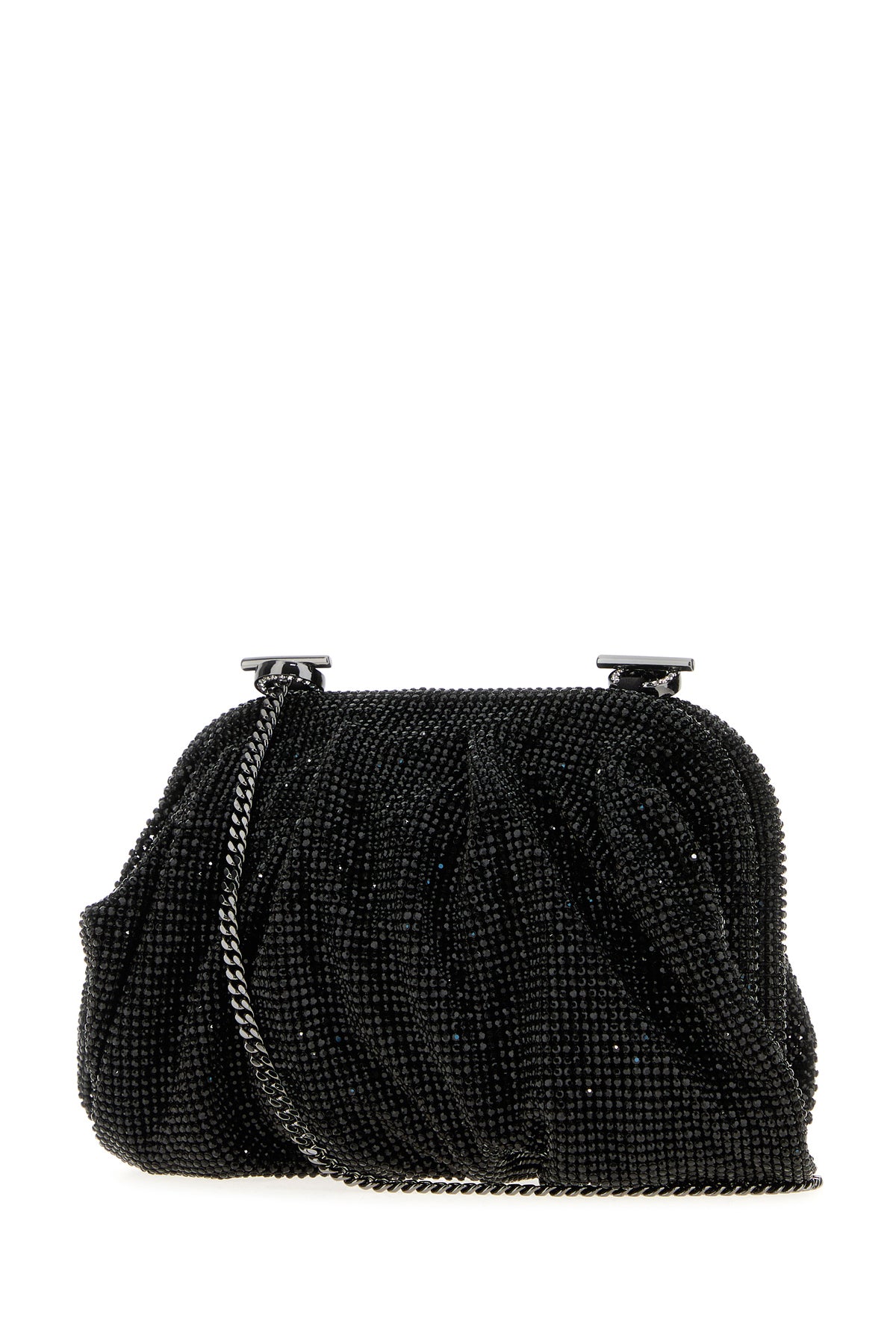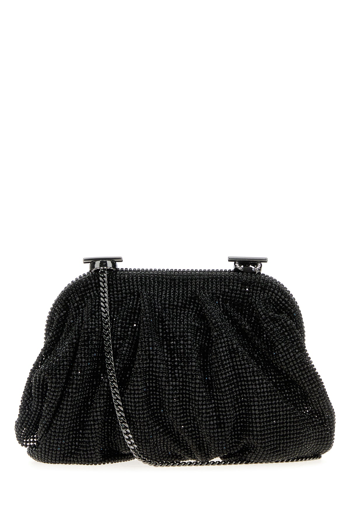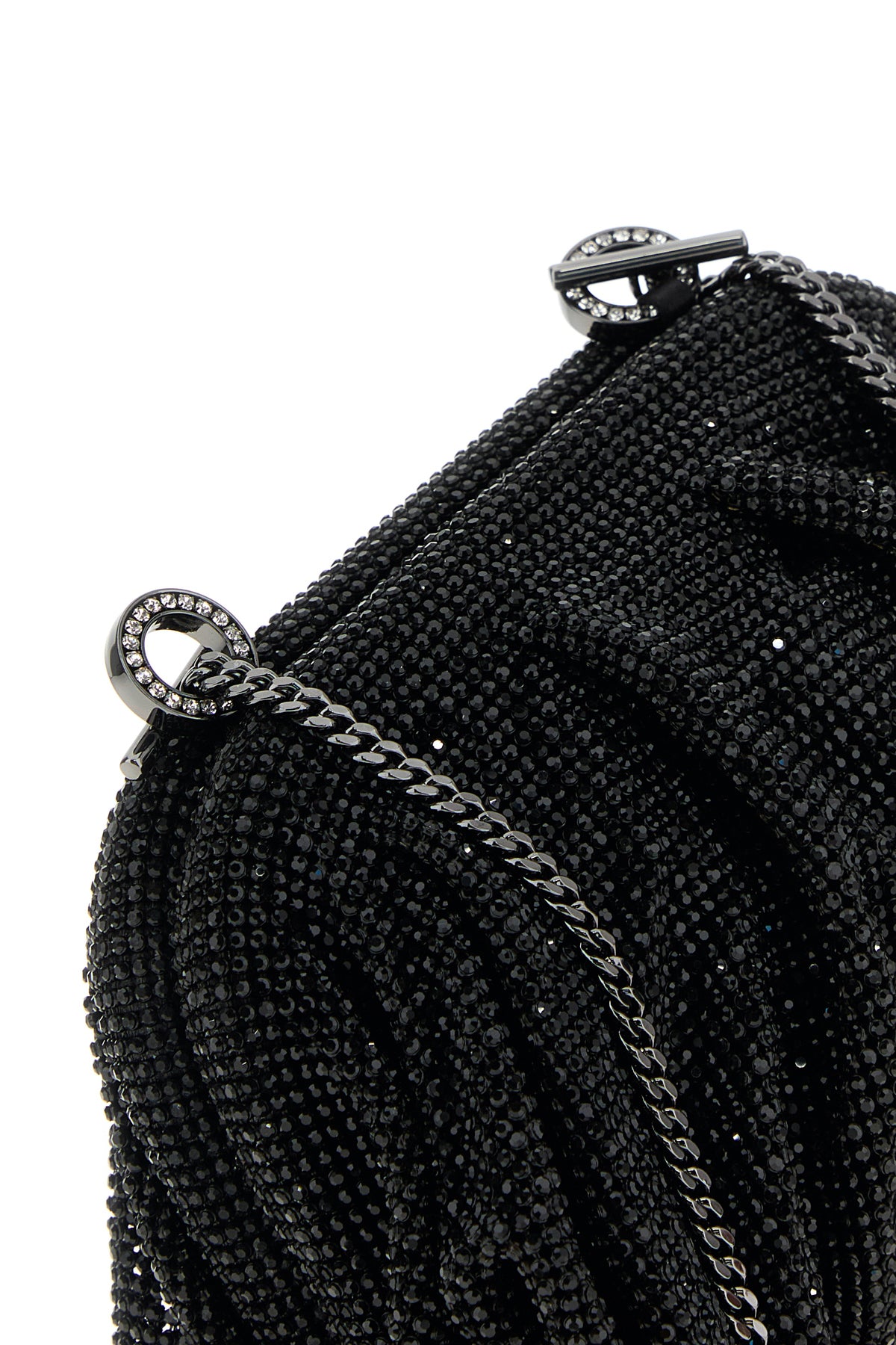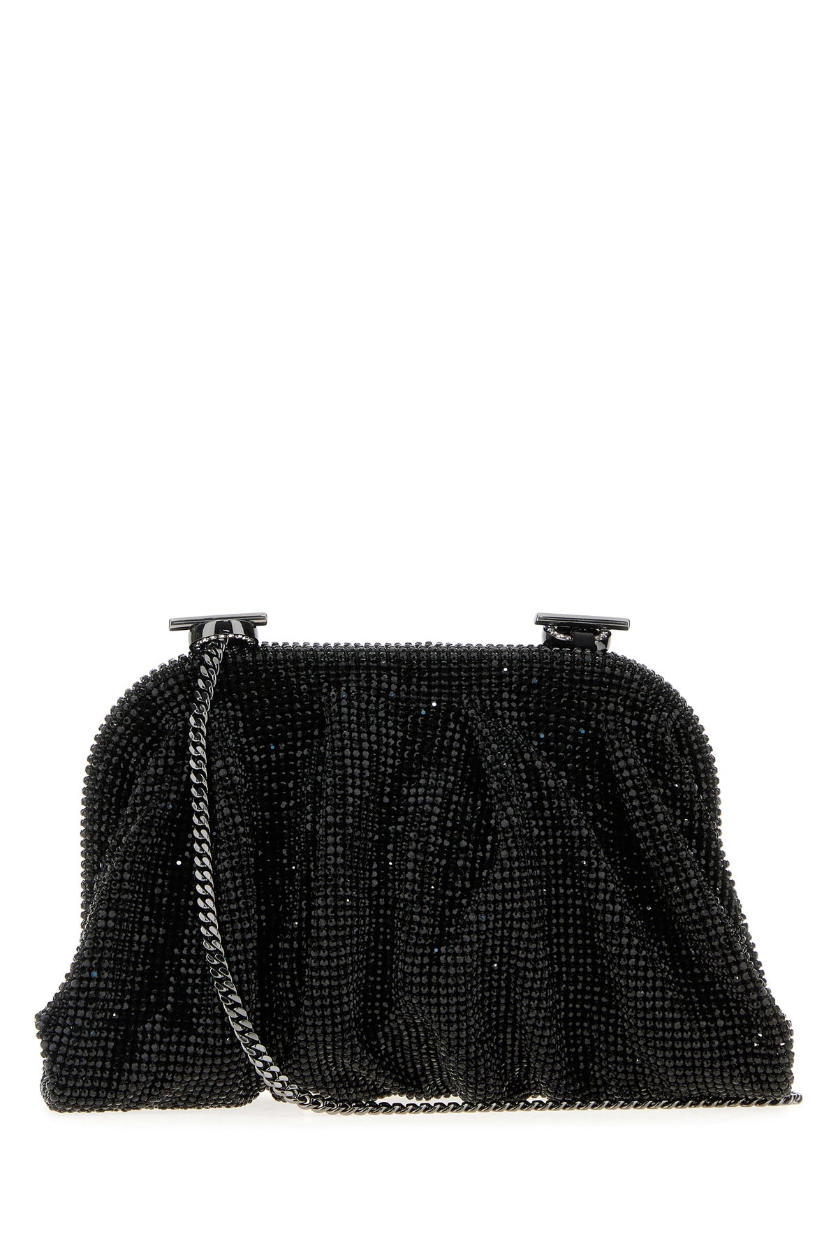 Clutch realized in fabric entirely covered by rhinestones.