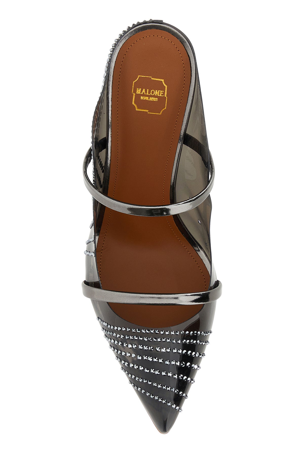 Mules realized in leather and rubber partially covered by rhinestones enriched by patent leather straps on the instep.