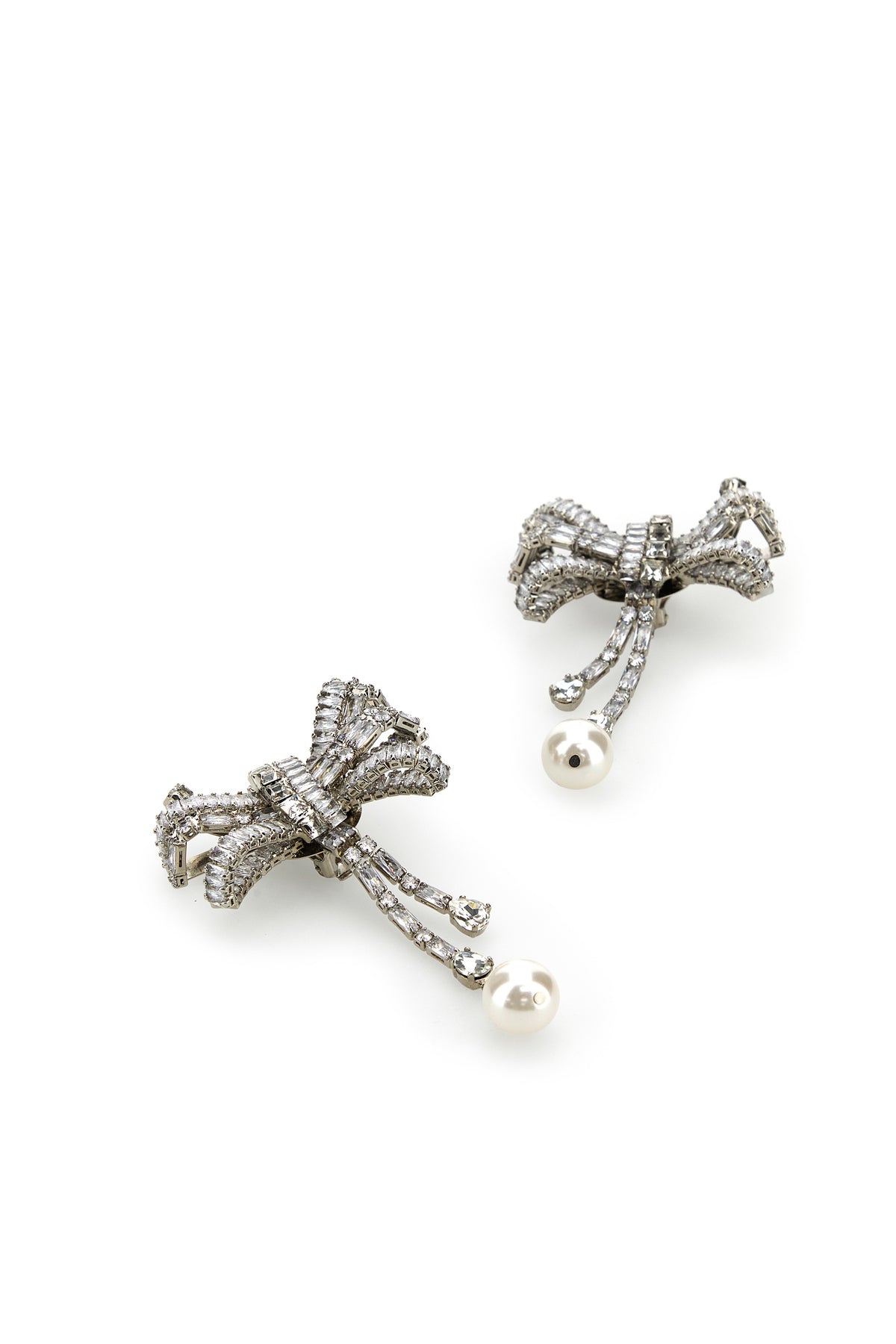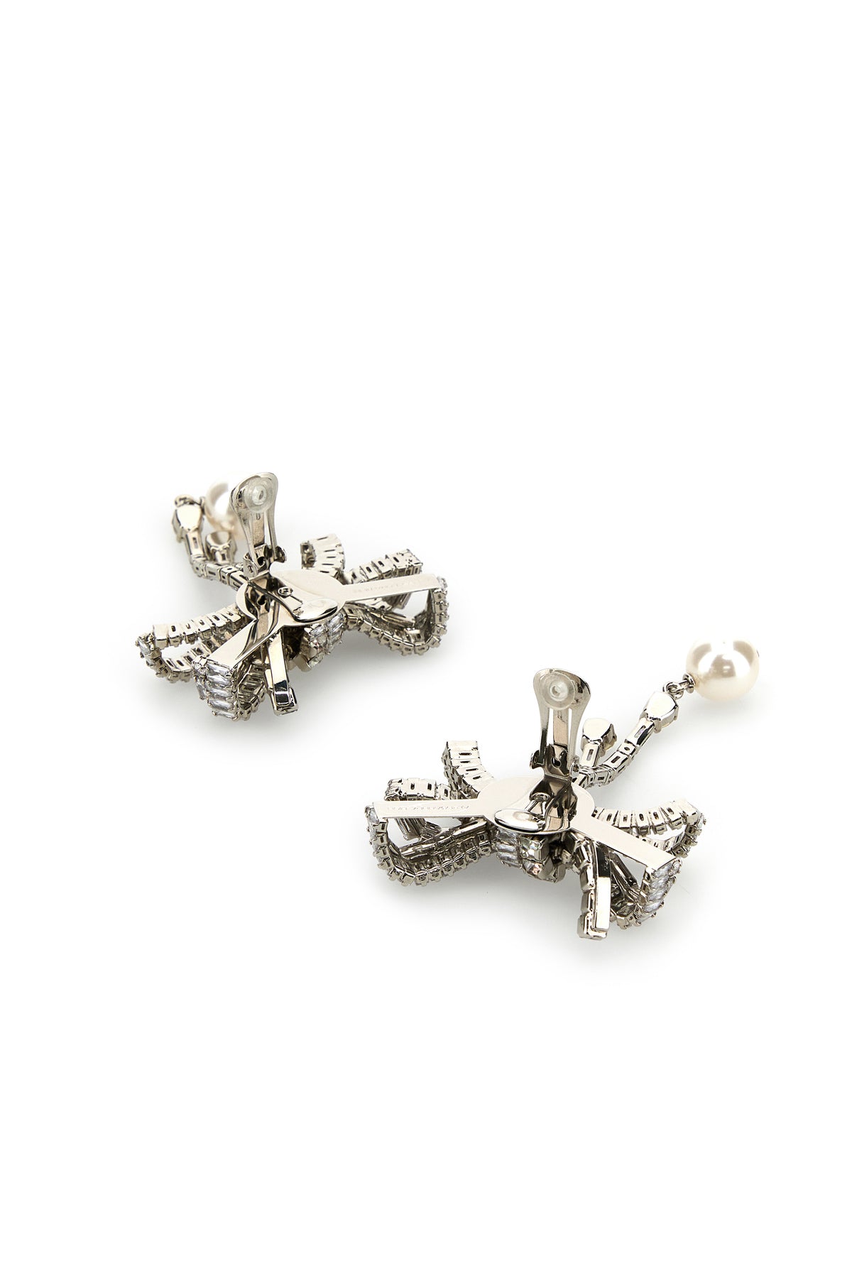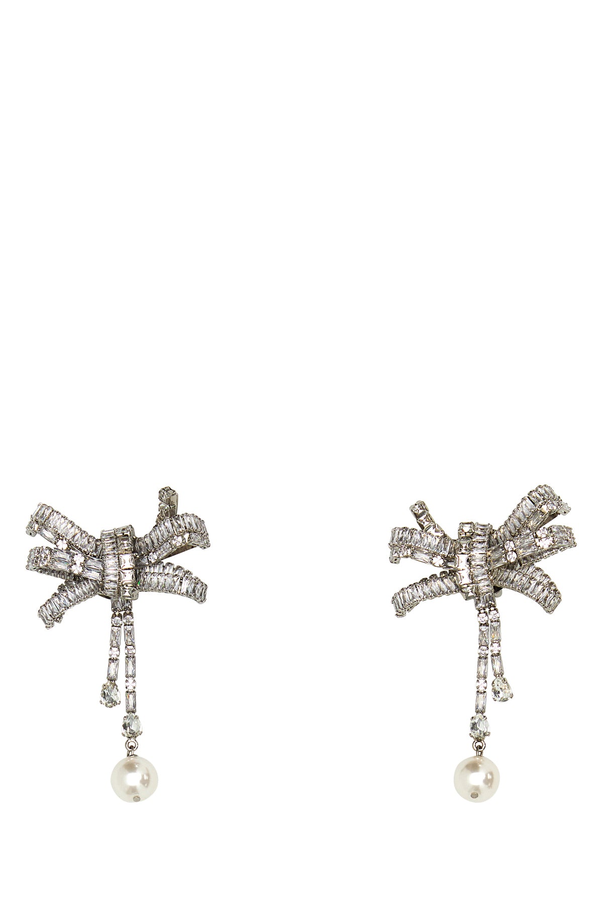 Pendant earrings realized in silver-tone plated metal enriched by rhinestones and pendant pearl.