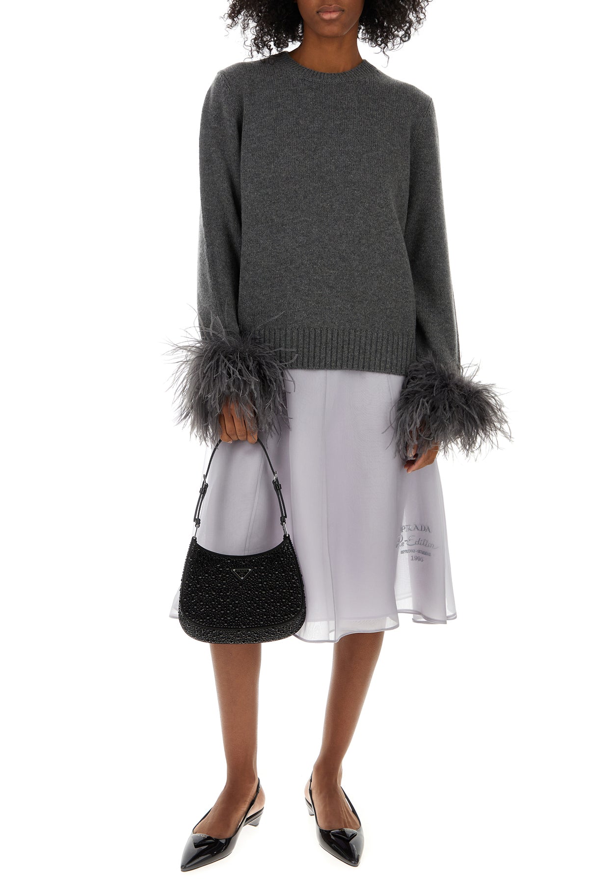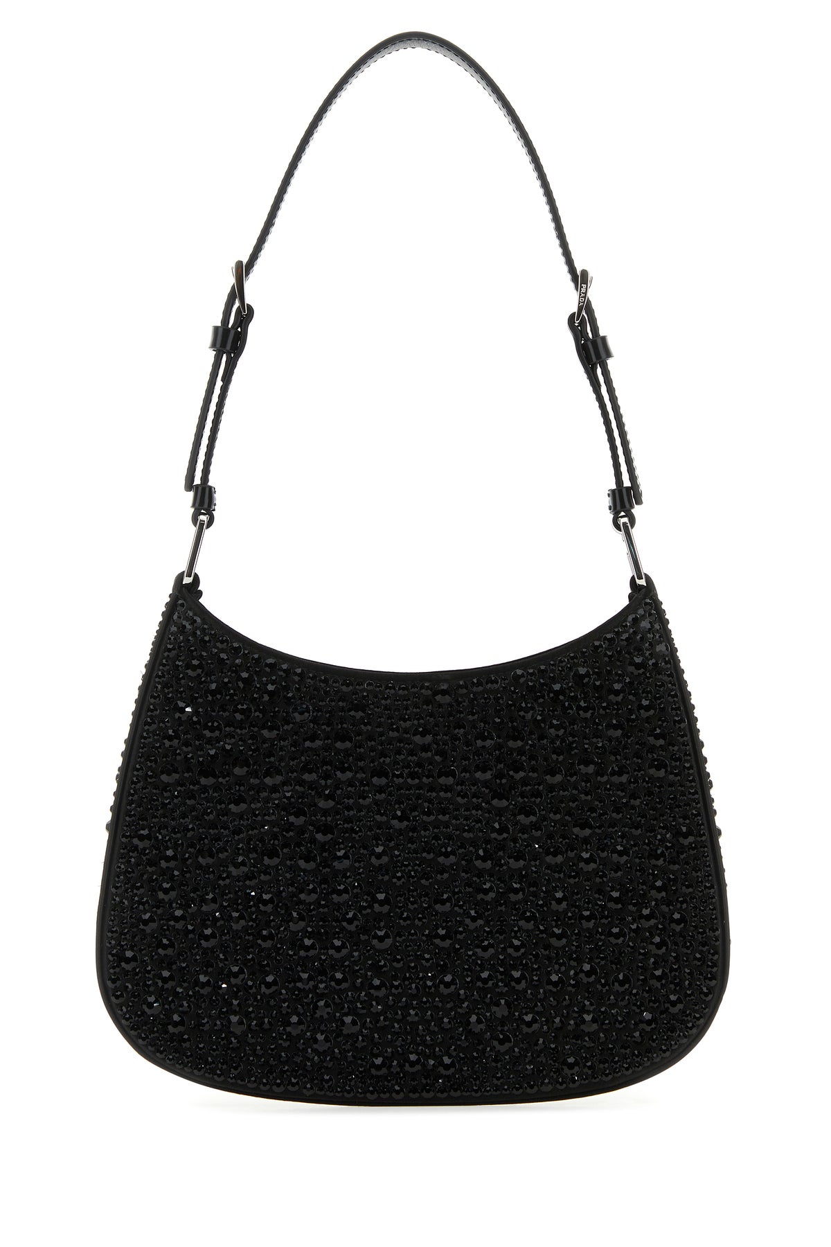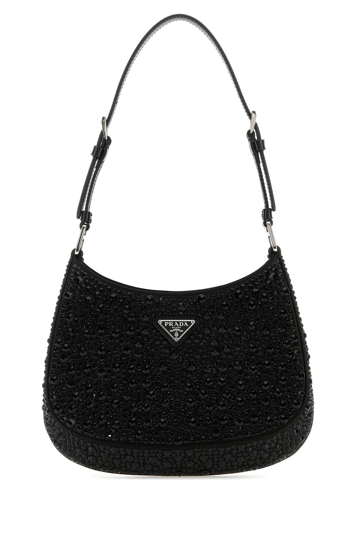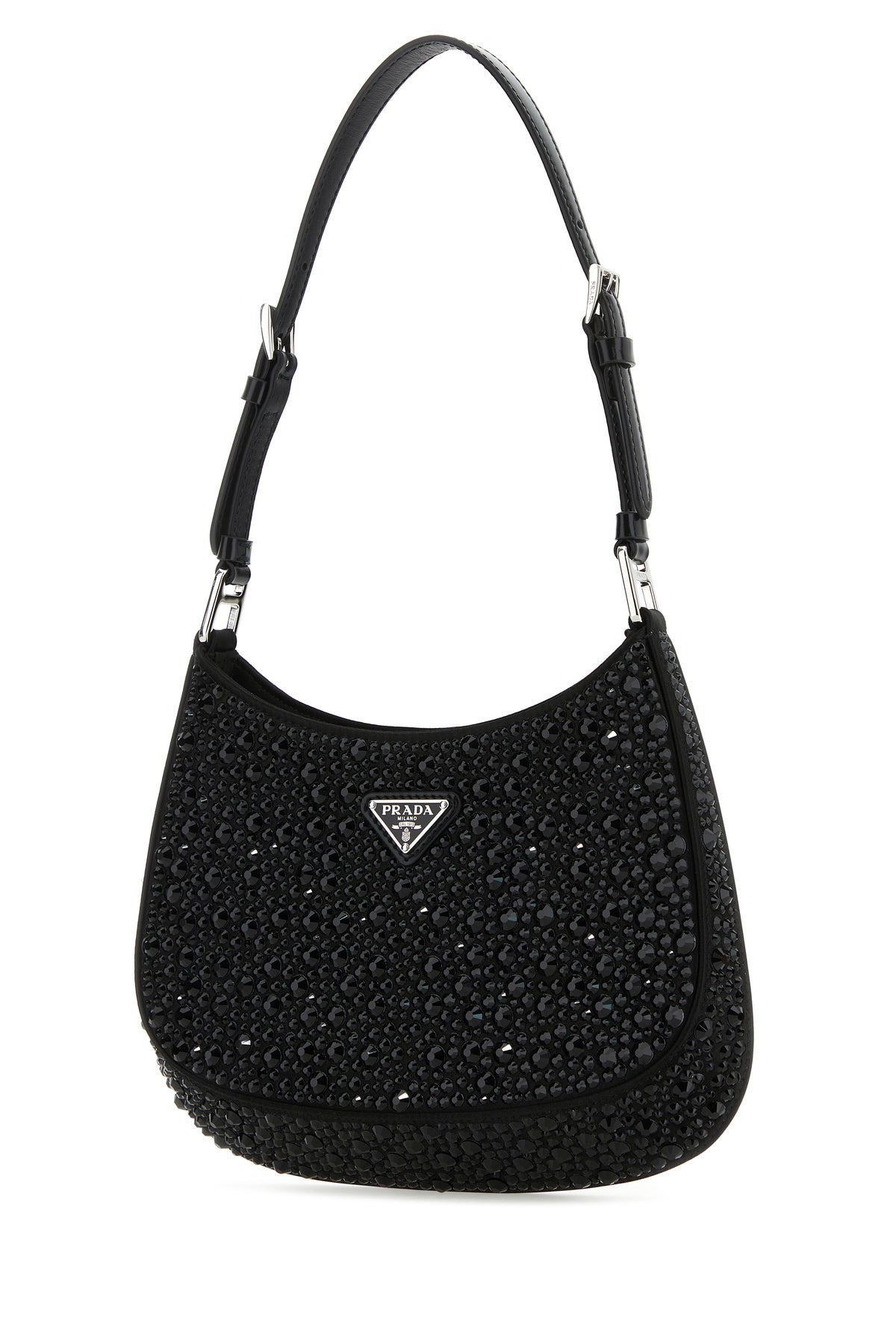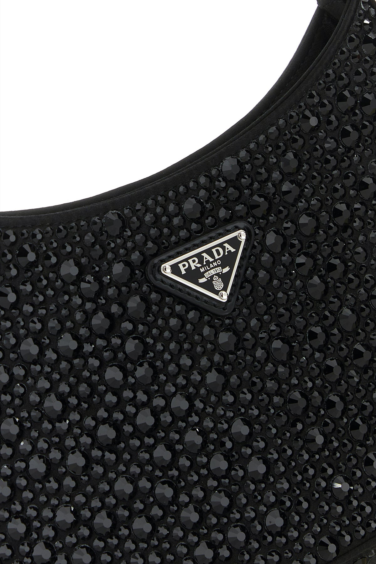 Handbag realized in satin entirely covered by rhinestones enriched by iconic logoed triangle at the front.