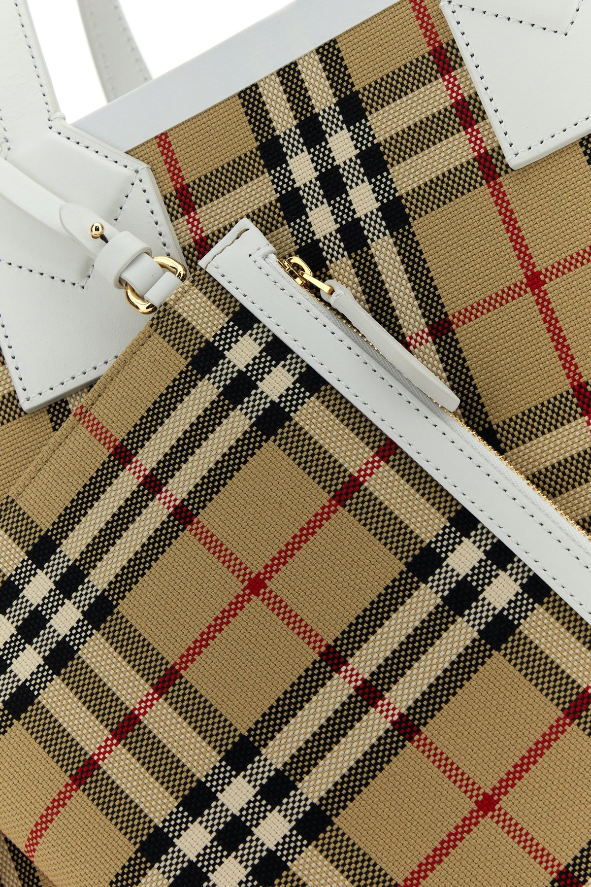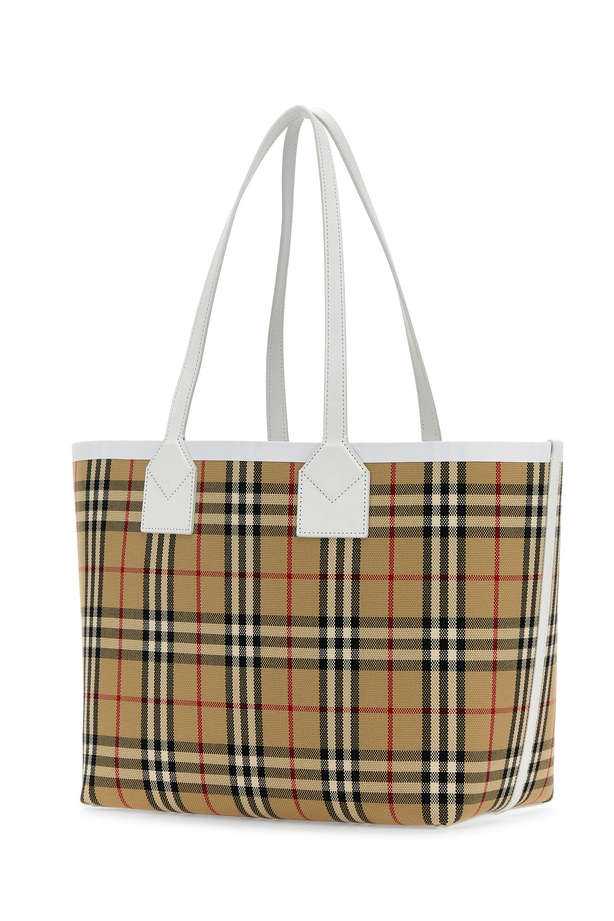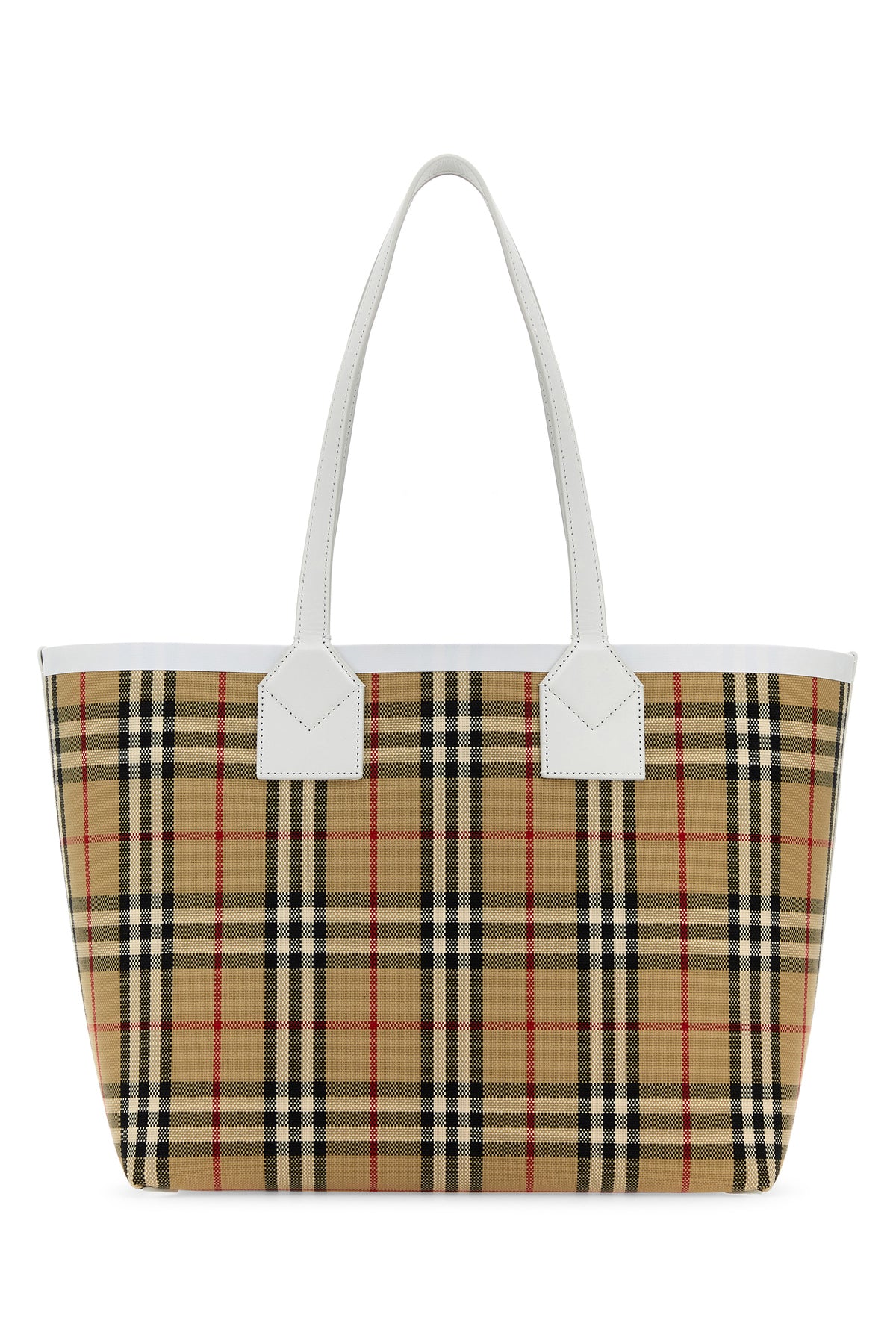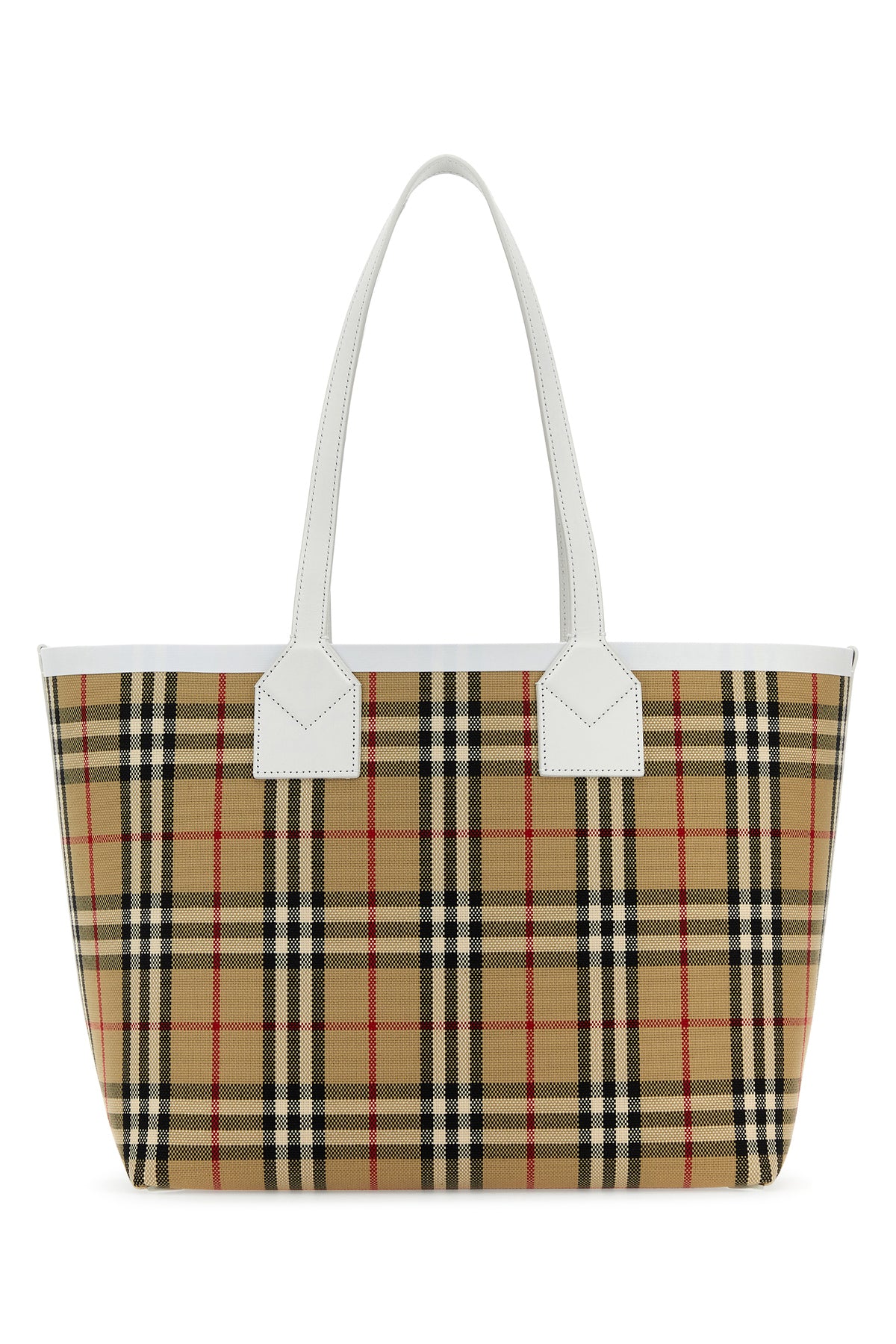 Shopping bag realized in pure cotton canvas with smooth calf leather inserts characterized by Burberry Check motif embroidery on the entire surface.
