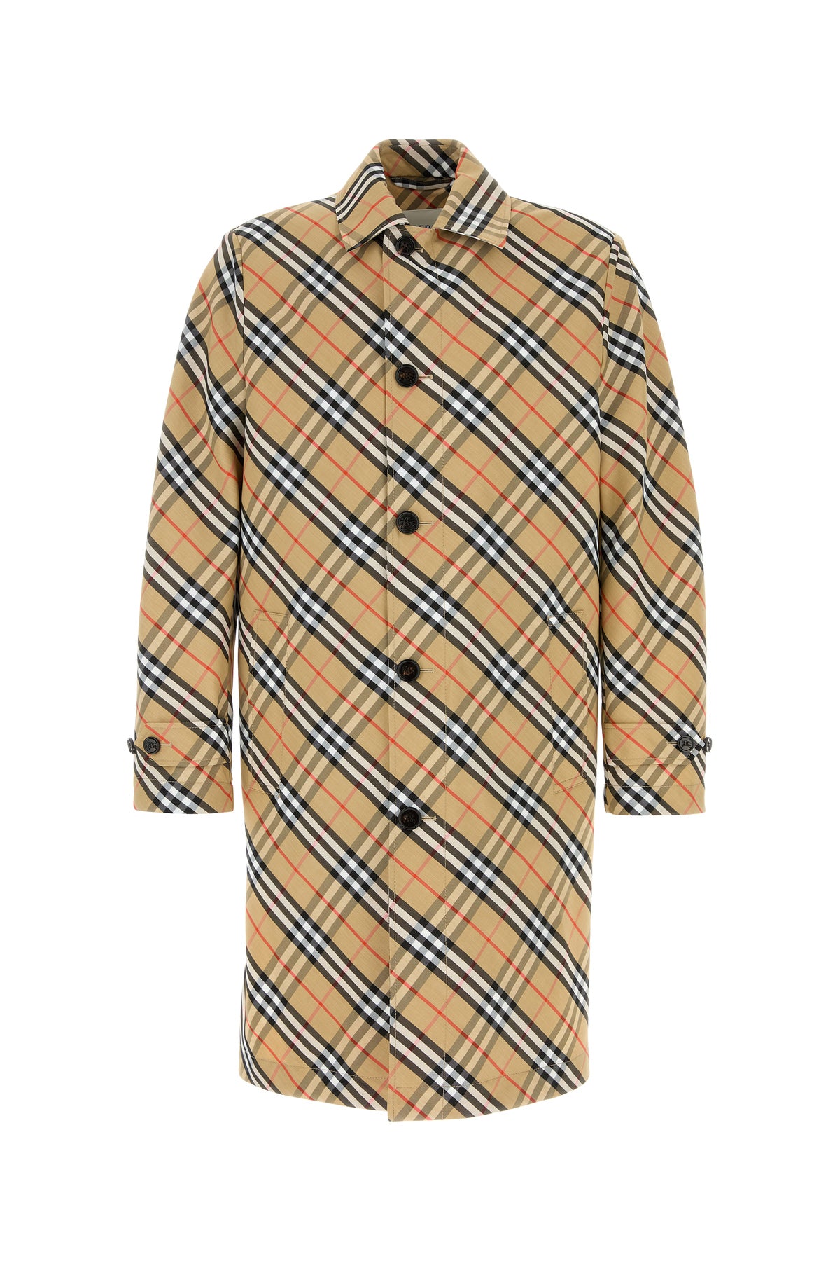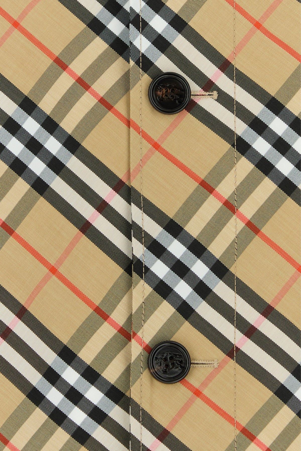 Trench realized in polyester characterized by Burberry Check embroidery on the entire surface.