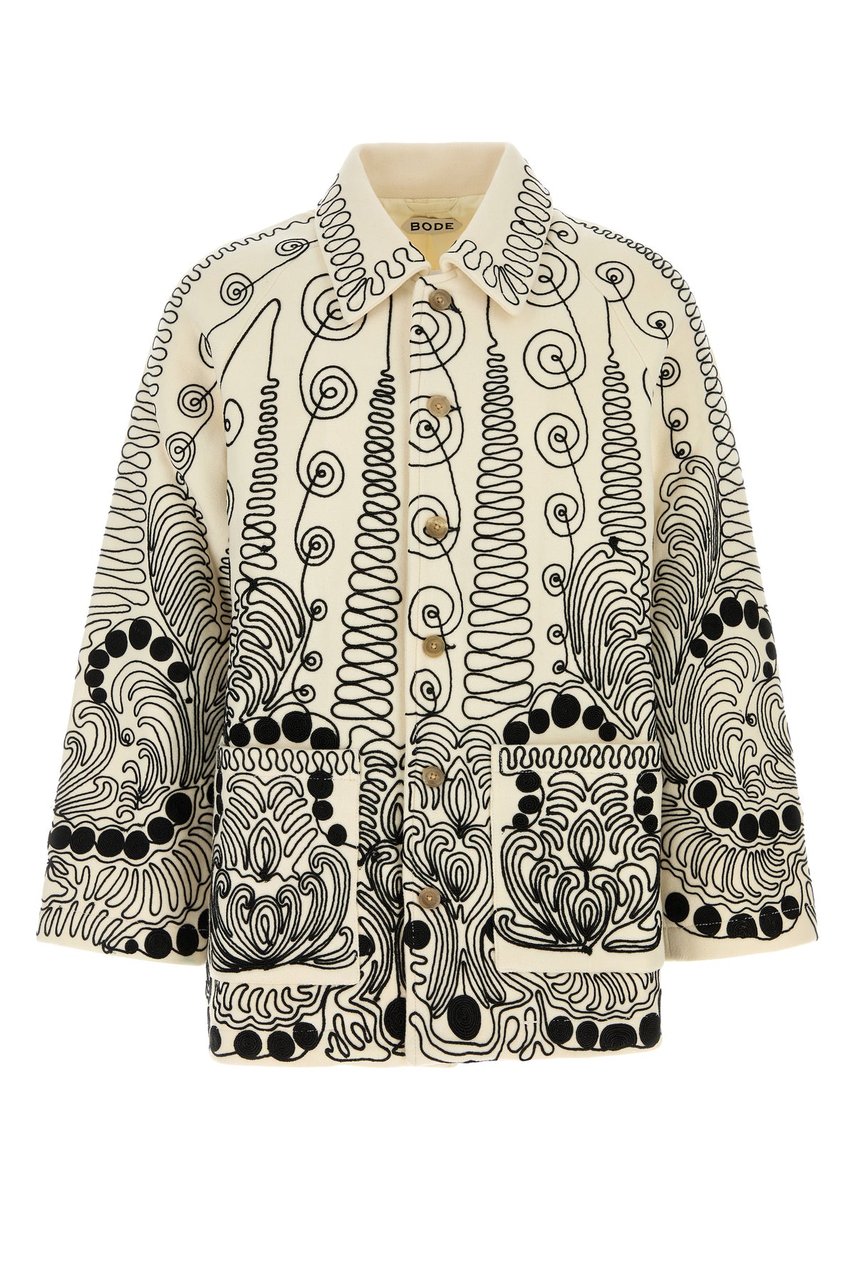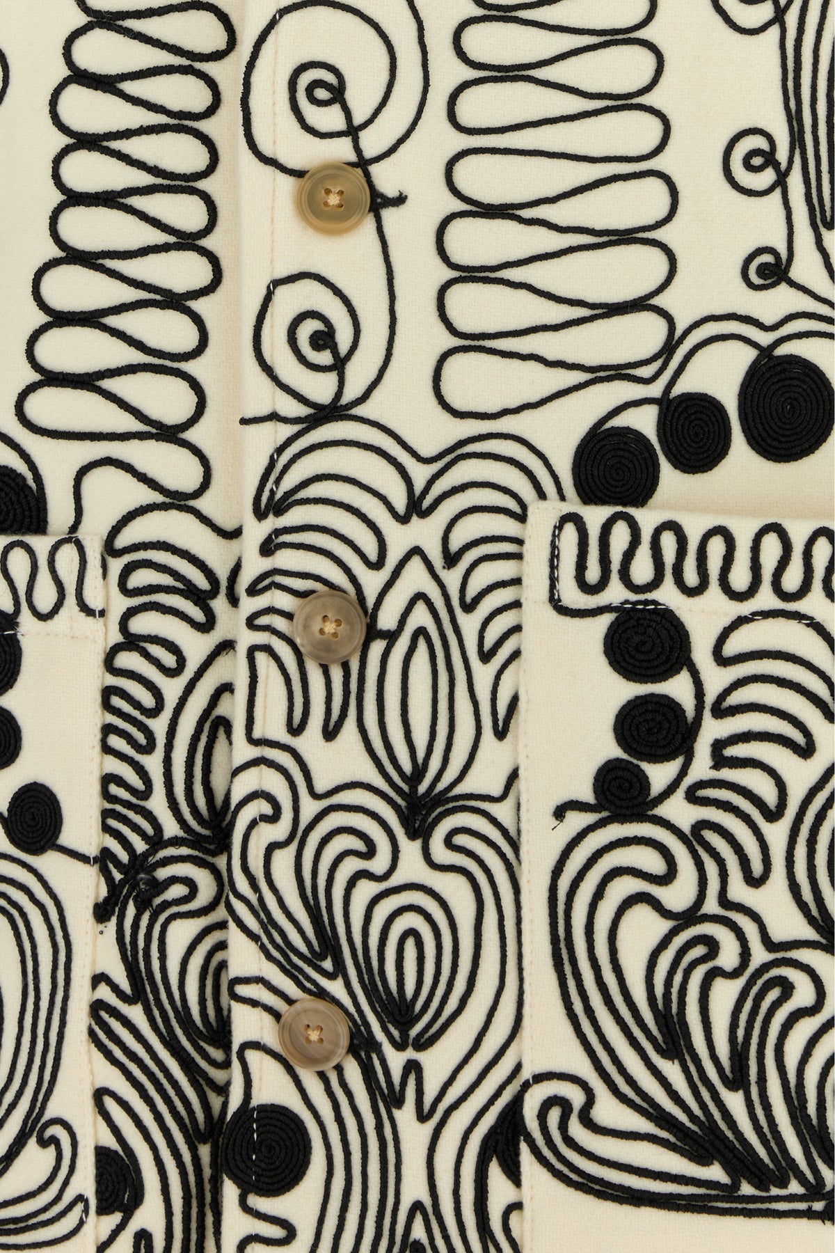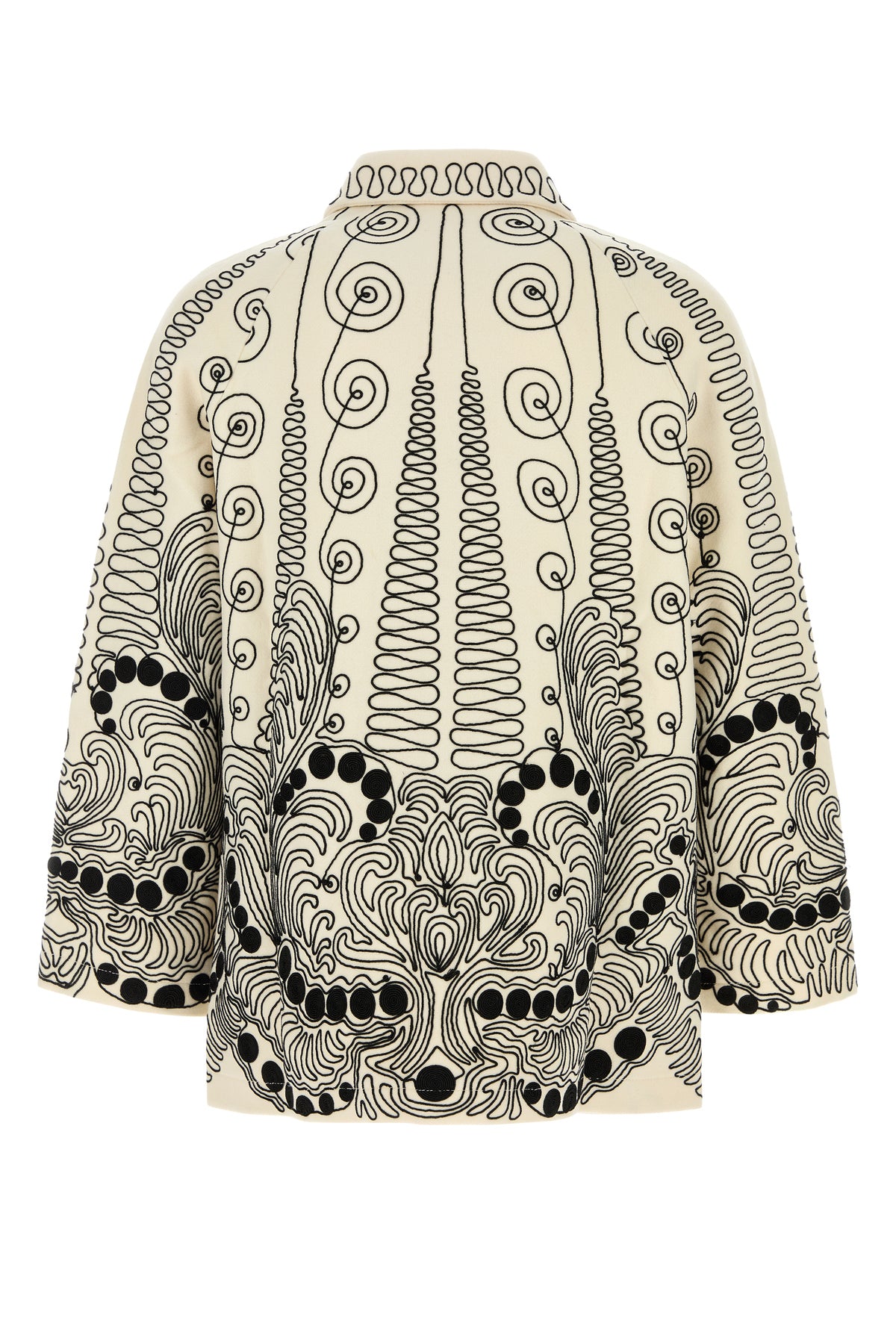 Coat realized in pure wool characterized by peculiar embroideries on te entire surface.