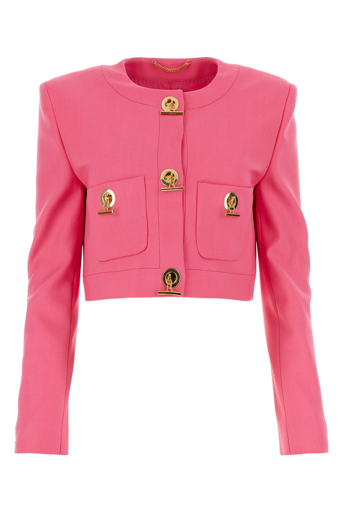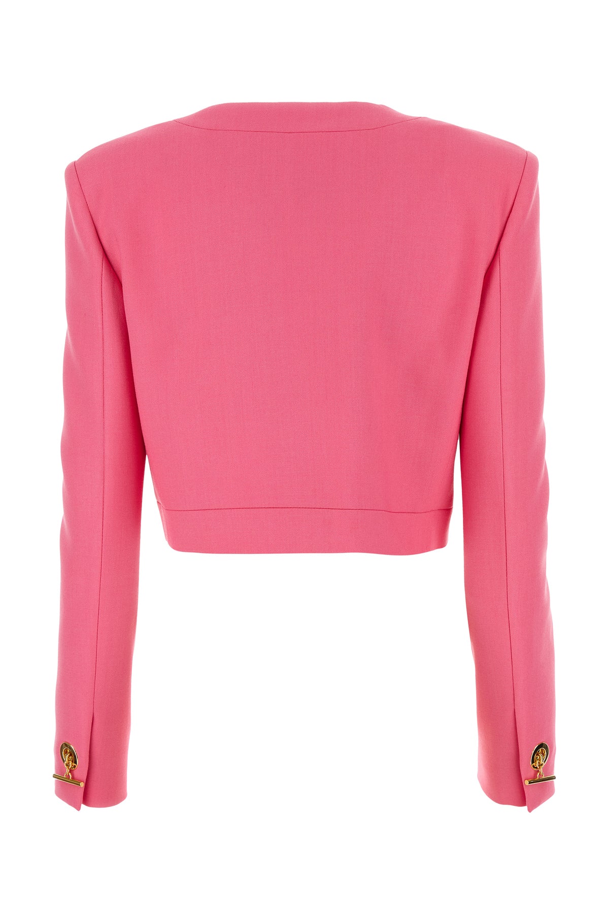 Cropped-cut blazer realized in stretch gabardine enriched by metal logoed frogs at the front.