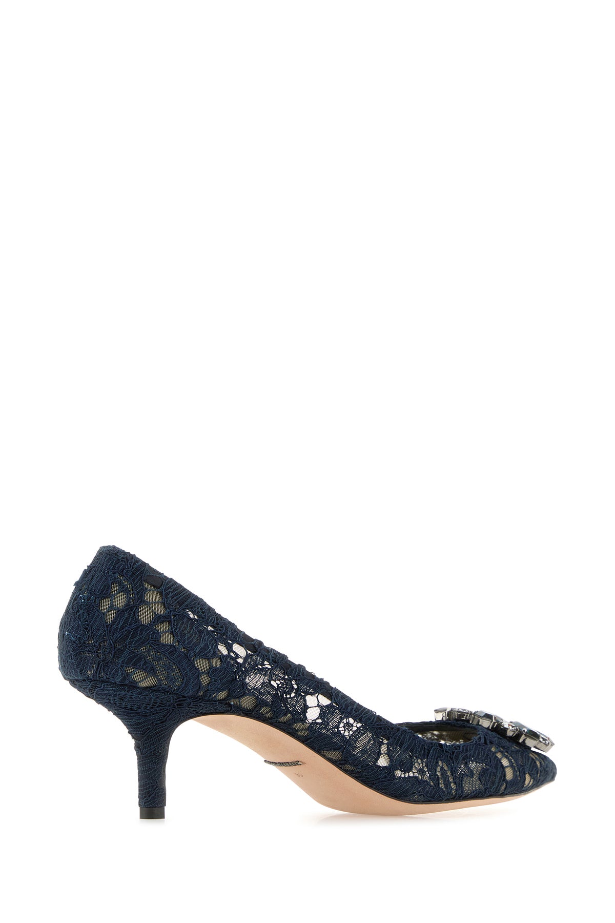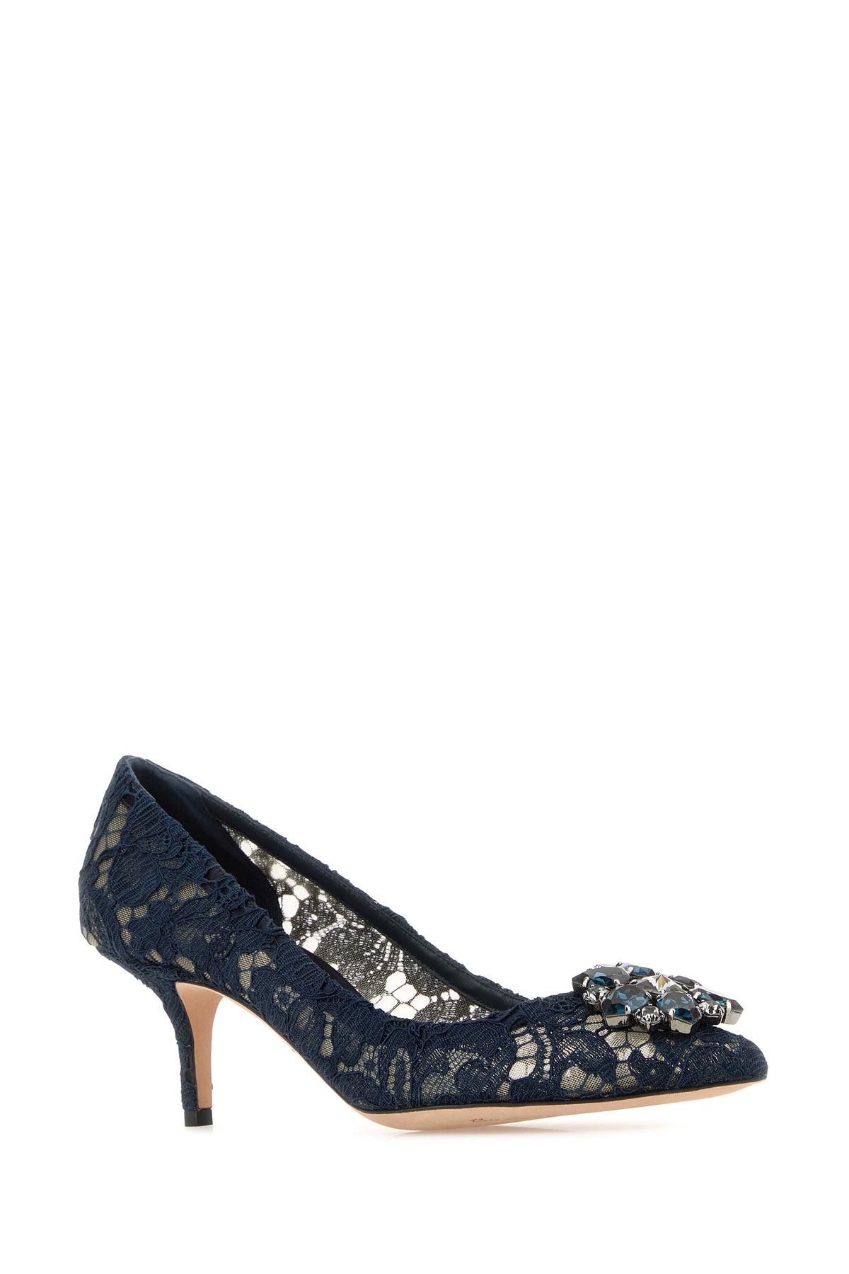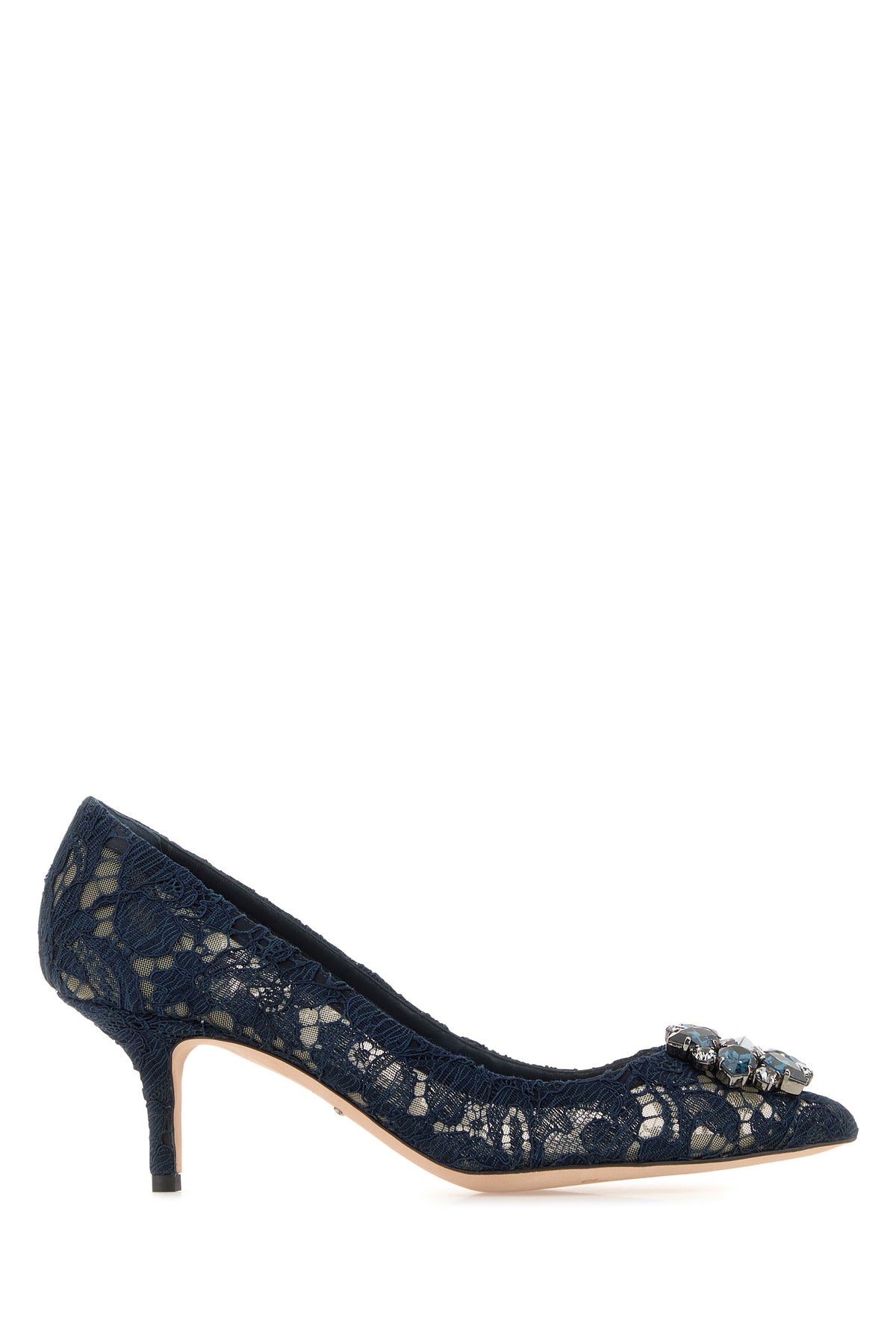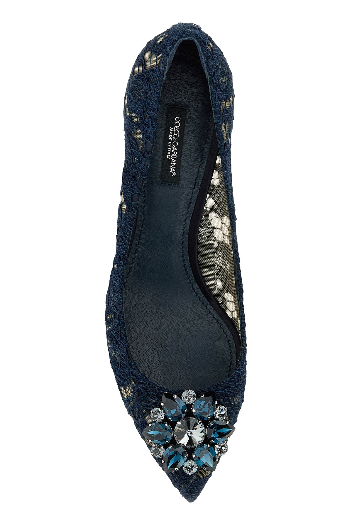 Pumps realized in macrame lace enriched by jewel detail at the front.