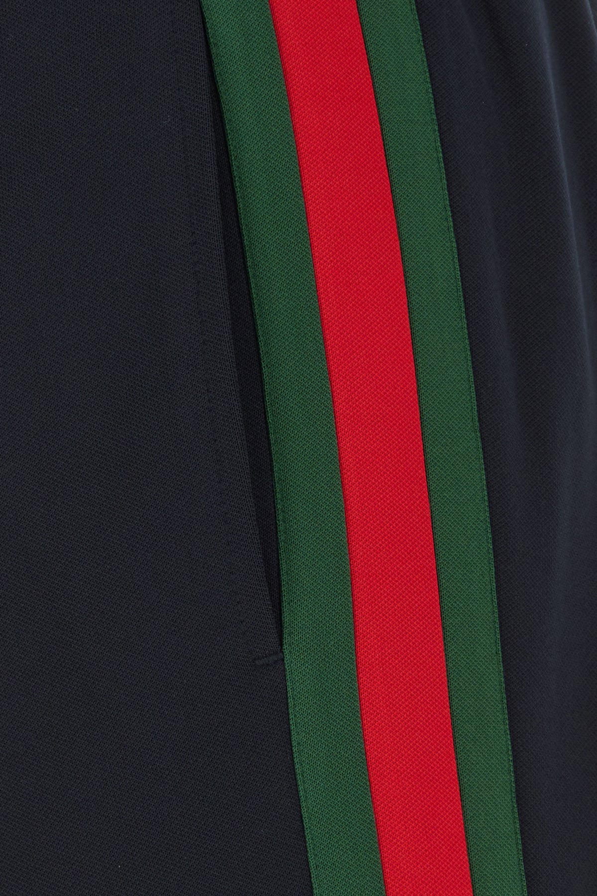 Joggers realized in polyester blend enriched by Web patches on the sides.