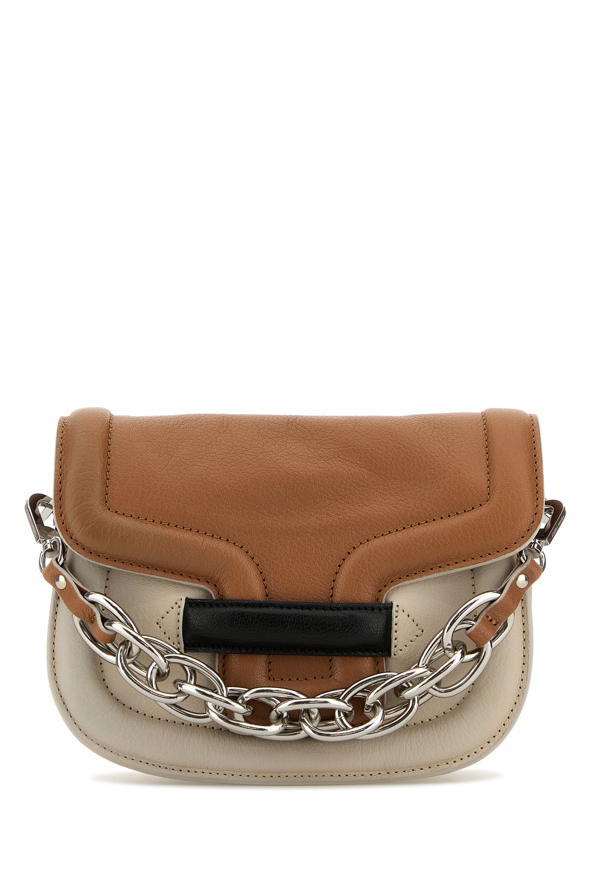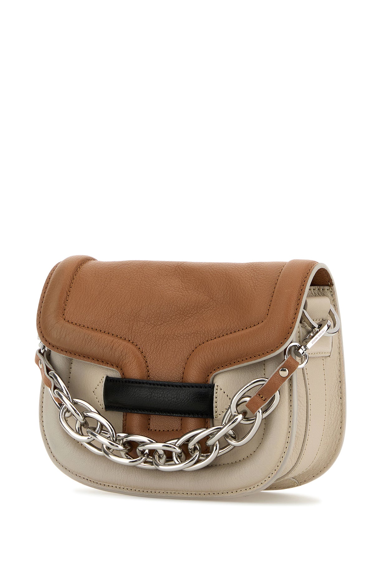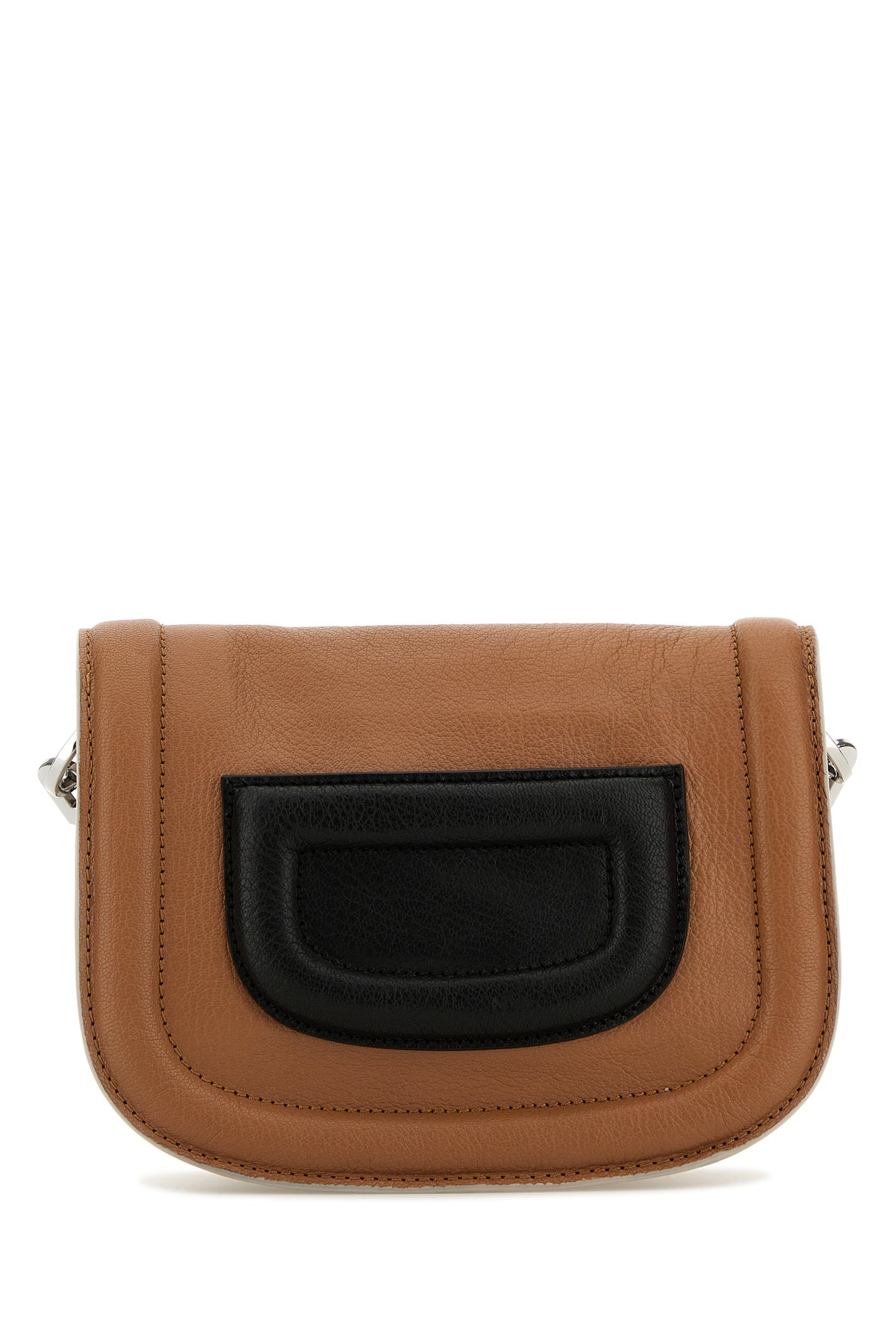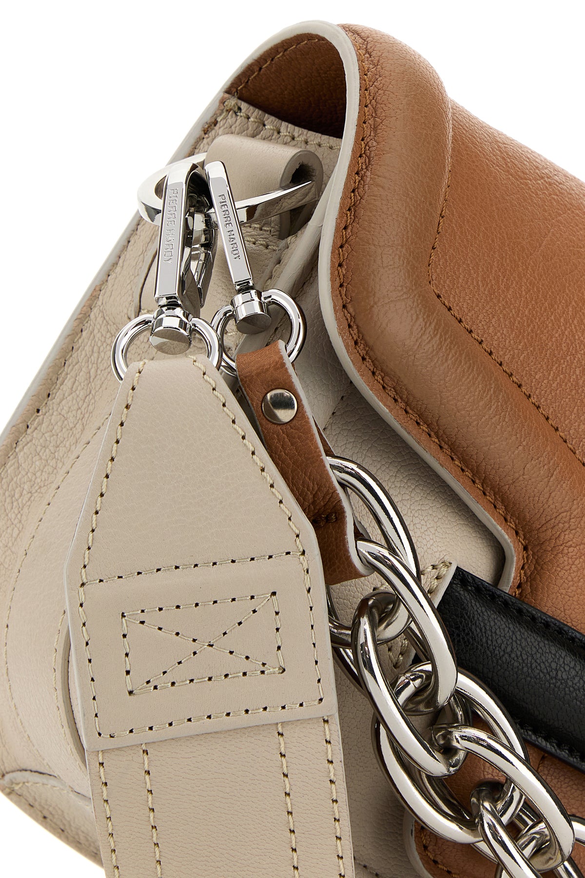 Handbag realized in pebble ovine leather characterized by flap with snap-fit closure.