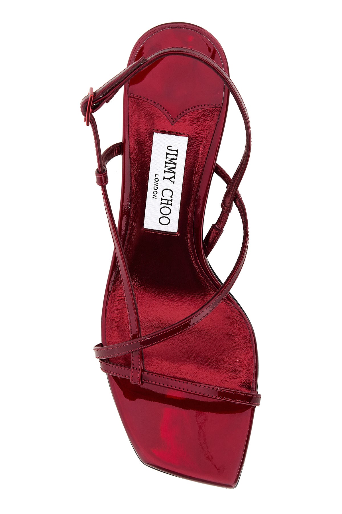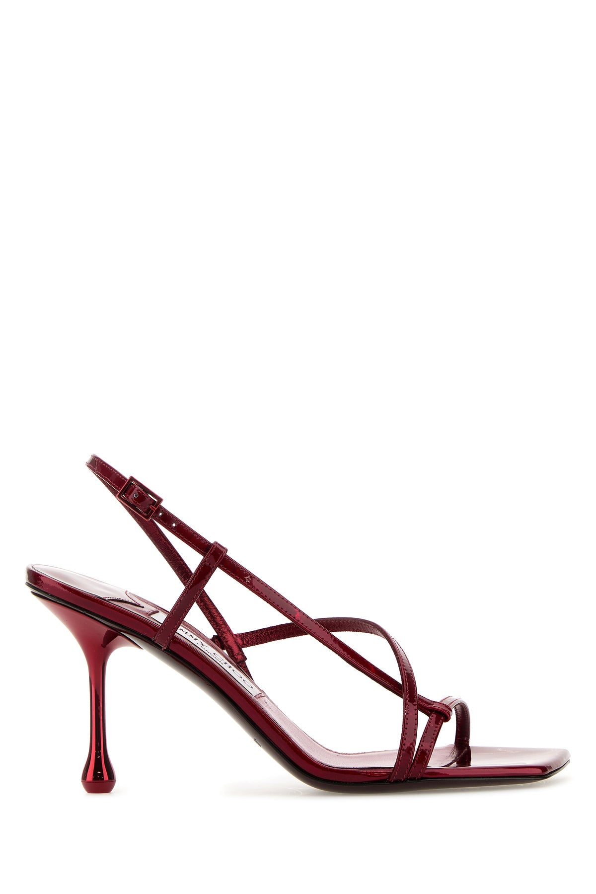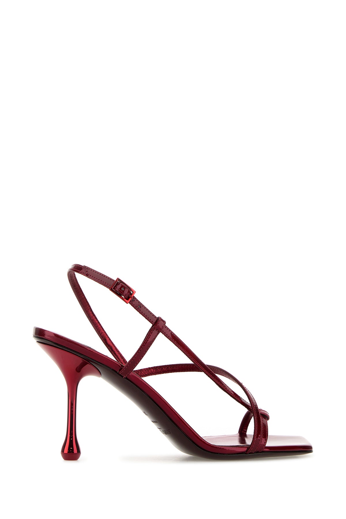 Sandals realized in laminated leather characterized by adjustable ankle strap closure.