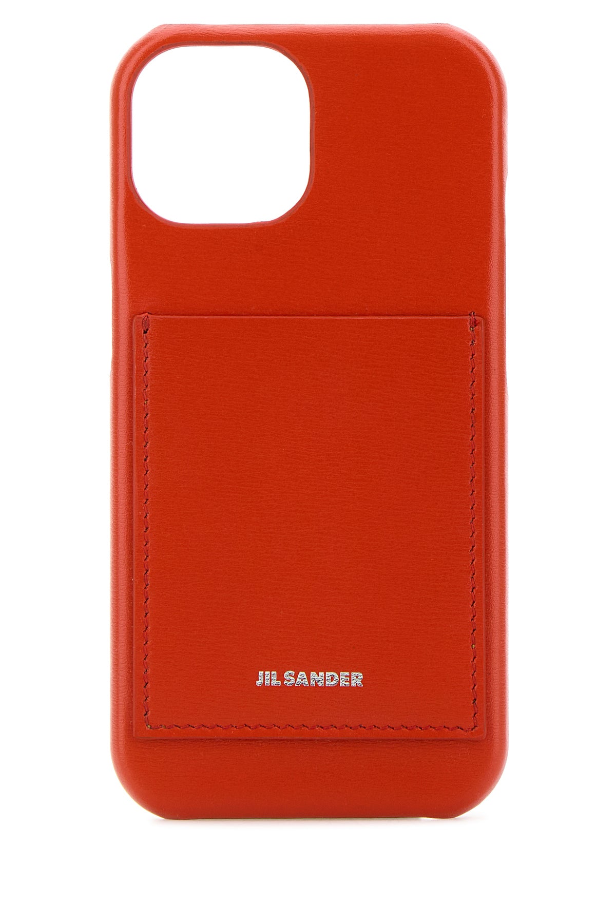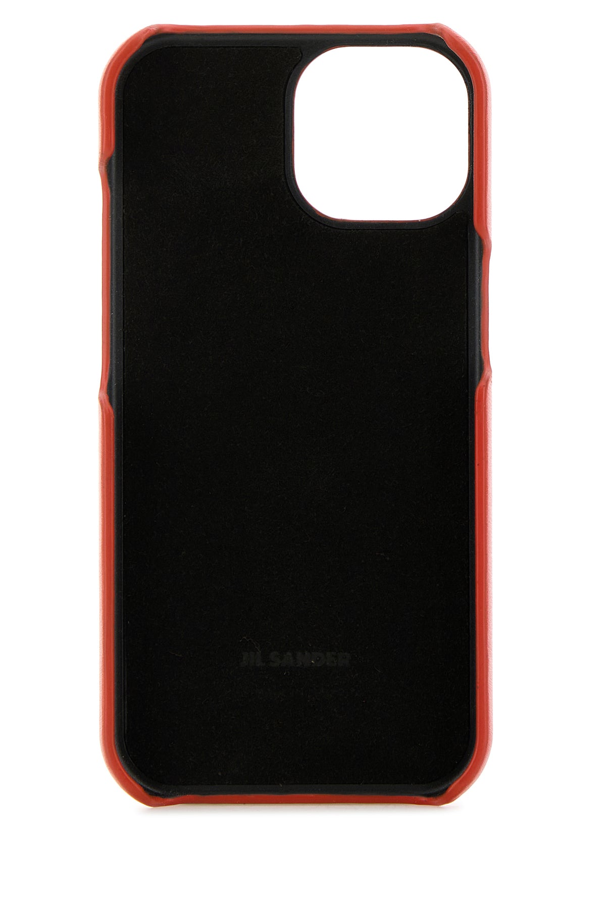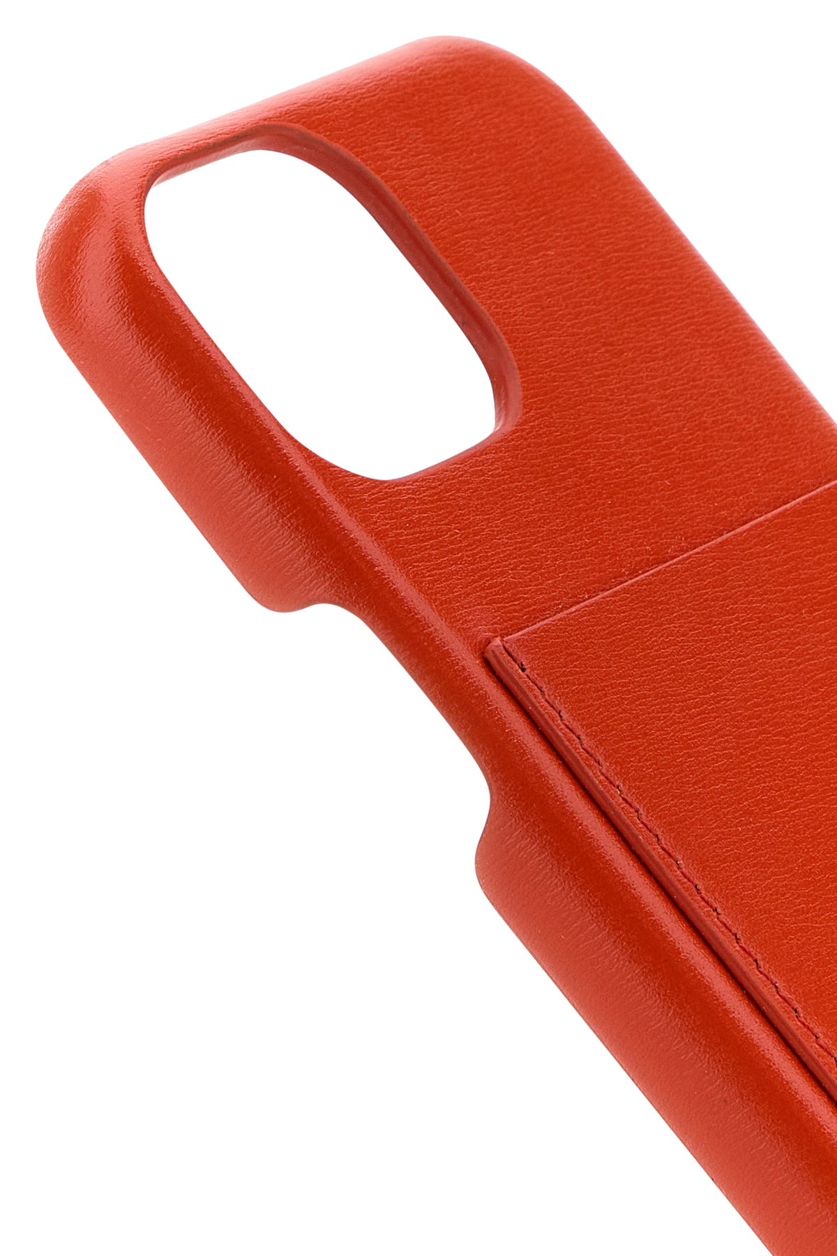 iPhone 15 cover realized in leather characterized by laminated printed logo at the back.