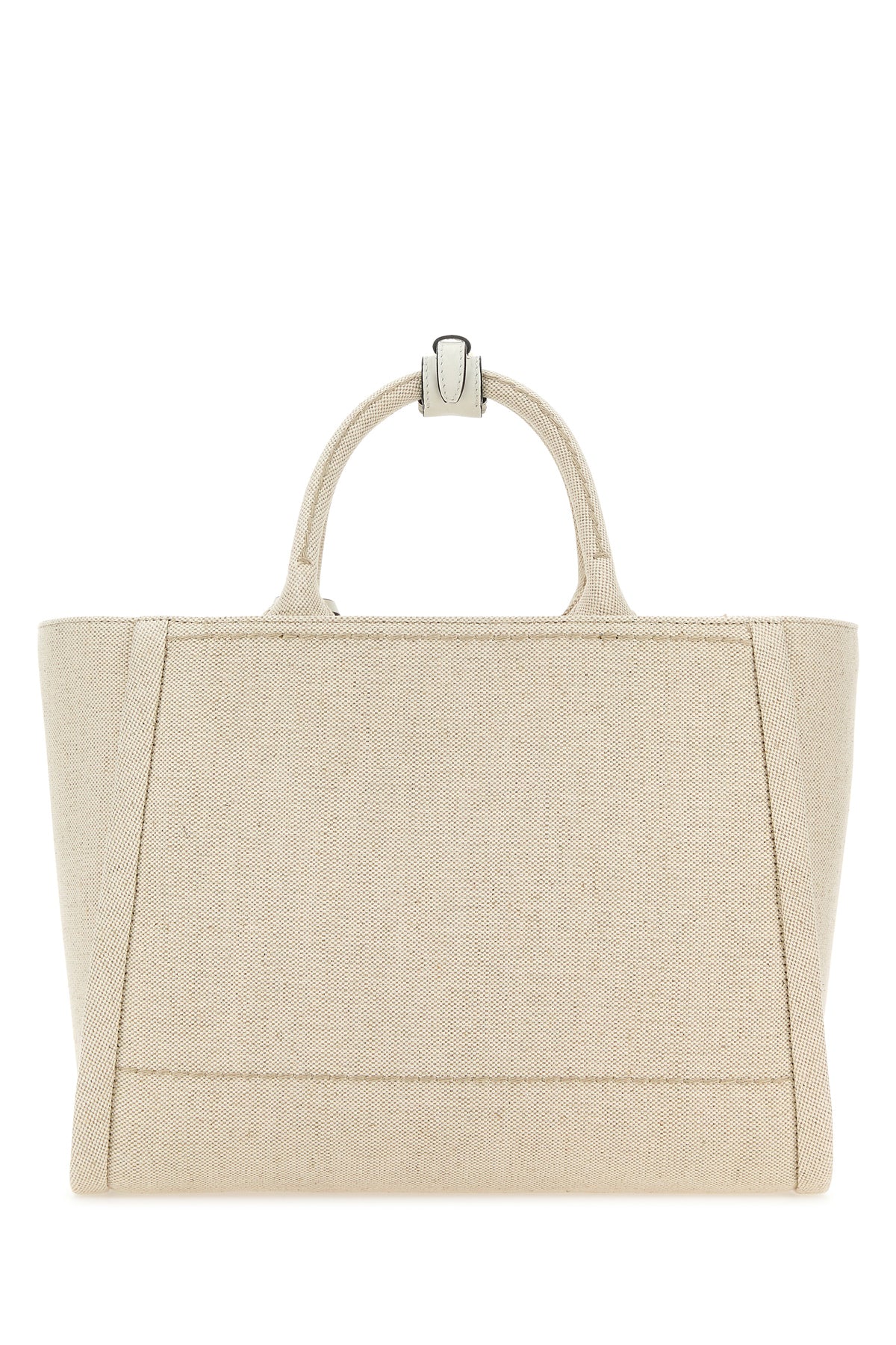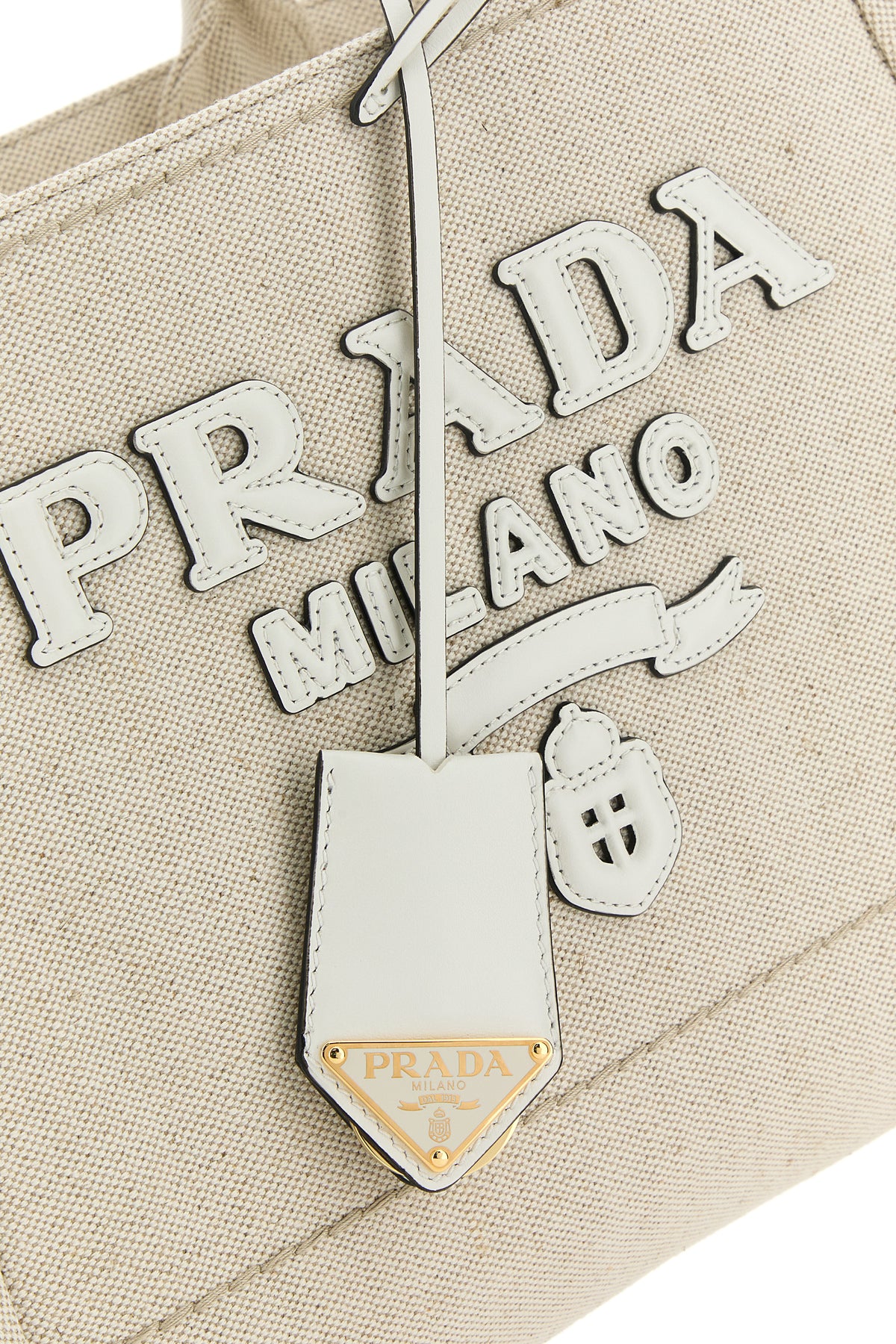 Shopping bag realized in canvas enriched by contrasting leather logoed patch at the front and detachable contrasting leather keyring accessory with iconic logoed metal triangle.