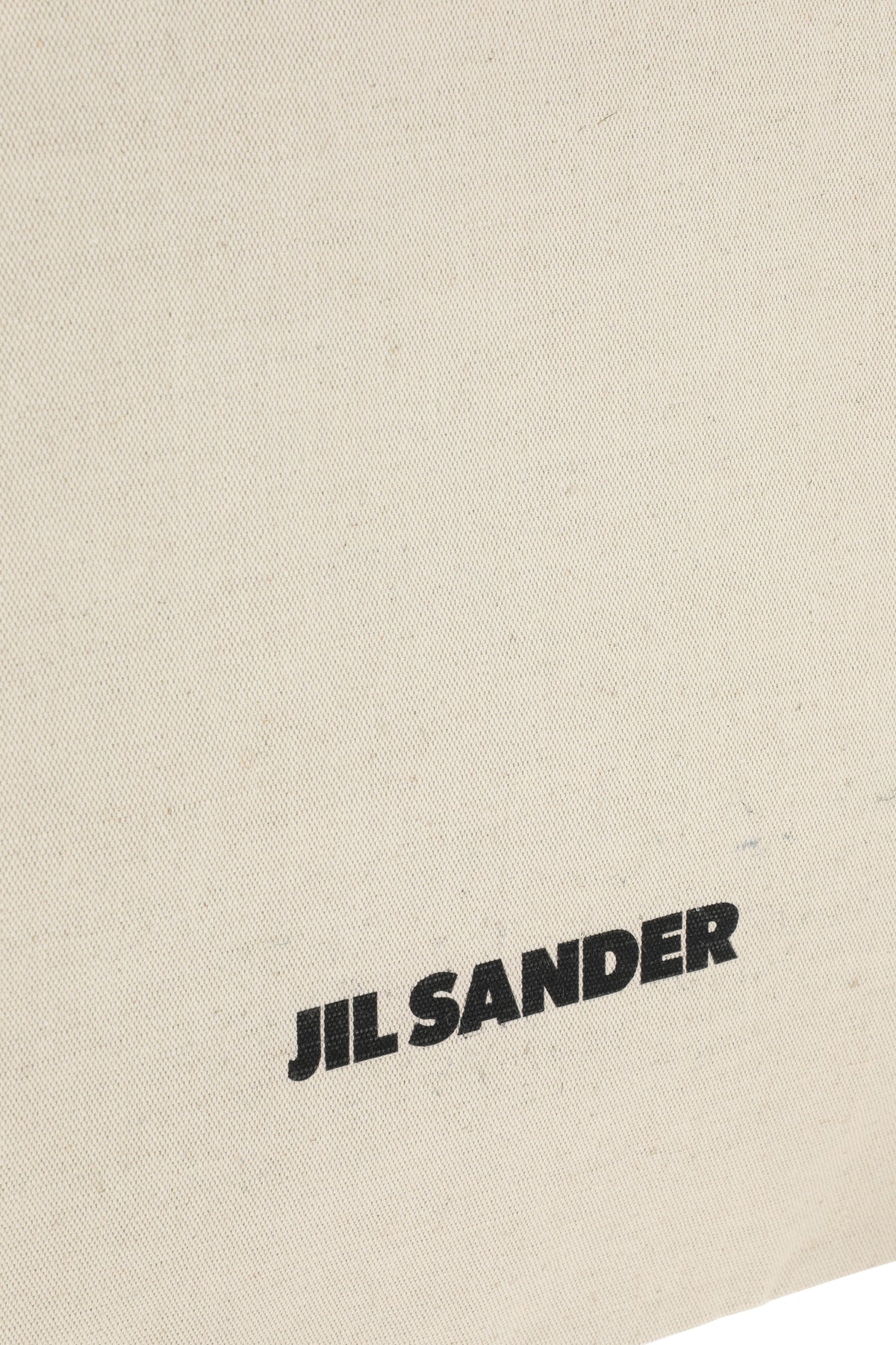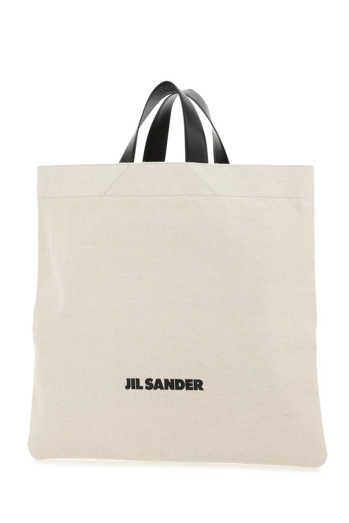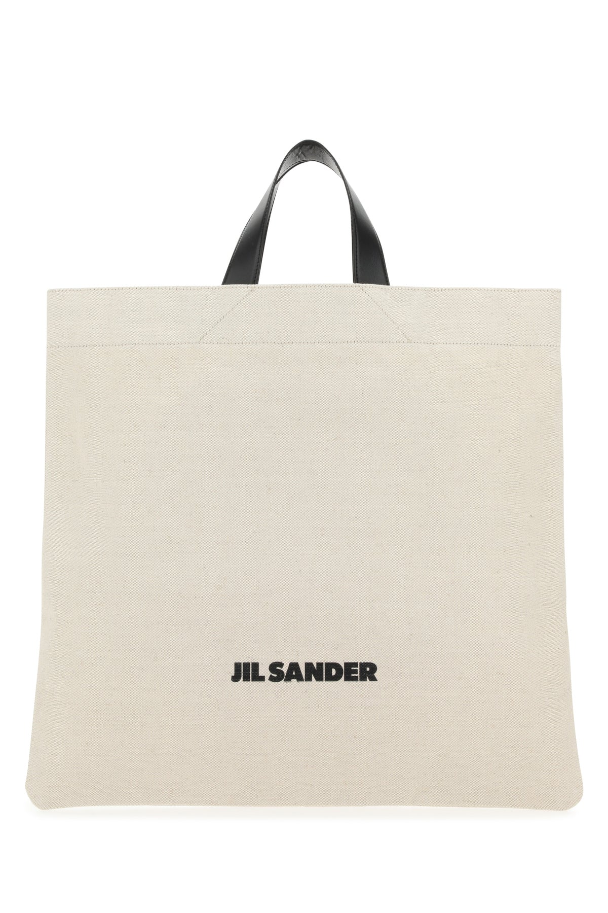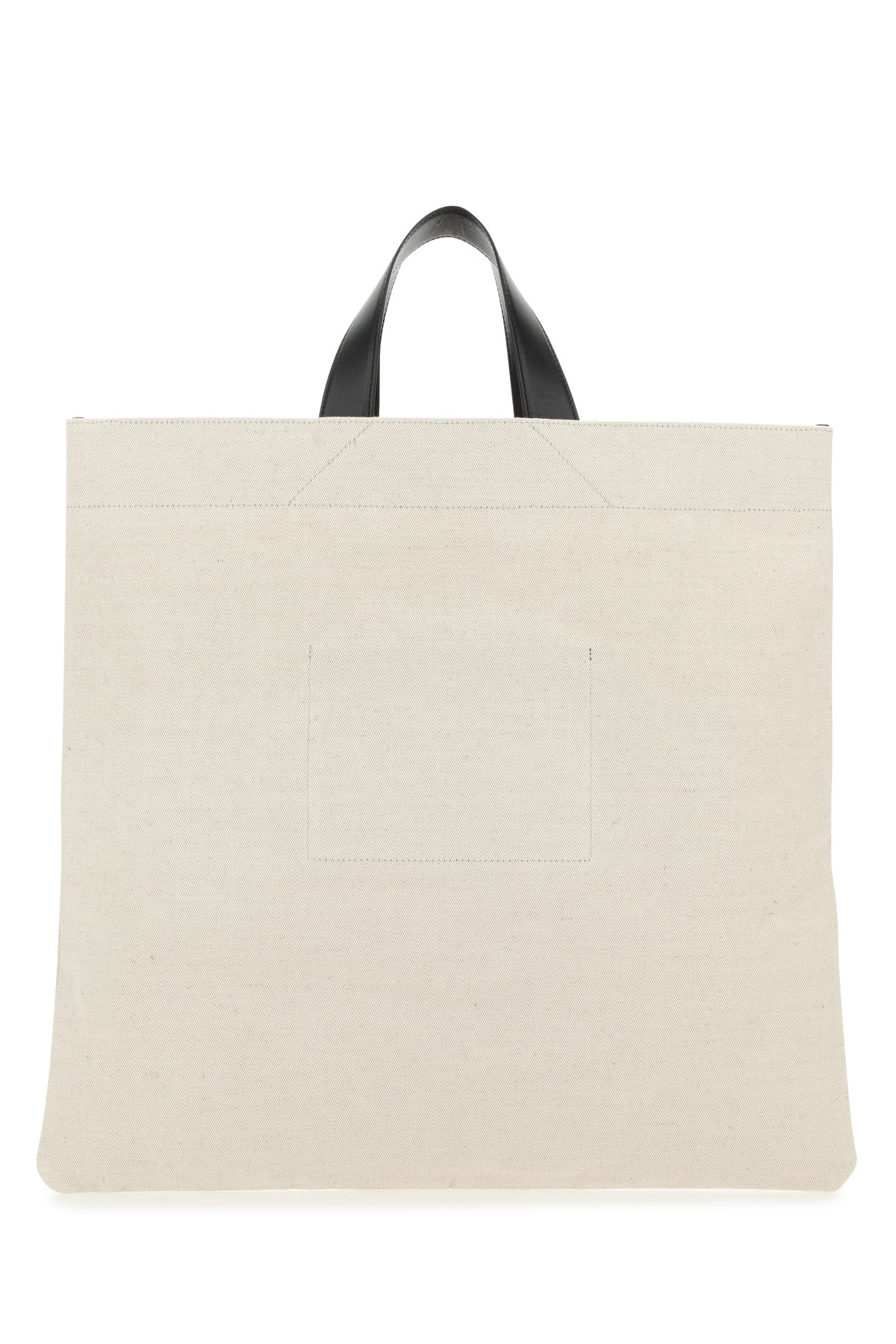 Shopping bag realized in cotton blend canvas with leather inserts characterized by contrasting printed logo at the front.