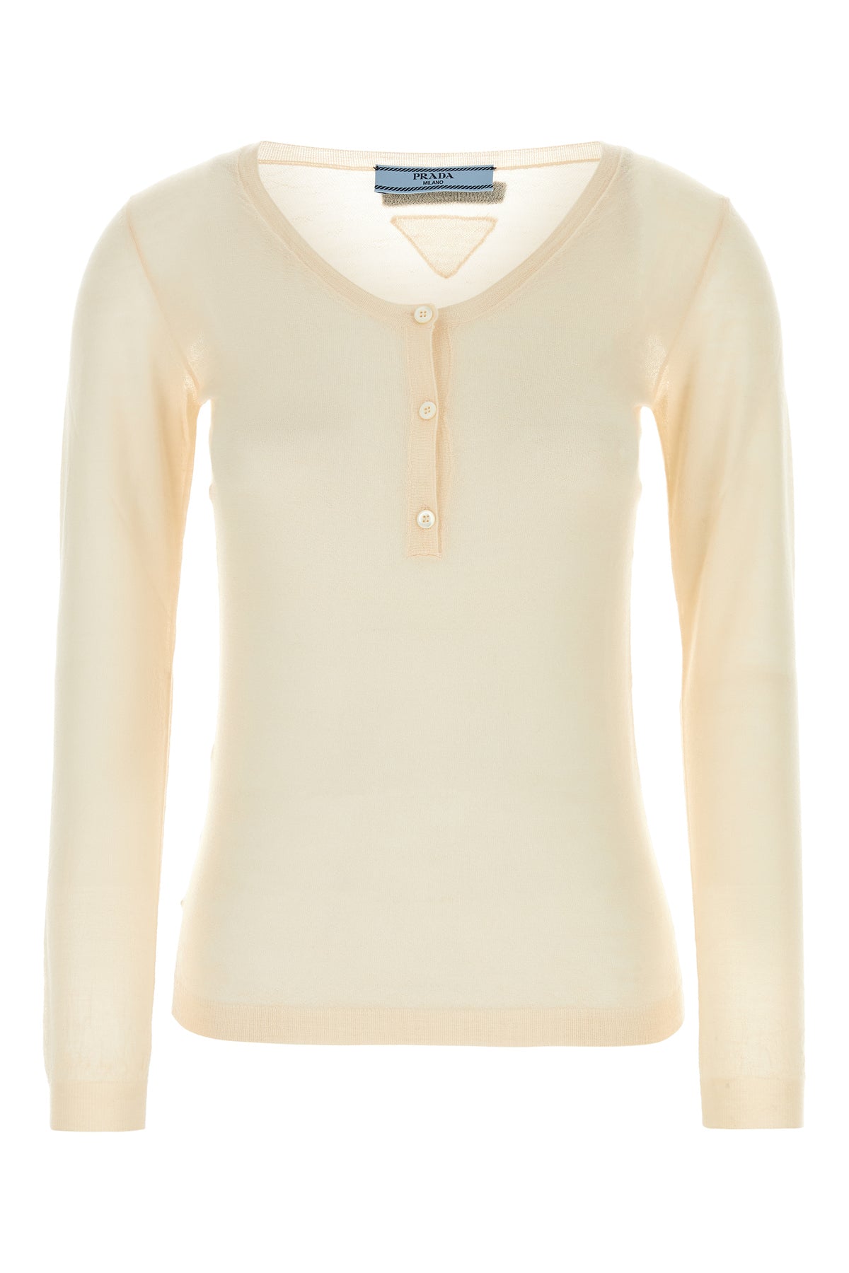 Sweater realized in cashmere and silk enriched by iconic tonal fabric triangle and logoed label at the back,
