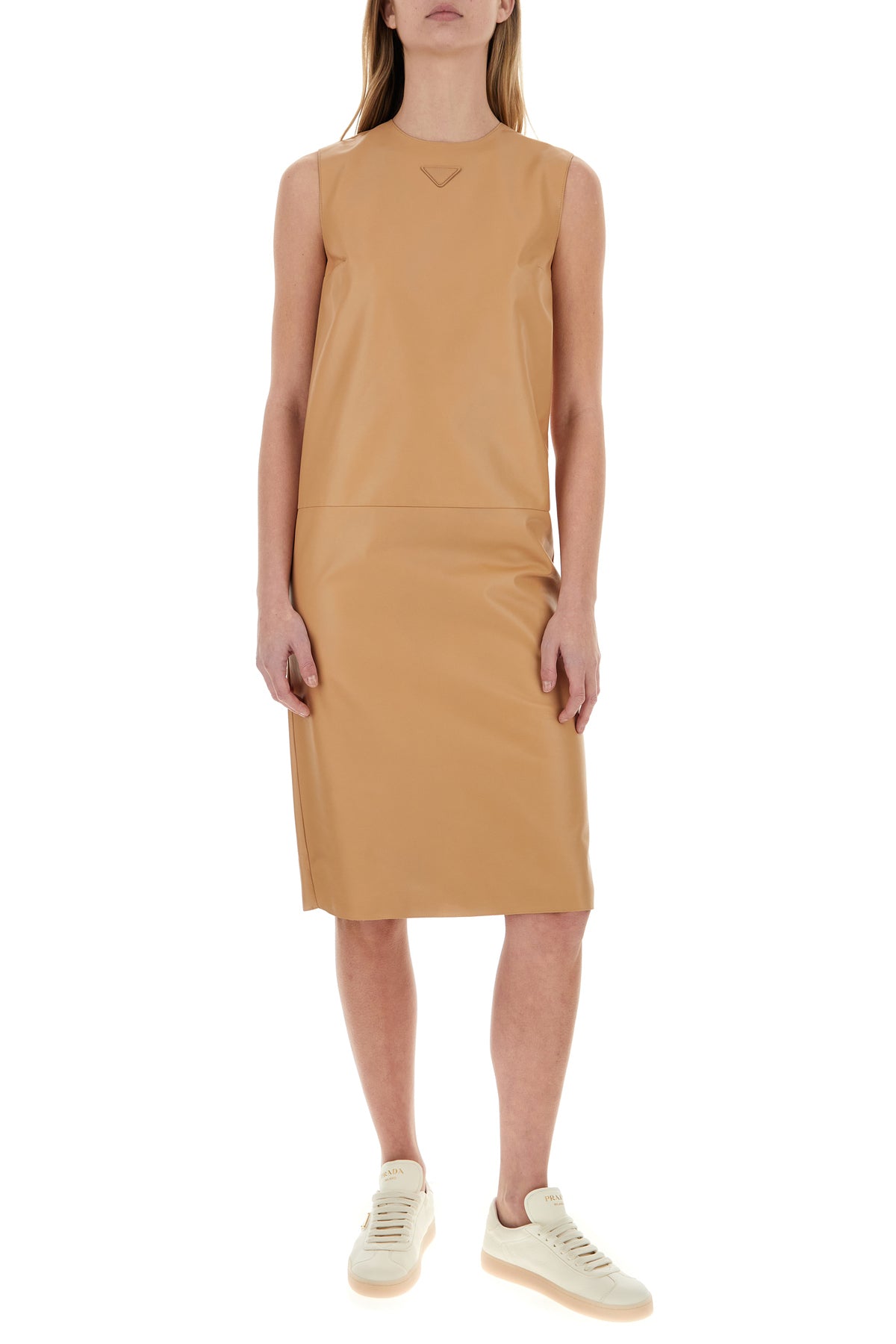 Dress realized in nappa leather enriched by iconic logoed tonal leather triangle at the front.