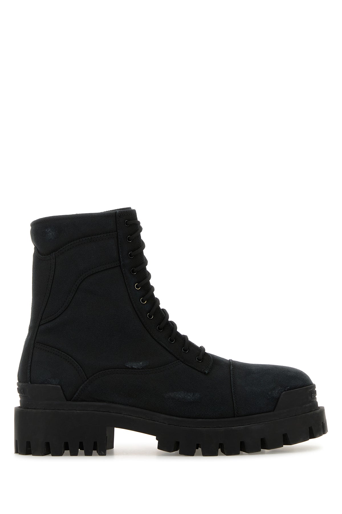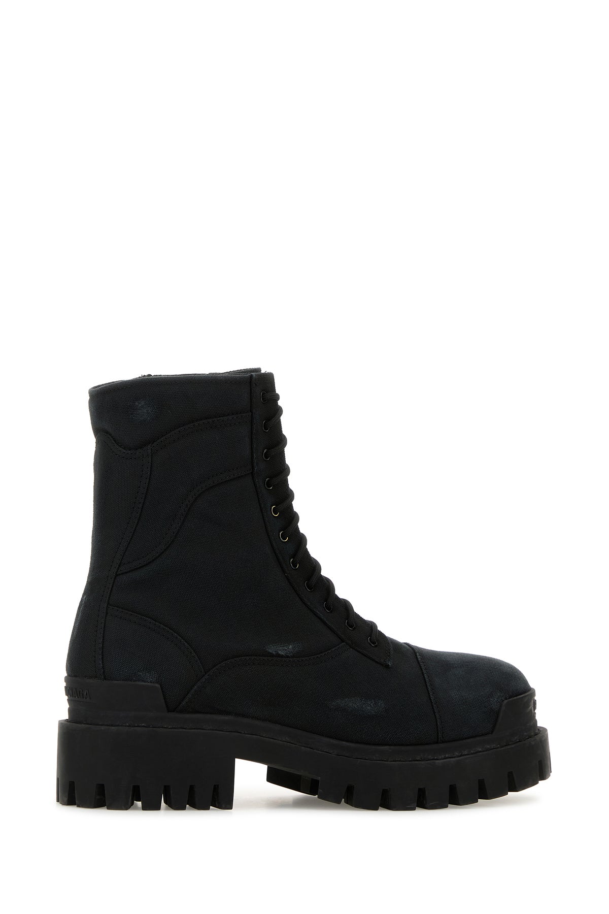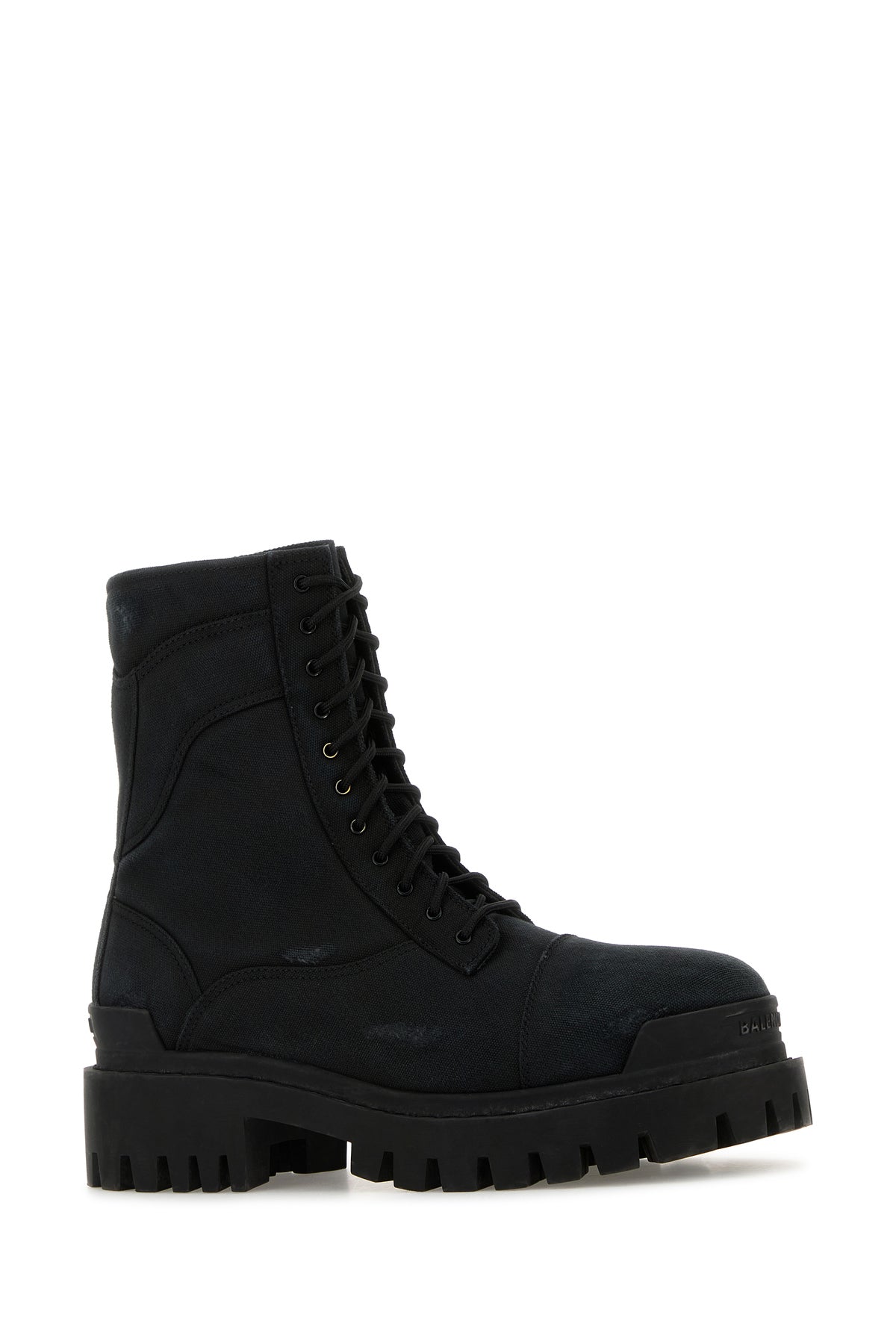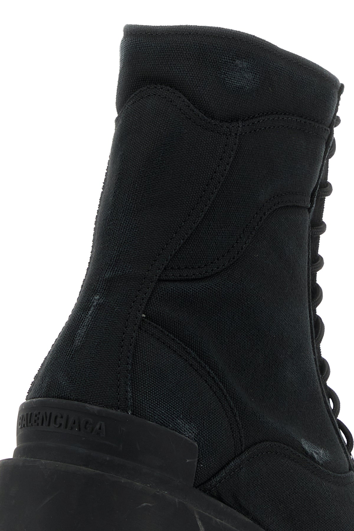 Ankle boots realized in distressed pure cotton canvas characterized by logo in relief on the round toe and on the heel.