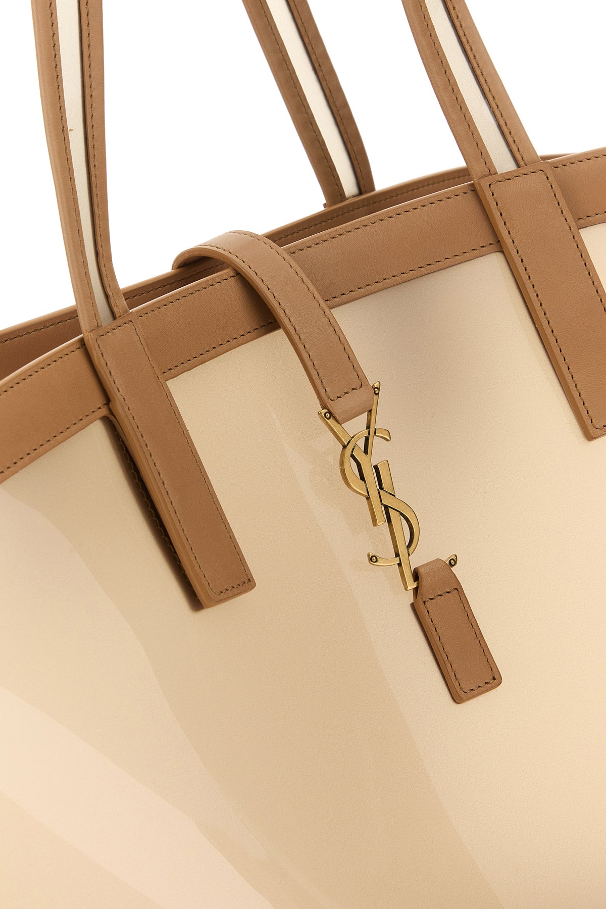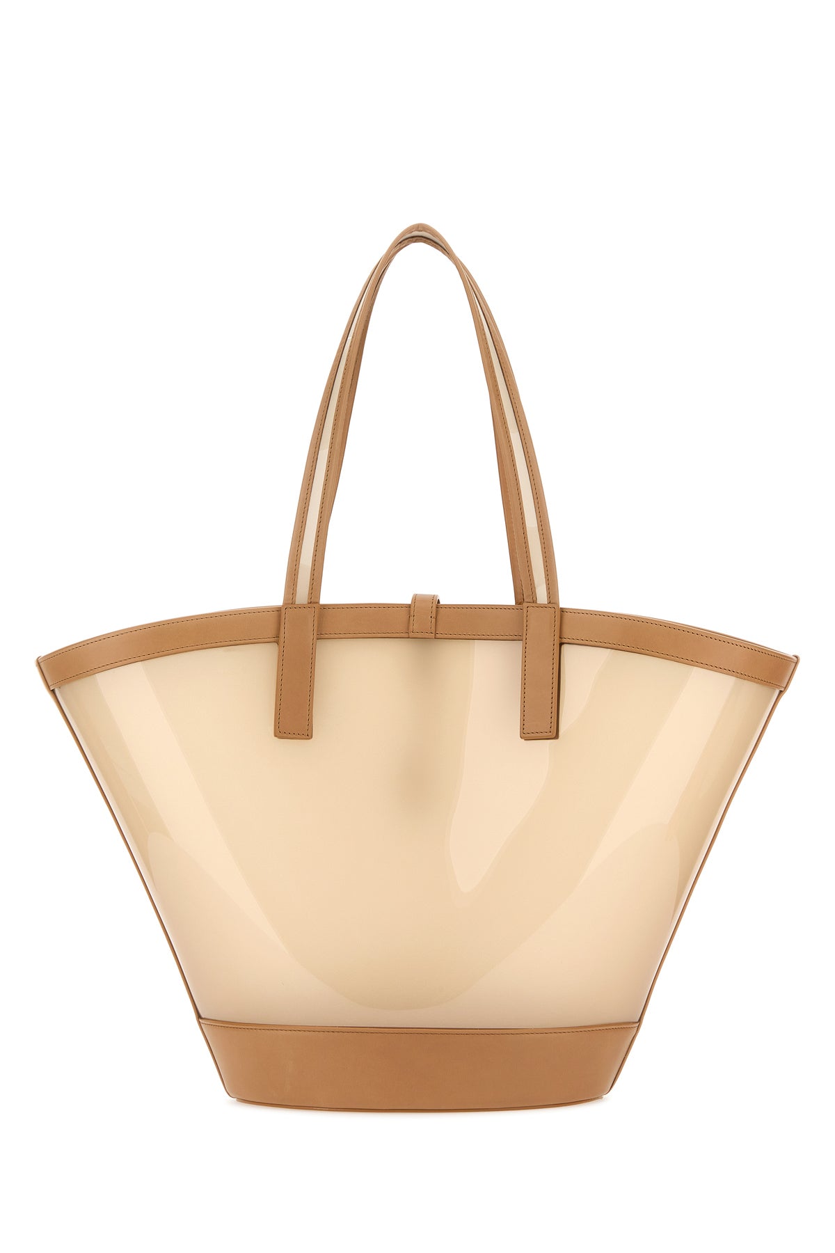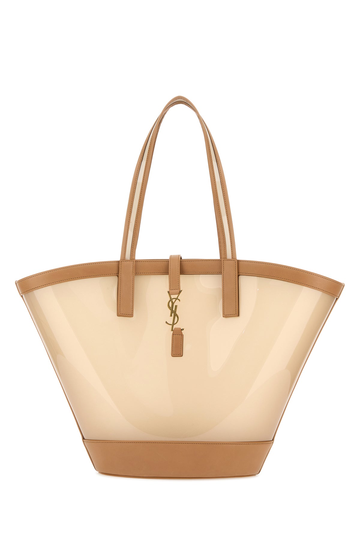 Shopping bag realized in vinyl with smooth leather inserts characterized by iconic metal Monogram detail snap-fit closure.