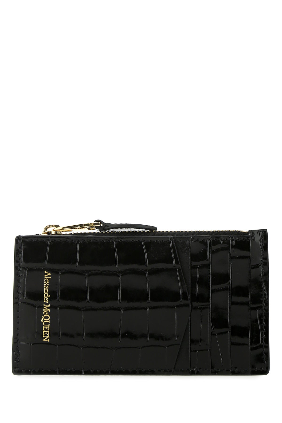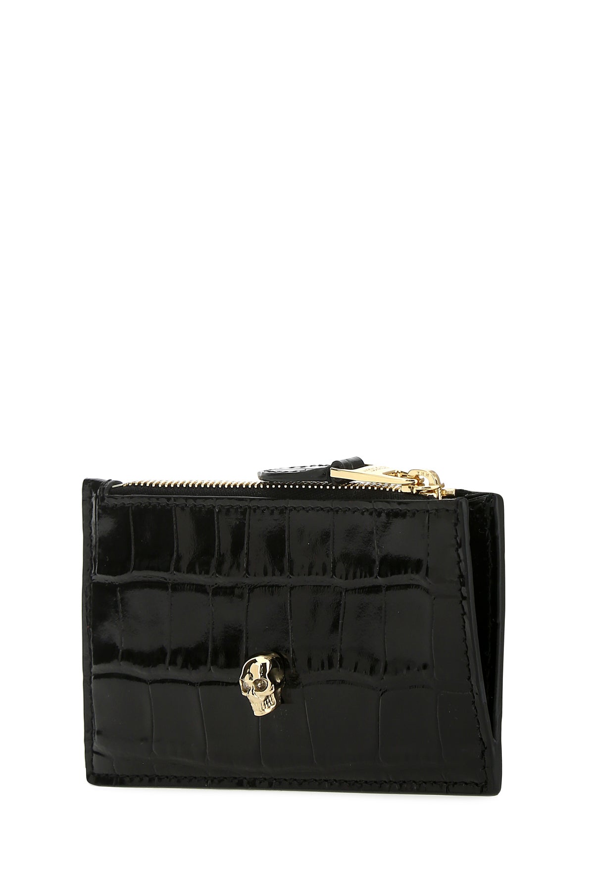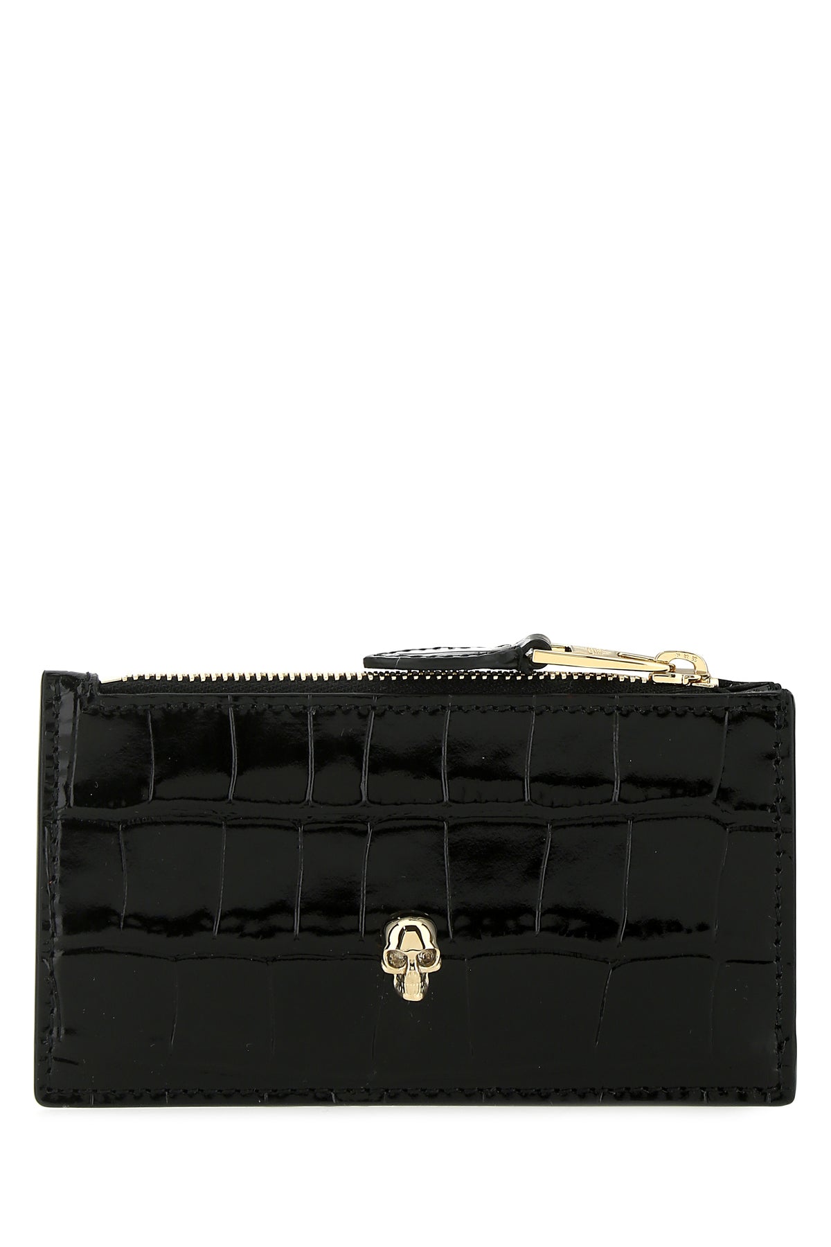 Card holder realized in patent crocodile motif embossed leather characterized by printed logo at the back enriched by metal Skull detail at the front.