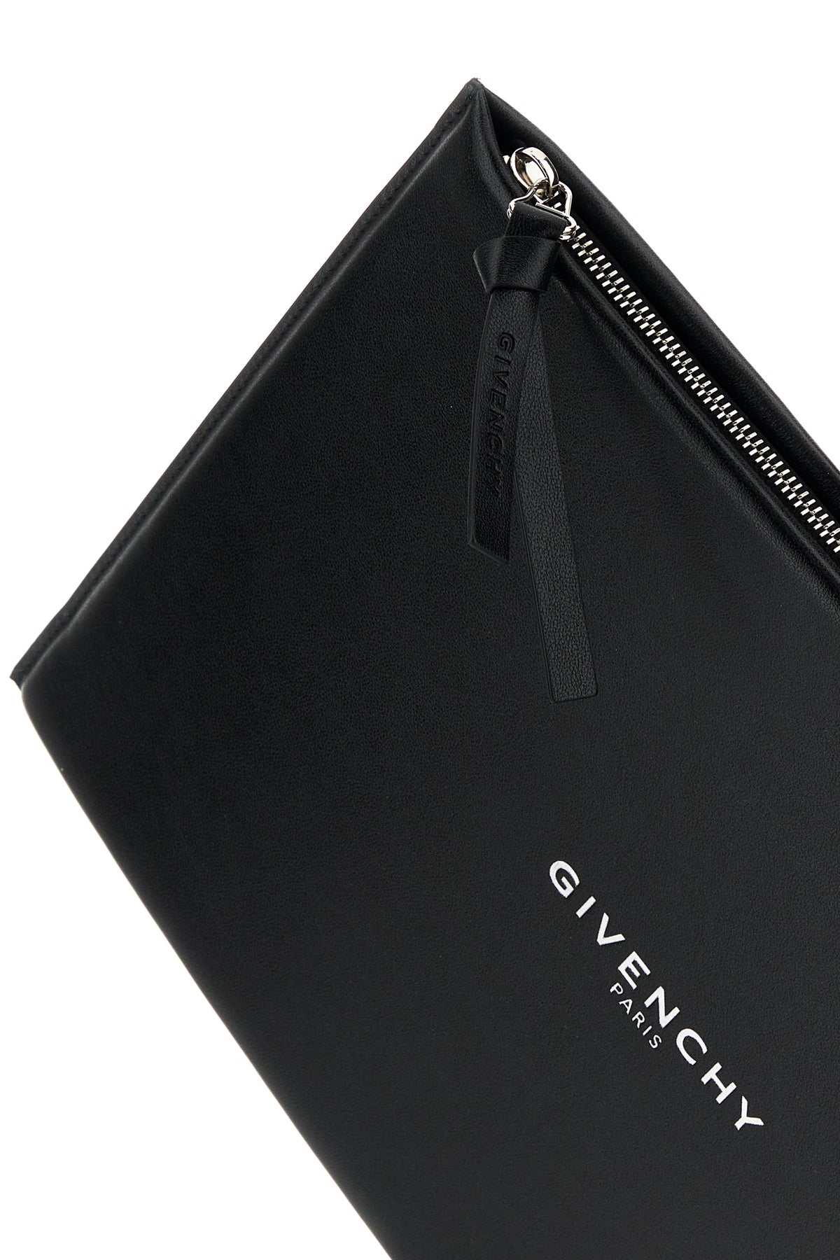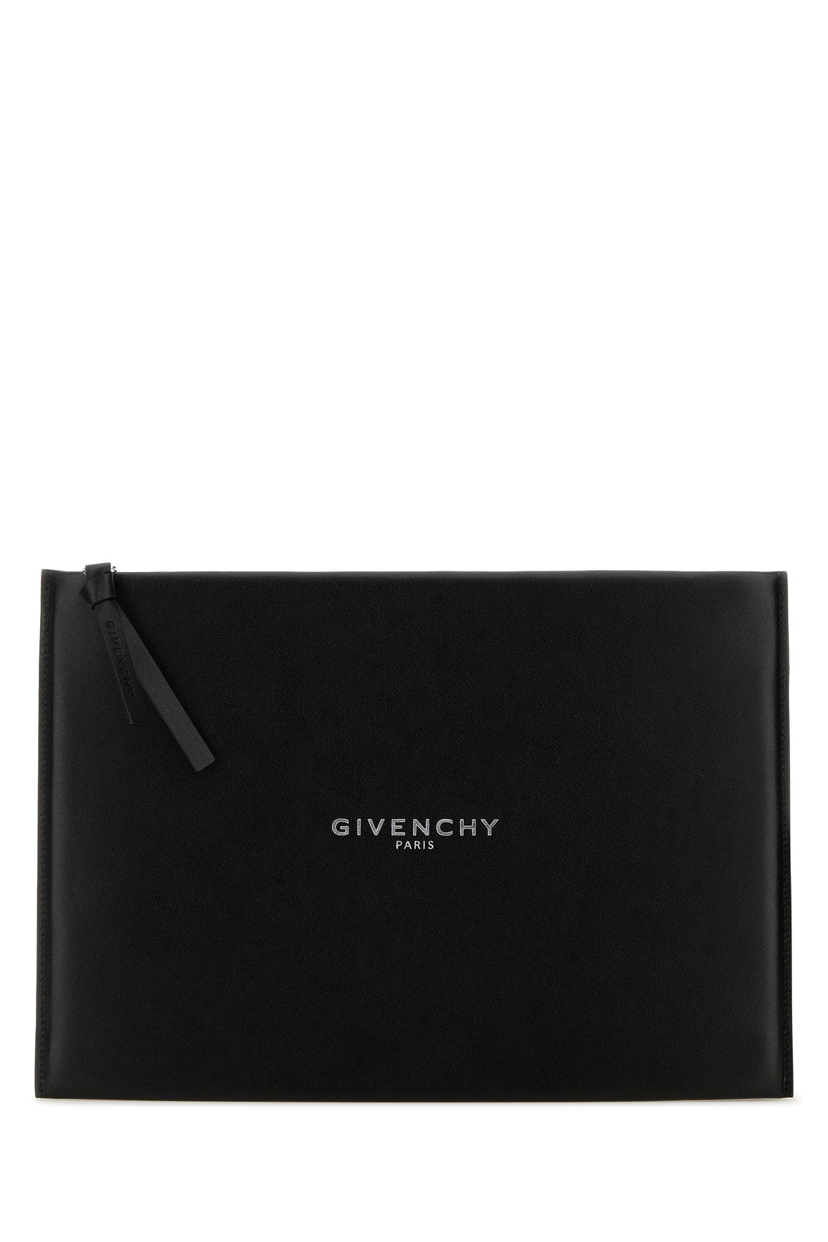 Clutch realized in calf leather characterized by laminated printed logo at the front.