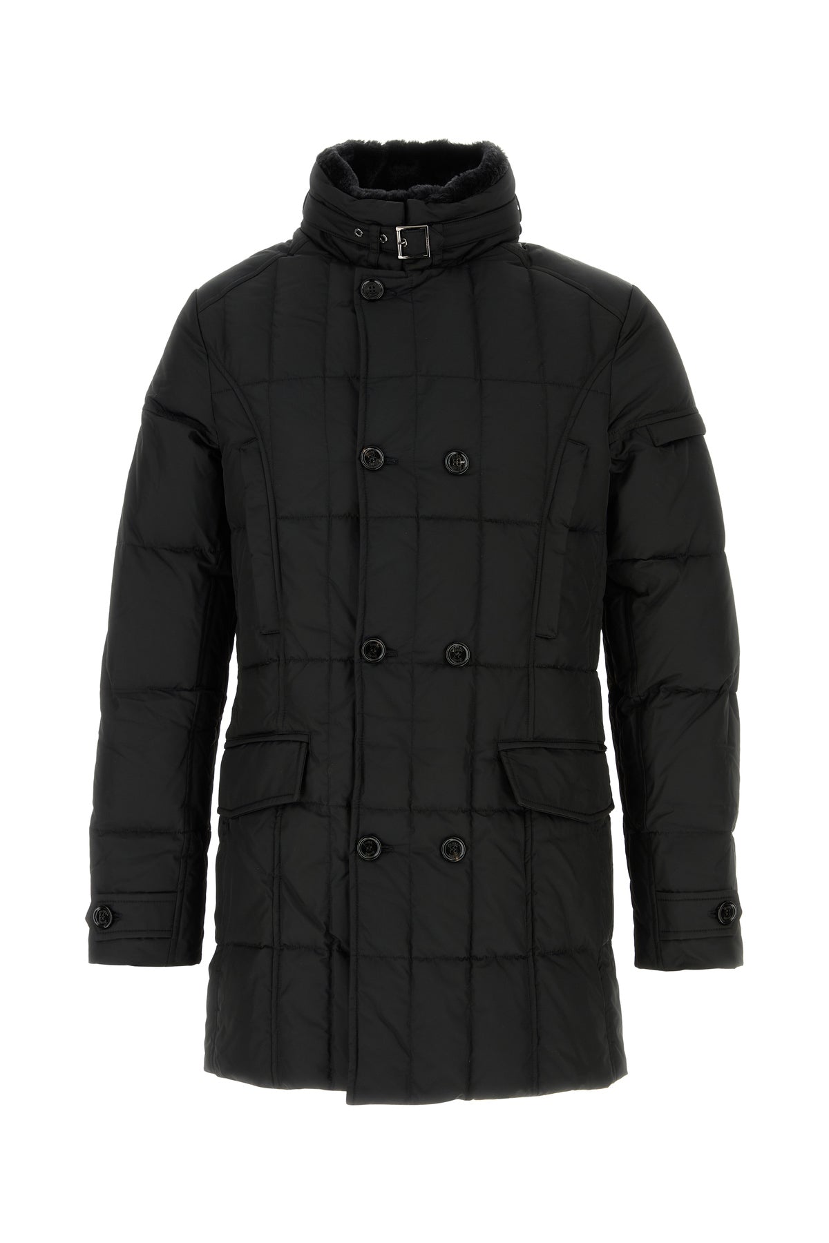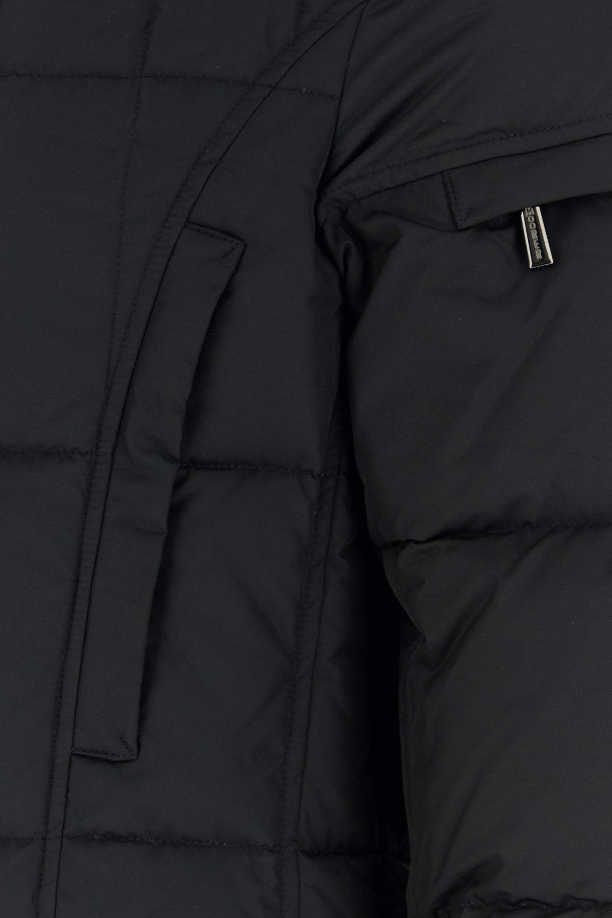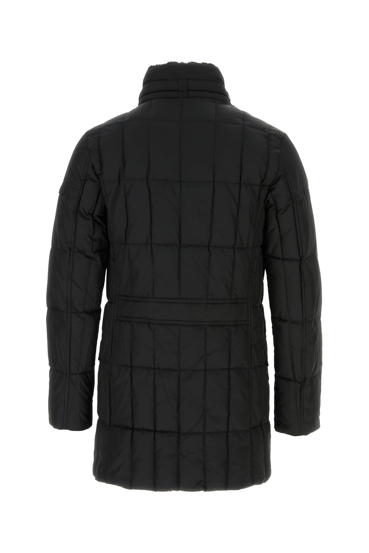 Down jacket realized in quilted polyester characterized by high collar with strap.