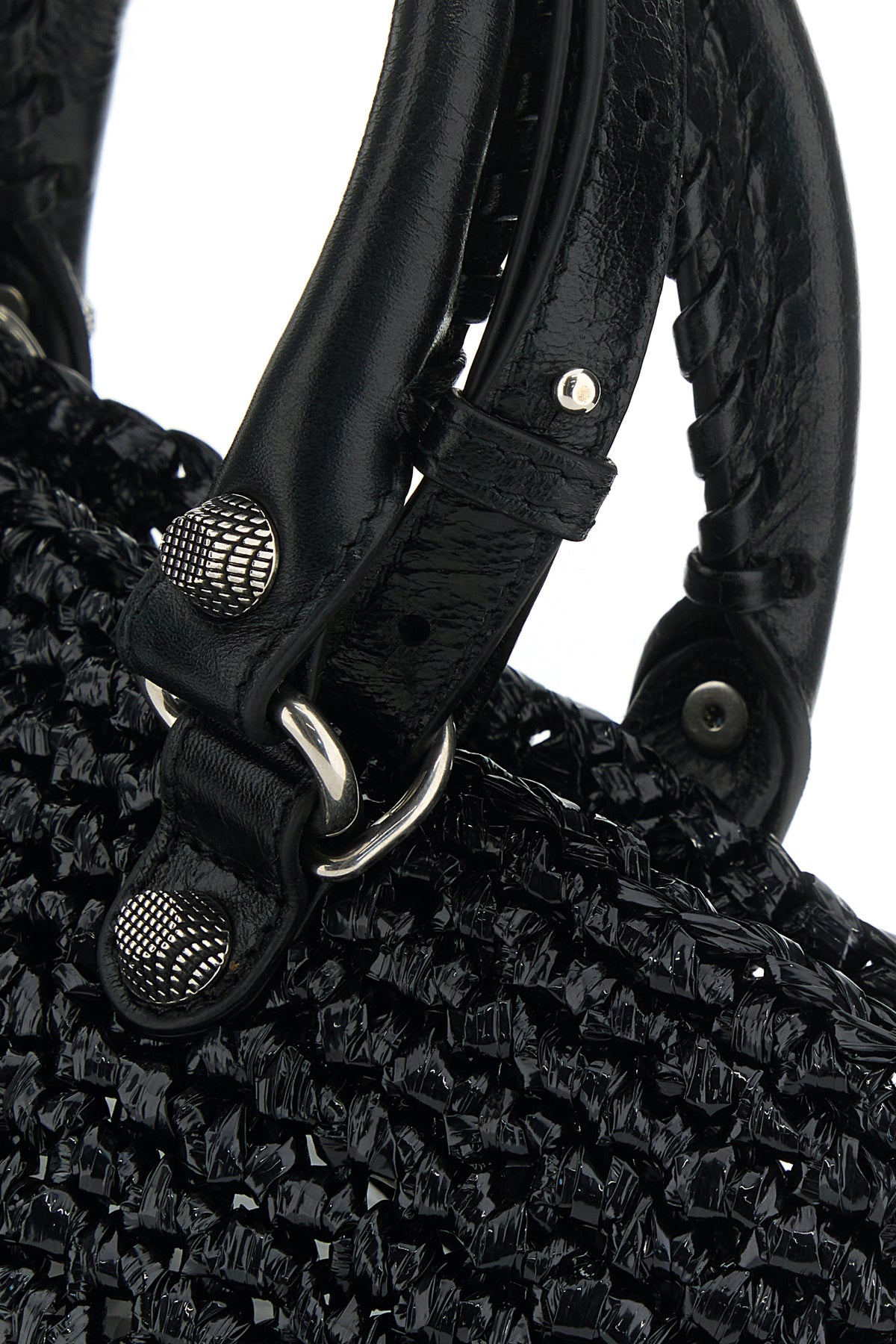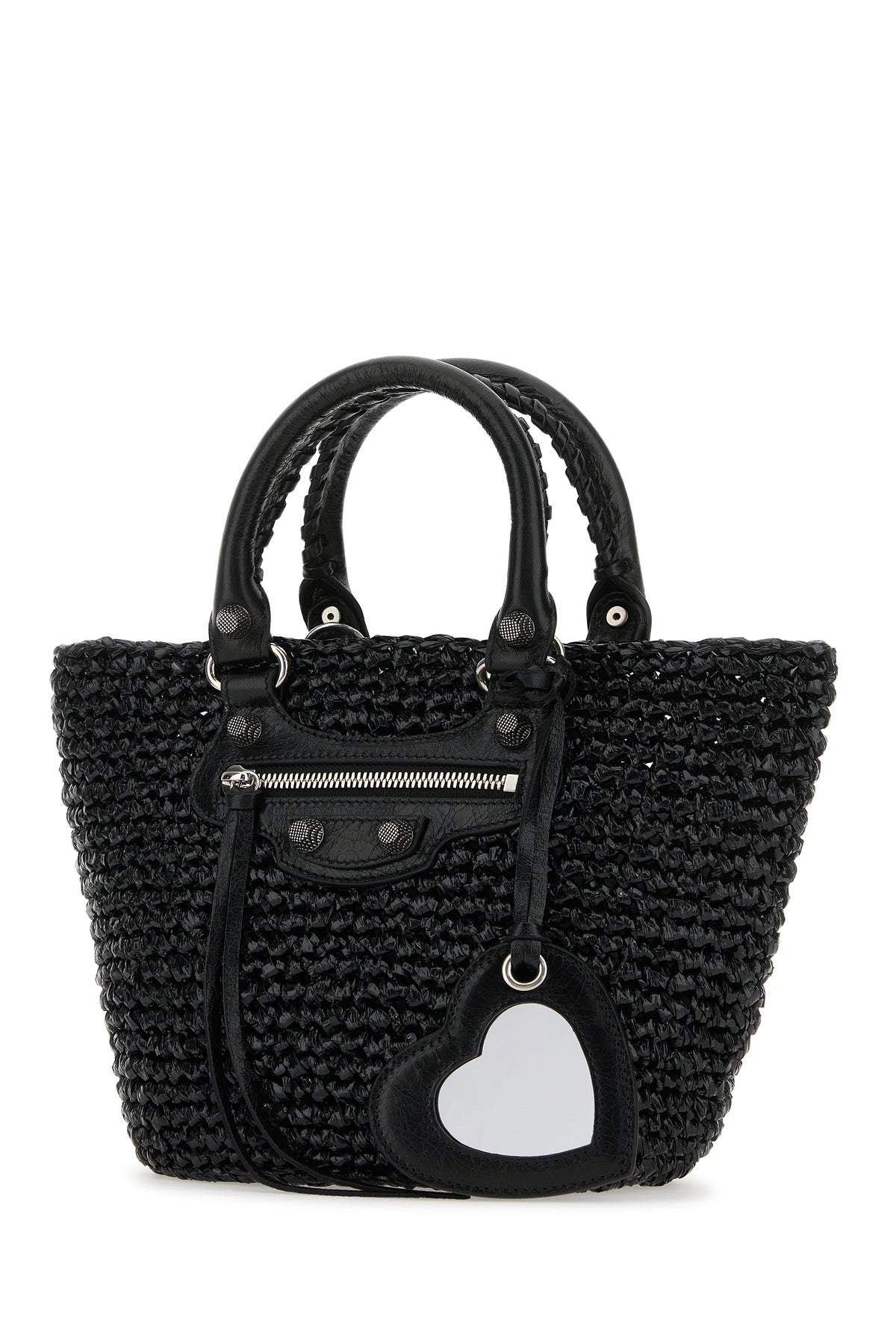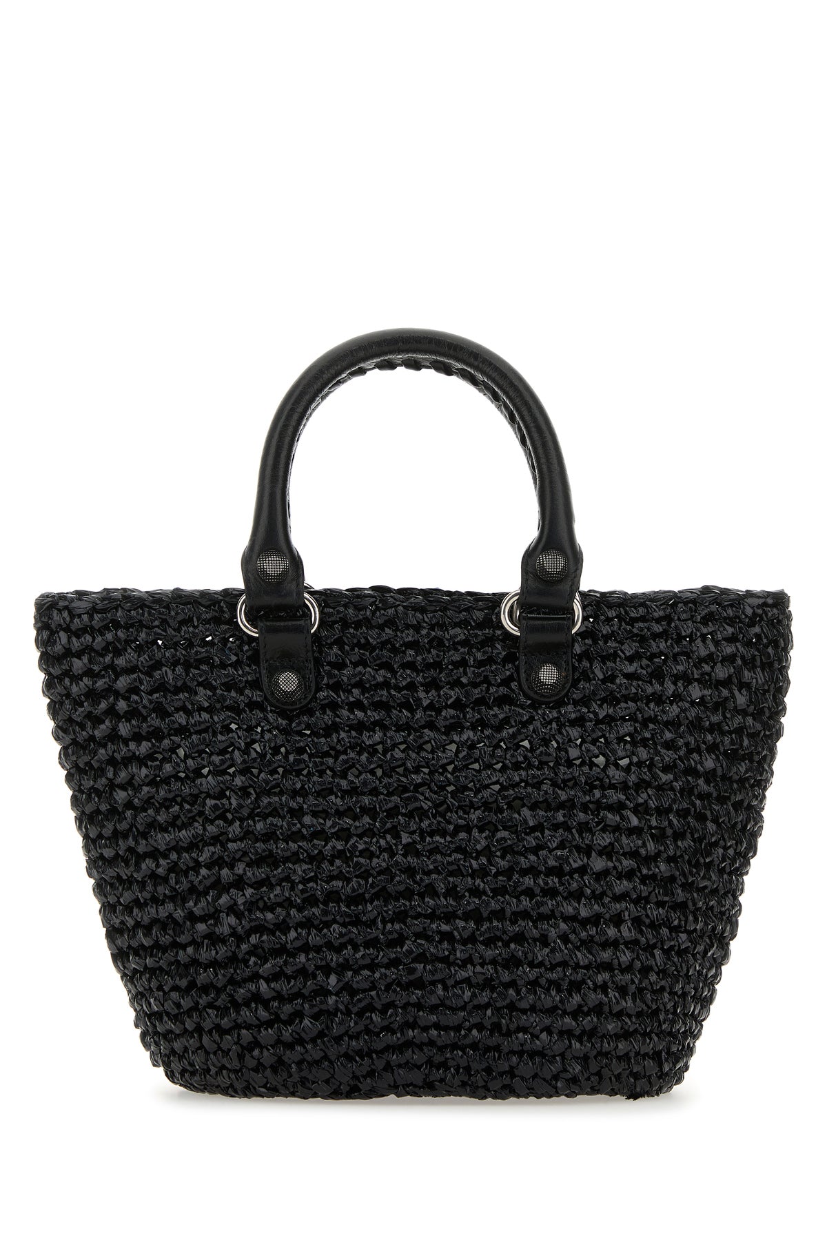 Handbag realized in raffia with tonal leather inserts enriched by decorative studs at the front and the back and detachable decorative mirror.