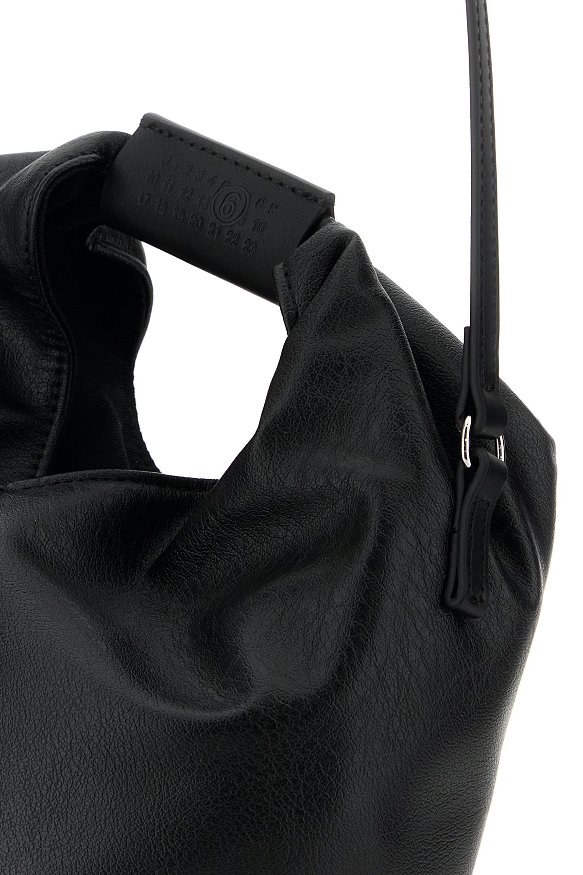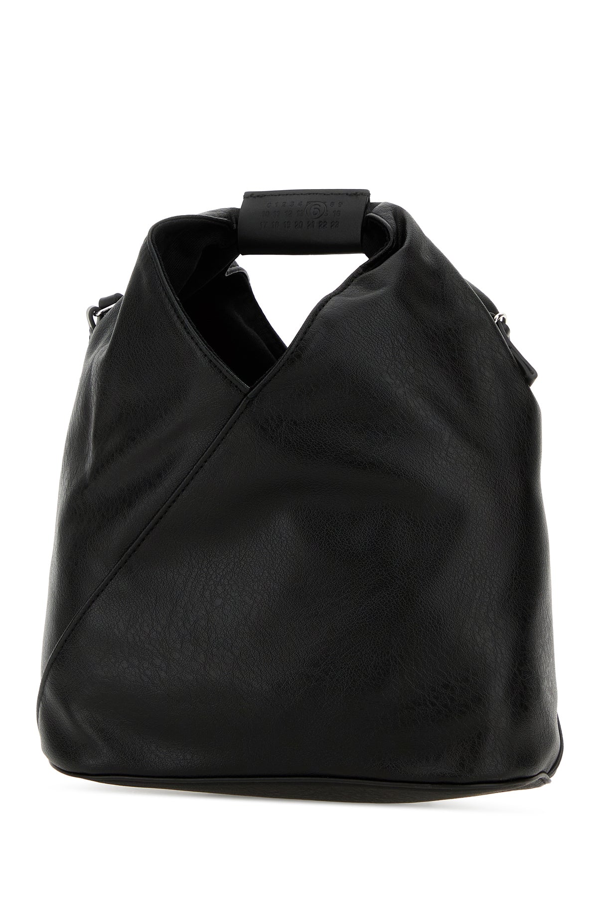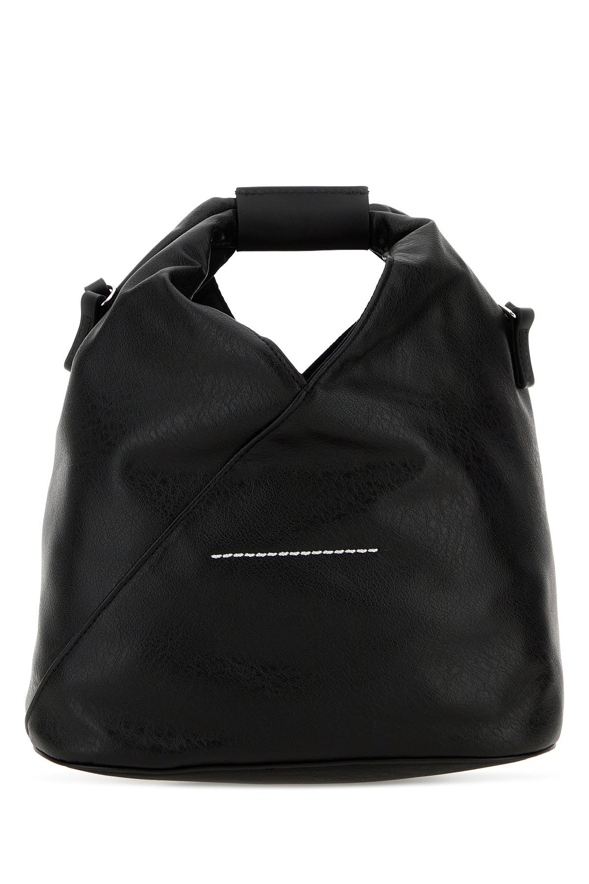 Handbag realized in synthetic leather characterized by embossed logo on the handle and contrasting stitching at the back.