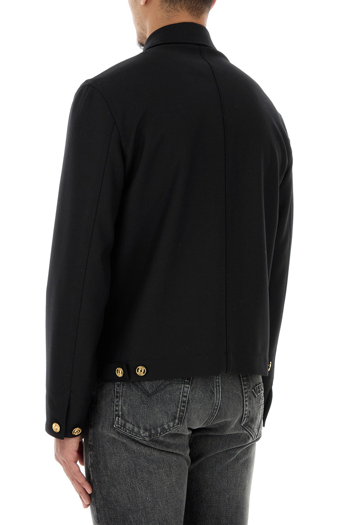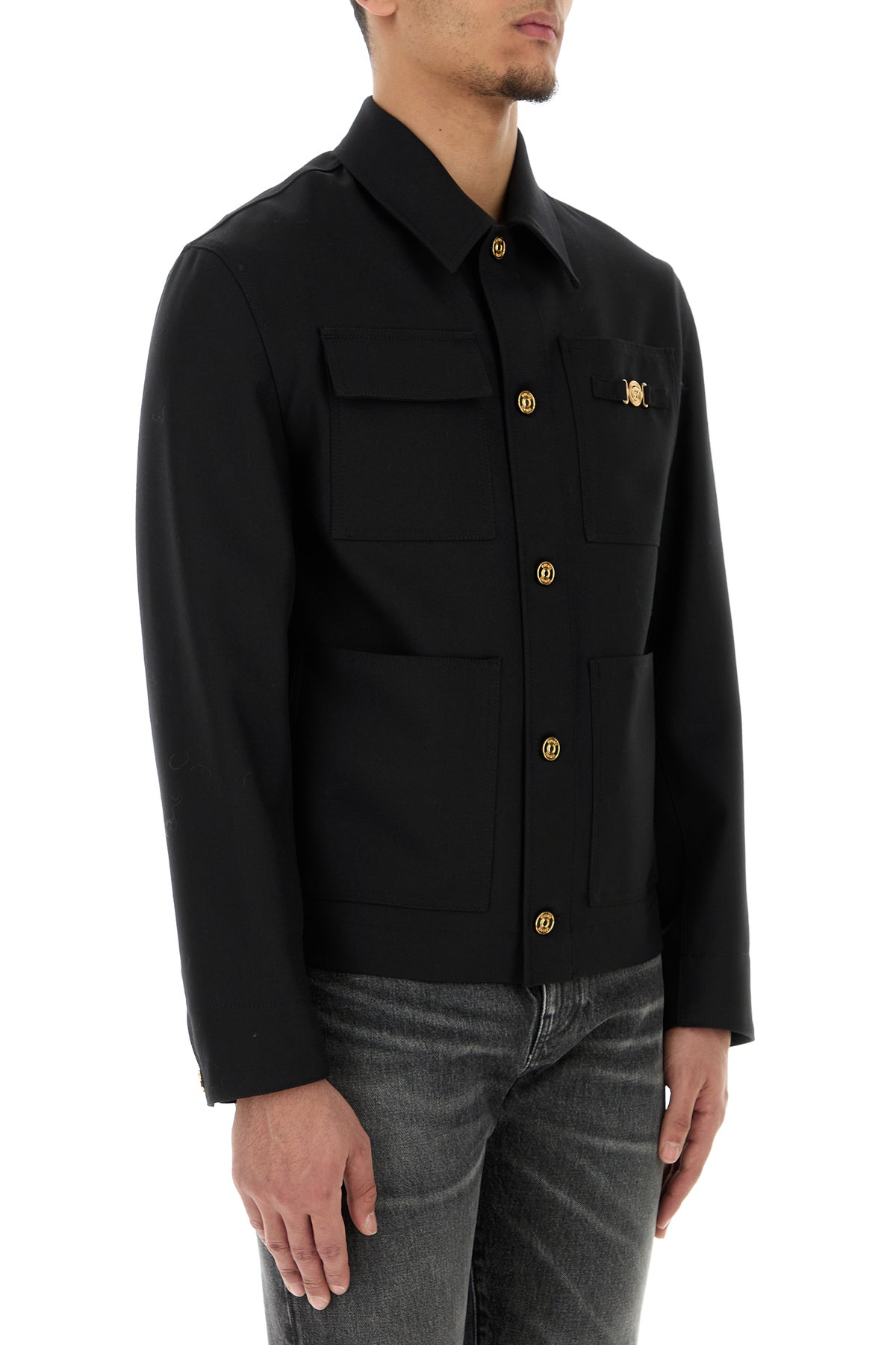 Jacket realized in pure virgin wool enriched by Medusa metal detail on the chest.
