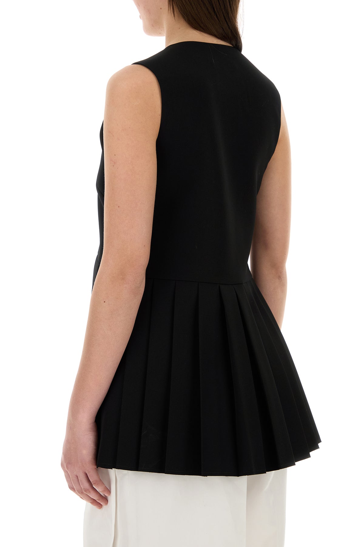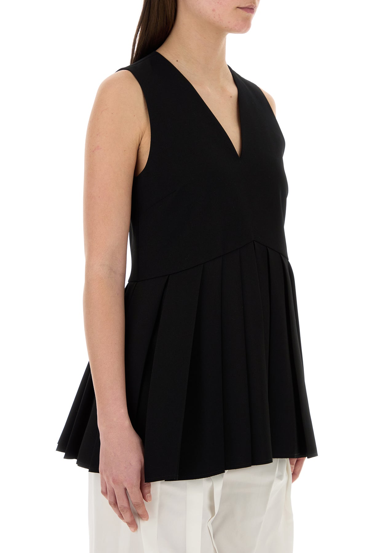 Top realized in pure virgin wool characterized by pleats on the hemline.