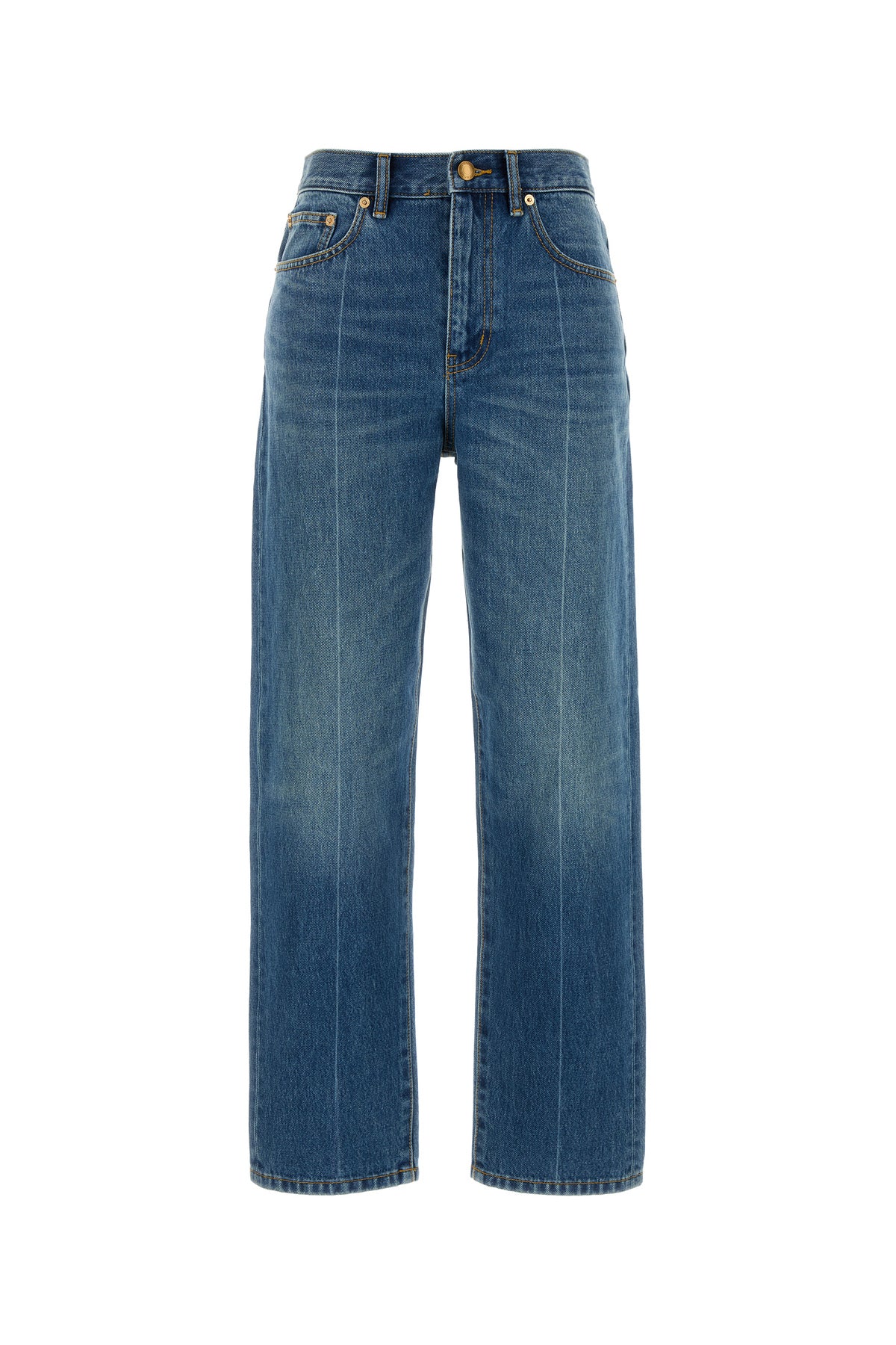 Regular jeans realized in stonewashed pure cotton denim characterized by logo in relief at the back.