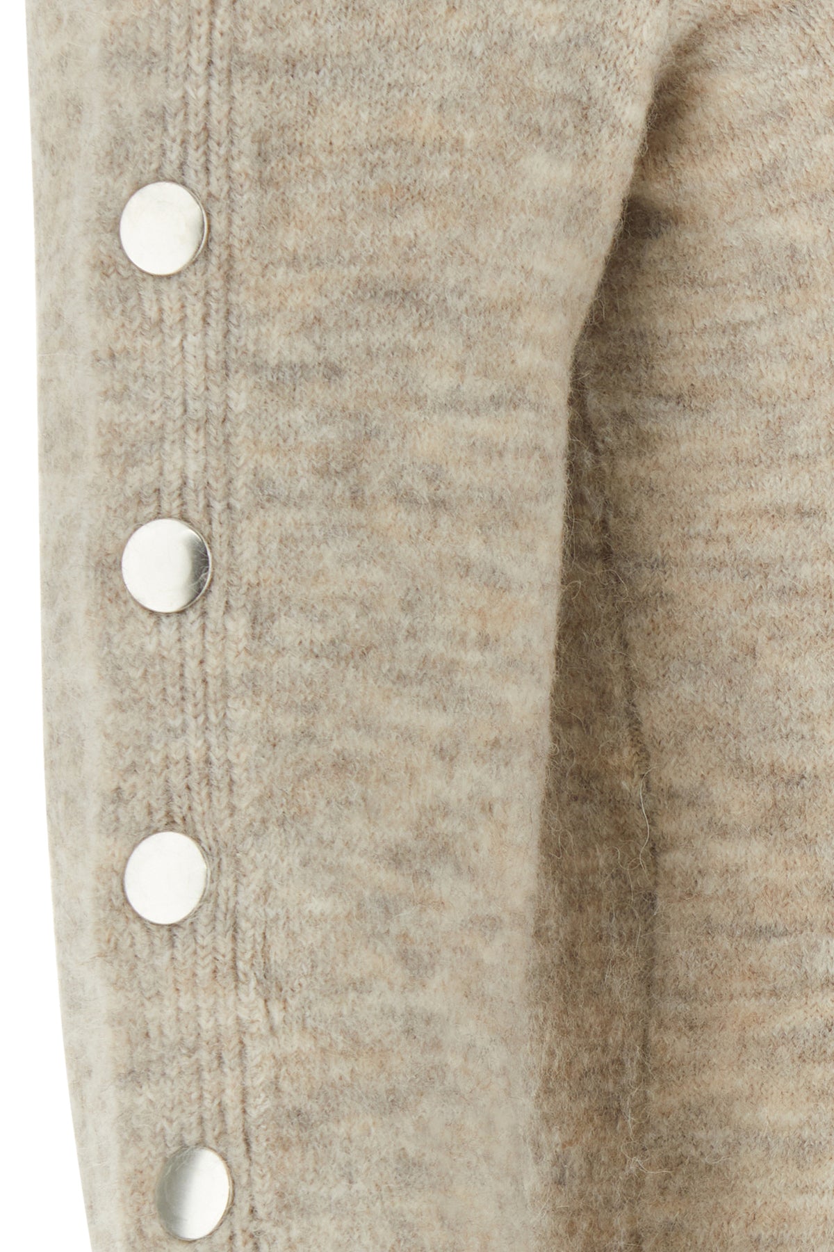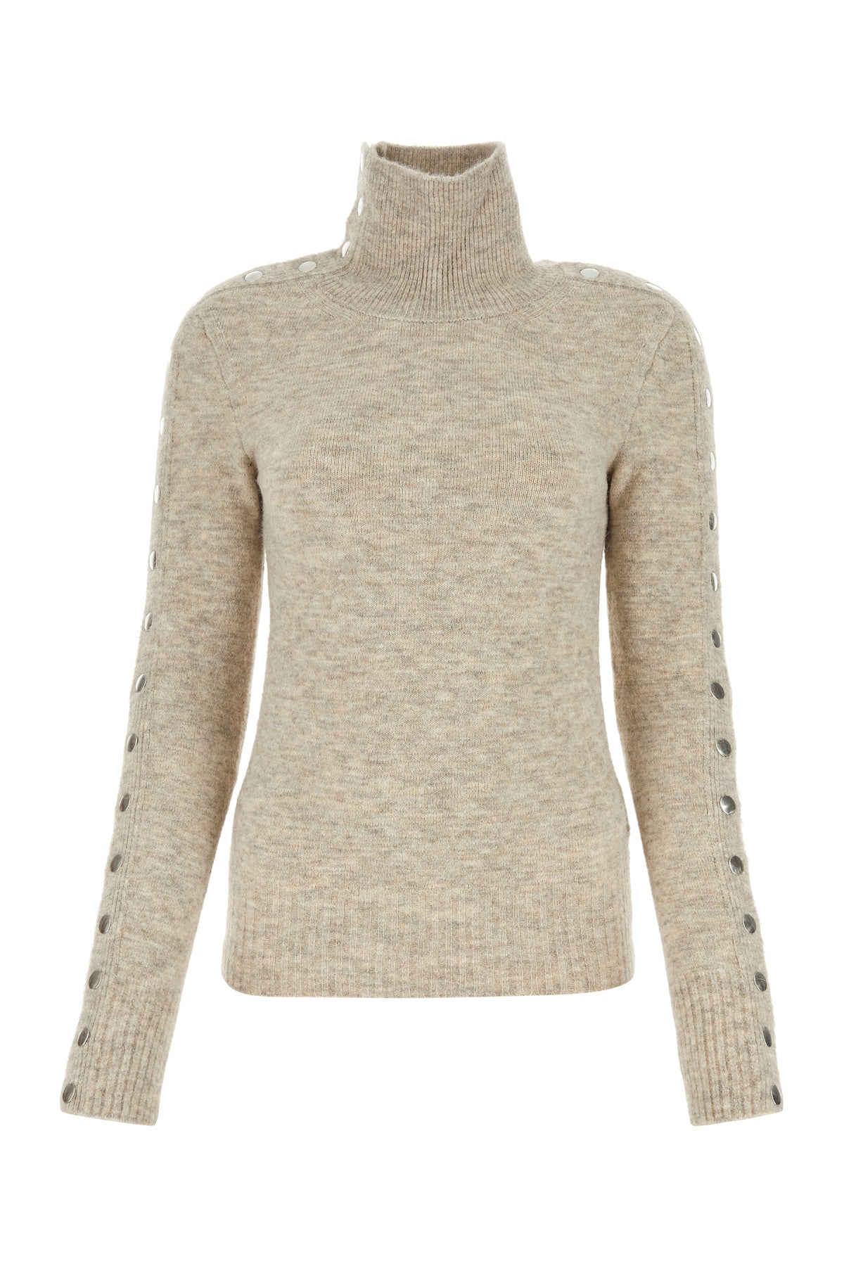 Sweater realized in nylon blend characterized by snap buttons closure on the sleeves.